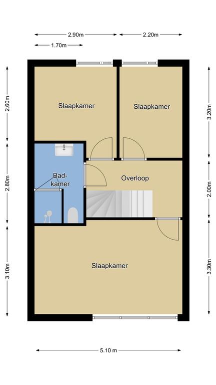 Via een rechte trapopgang komen we op de 1e verdieping terecht. De overloop schakelt hier 3 slaapkamers en de badkamer aan elkaar. De hoofdslaapkamer is over de volle breedte van de woning gelegen waardoor je hier veel ruimte hebt voor een 2-persoonsbed en een grote linnenkast. Ook hier zijn rolluiken geplaatst waardoor alle 3 de kamers volledig te verduisteren zijn. Die zijn, m.u.v. het rolluik op een van de kinderkamers, elektrisch bedienbaar. Uiteraard is ook op deze woonlaag airconditioning aanwezig waarmee het niet alleen aangenaam koel blijft maar ook verwarmd kan worden. De overloop en de hoofdslaapkamer hebben recent een nieuwe laminaatvloer gekregen.