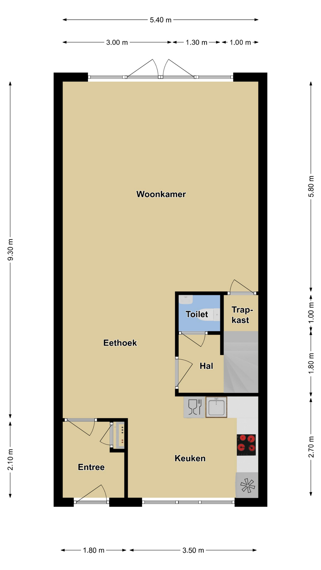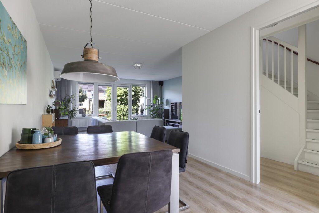 De woonkamer is aan de achterzijde gelegen en daarmee tuingericht. Door de aanbouw voelt de woonkamer lekker ruim aan waarbij dubbele tuindeuren direct toegang geven tot het buitenterras. In combinatie met de grote zijramen is er een aangename lichtinval. Door de aantrekkelijke breedtemaat (5,4m inpandig) en de aanbouw hoef je niet te twijfelen of die grote hoekbank, die je altijd al wilde hebben, wel past. In de overgang naar de keuken kun je vervolgens een eettafel kwijt. Het afwerkingsniveau is neutraal en verzorgd te noemen. Op de vloer ligt een brede plank ‘houtnerf’ PVC-vloer en op de wanden is een strak glasvliesbehang aangebracht die je eenvoudig in alle wenselijke kleuren kunt sausen.