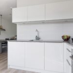 De keuken vinden we aan de voorzijde van de woning alwaar een gezellige keukenhoek is gecreëerd. Er is gekozen voor een ruime hoekopstelling waarbij goed is nagedacht over de details. Er is bijvoorbeeld gekozen voor een natuurstenen werkblad van composiet waarbij de gootsteen onder het blad is bevestigd (in plaats van bovenaf). In de hoek is een luxe en kostbare Le-man slede (pannenkast) te vinden die je voor het grootste gedeelte uit de kast laat glijden. Verder bestaat de inbouwapparatuur uit een combi-oven/magnetron, een 4-pits inductie kookplaat met afzuigschouw, een vaatwasser en een koel/vriescombi. De fronten zijn in hoogglans uitgevoerd waarbij de grepen voor een strakke uitstraling zorgen. Om het af te maken zijn er onder de bovenkastjes LED-spots aangebracht. En niet te vergeten het uitzicht aan de voorzijde: Géén directe overburen of rijwoningen, maar groen en een statige dorpsvilla.
