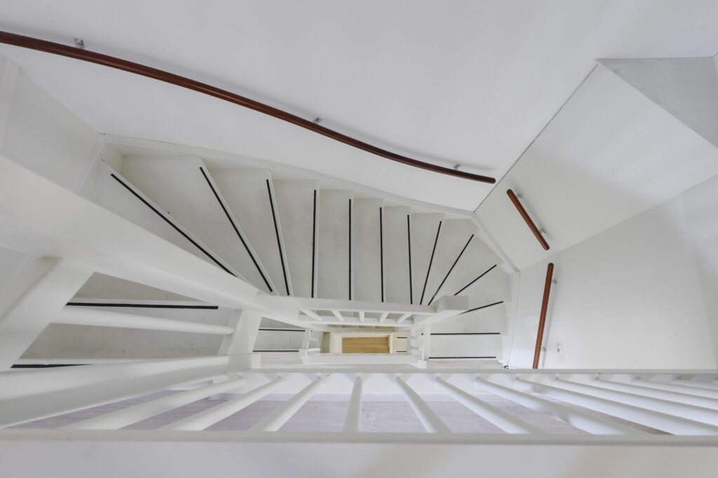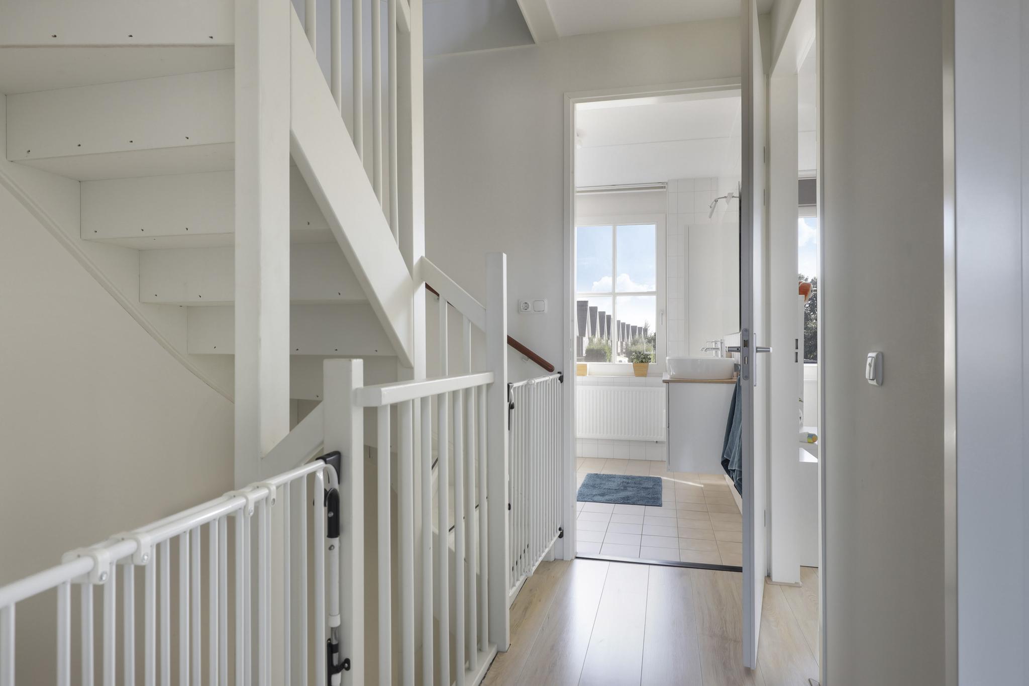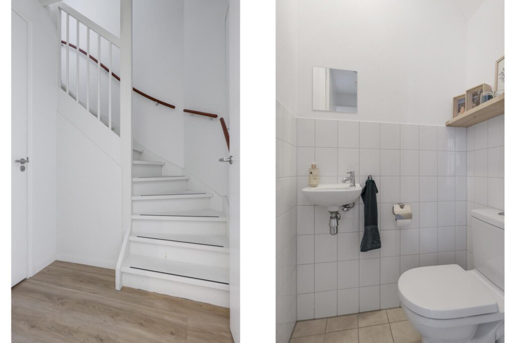 Niet via de hal/entree bij de voordeur maar verrassend via een 2e hal (met toilet) bereiken we de 1e verdieping. Hier schakelt de overloop met doorlopende laminaatvloer 3 slaapkamers en de badkamer met elkaar. De slaapkamers zijn respectievelijk 15m2, 12m2 en 8m2 groot en hebben allemaal rechte muren waardoor ze praktisch en optimaal in te richten zijn. Hoge plafonds (en deuren) zorgen voor een ruimtelijk gevoel, evenals de raampartijen met roedeverdelingen. De draai/kiepramen zijn voorzien van inzethorren waardoor insecten geen kans krijgen. En ook hier zijn de wanden strak met glasvliesbehang bekleed (alsof het is gestuct) waardoor je de wanden eenvoudig van de gewenste kleur kunt voorzien.