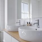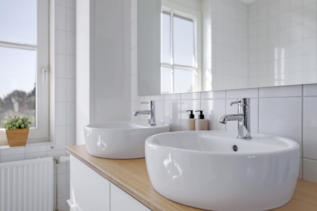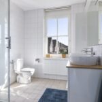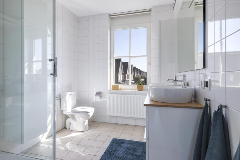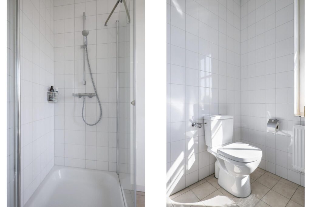 De badkamer is niet overdreven luxe aangekleed maar degelijk en neutraal afgewerkt. De ruimte is ingedeeld met een comfortabele douchecel, een 2-persoons wastafelmeubel en een 2e toilet. Het brede wastafelmeubel met ladekorven heeft een speels accent door de 2 grote waskommen die op het houten blad zijn geplaatst. De grote, brede spiegel met verlichting die boven het meubel is geplaatst, blijft achter evenals de 2 grote kolomkasten tegenover en naast het wasmeubel. Aan opbergmogelijkheden voor toiletspullen is er in ieder geval geen gebrek. En niet te vergeten het draai/kiepraam die voor een prettige lichtinval zorgt. Zowel het raam als de mechanische ventilatie zorgen ervoor dat je optimaal kunt ventileren/afzuigen.