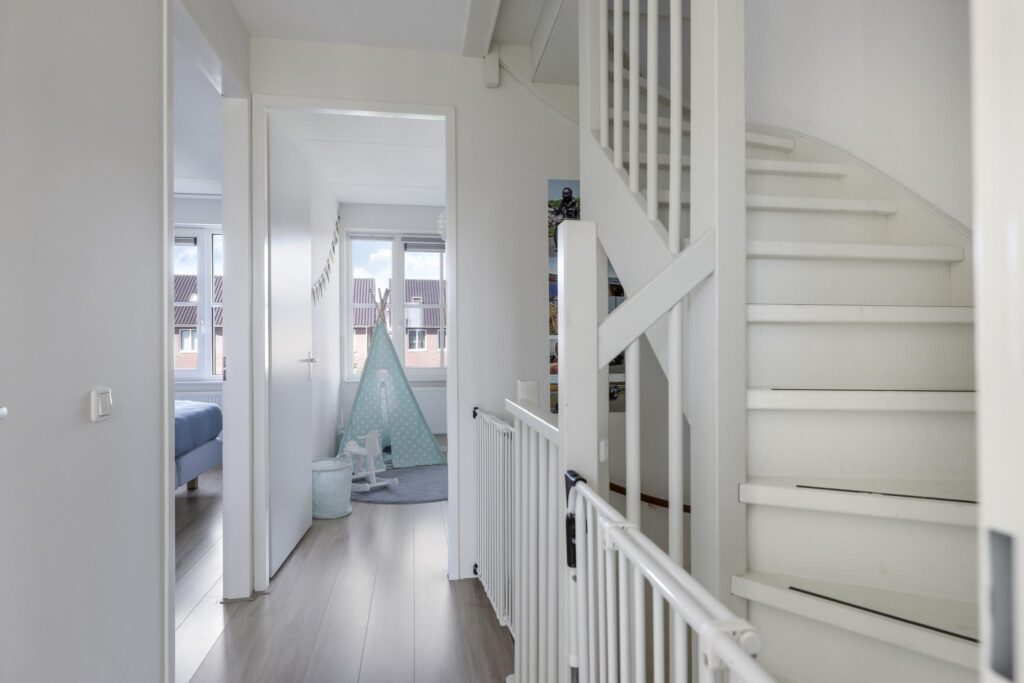 Via een vaste, open trapopgang komen we op de 2e verdieping terecht. Vanuit de bouw betrof dit een multifunctionele, open ruimte maar in 2021 is hier flink in geïnvesteerd door deze woonlaag op te delen in 2 extra slaapkamers, een washoek en een zoldervliering (in de nok). De scheidingswanden zijn daarbij op degelijke wijze en met isolatie aangebracht. Voor elke kamer een radiator was vanuit de bouw al voorbereid.