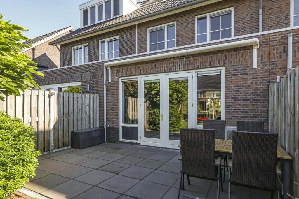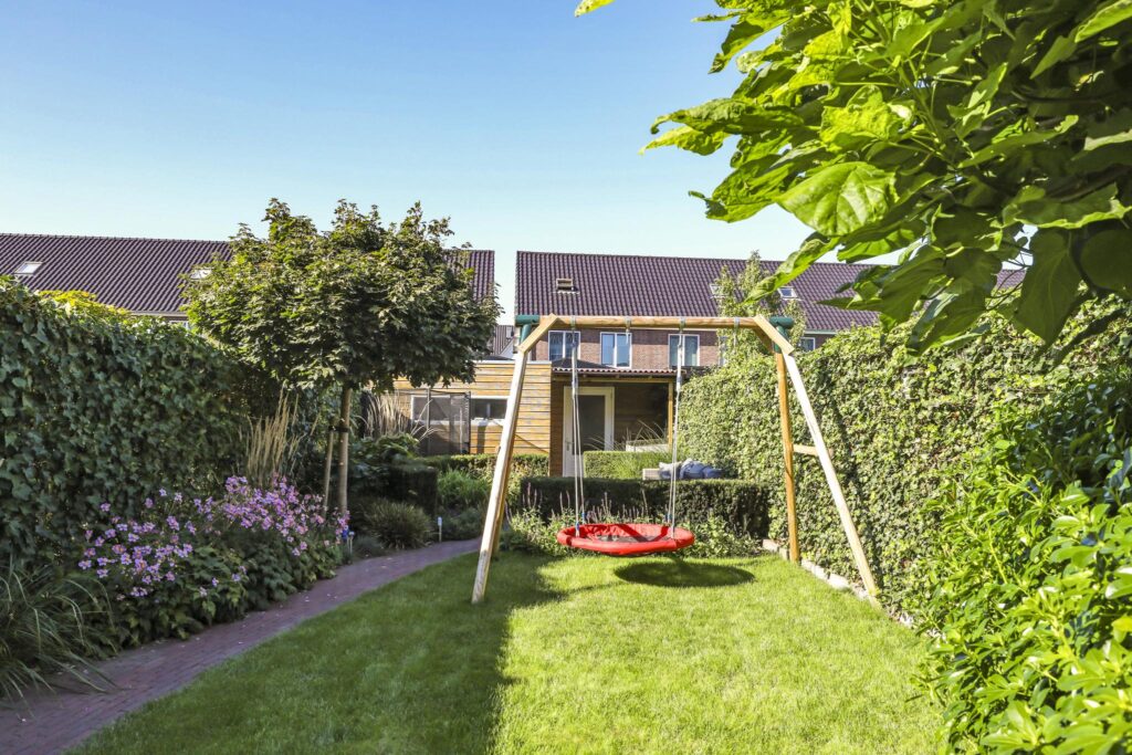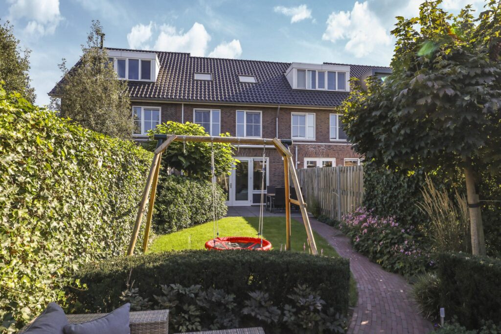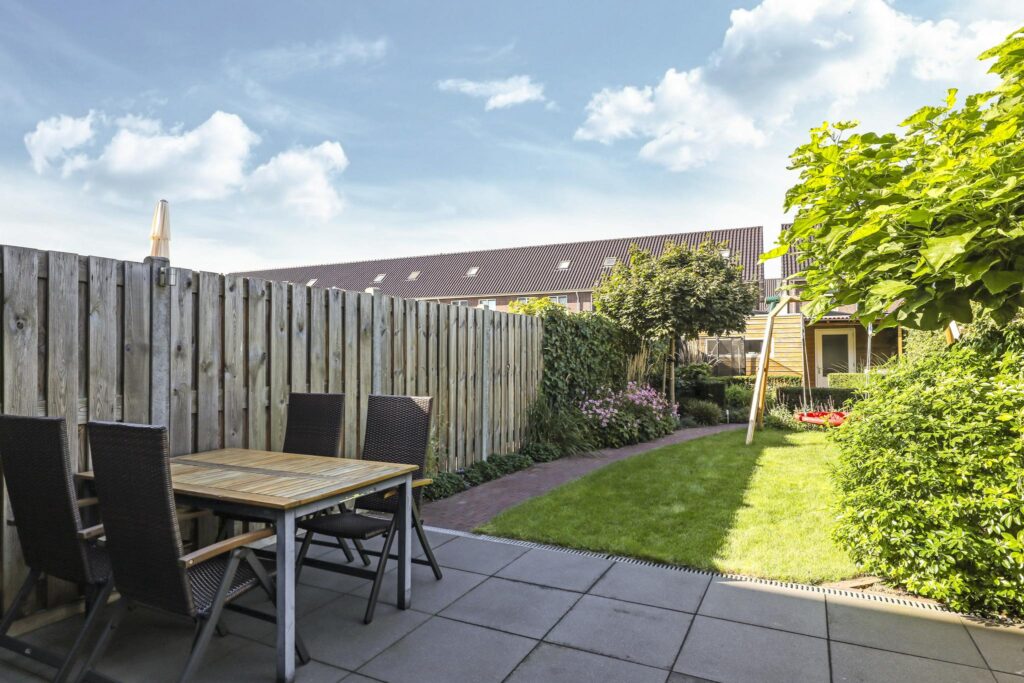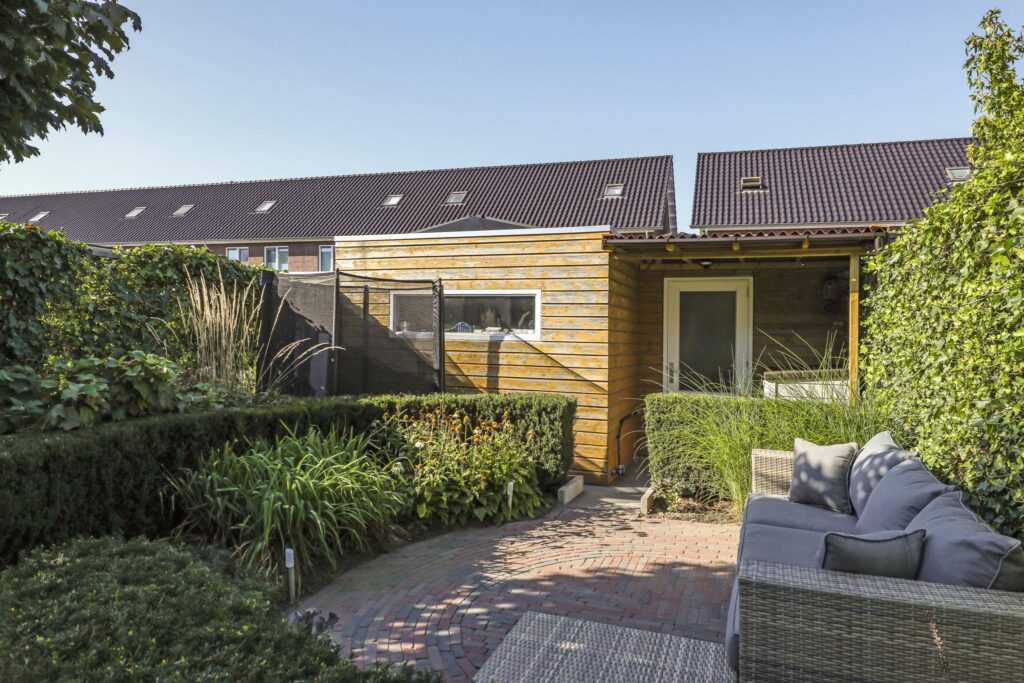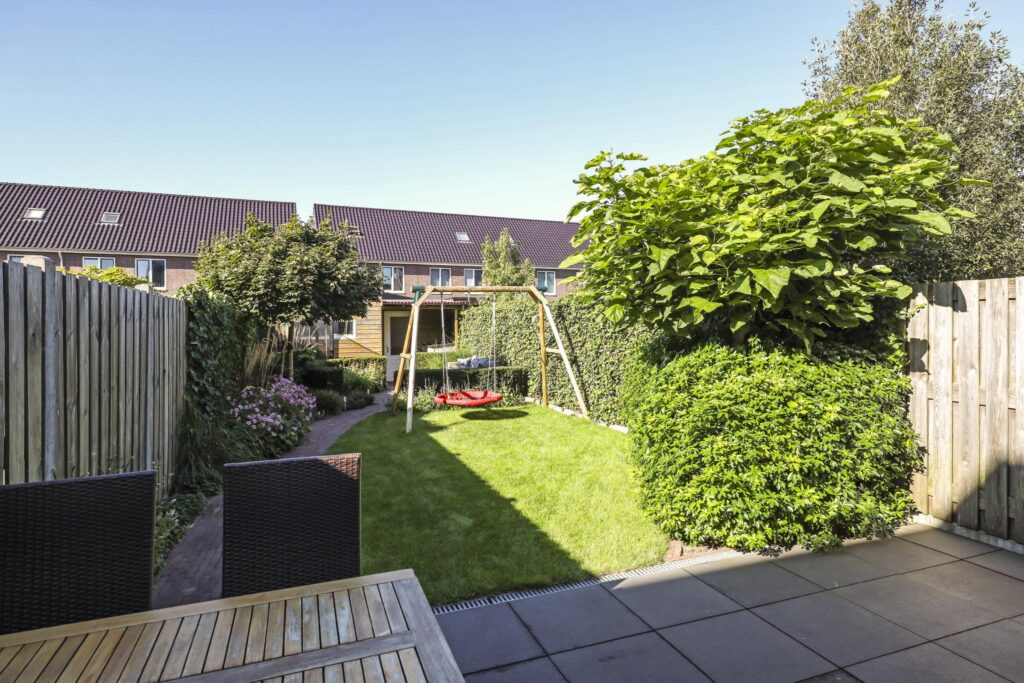 Bij een grote gezinswoning hoort ook een royale achtertuin. Met 19 meter diepte (tot aan de schuur) en bijna 6 meter breedte is de achtertuin veel groter dan in de gemiddelde nieuwbouwwijk. Dat is dan ook een sterk punt van deze woning wanneer je van het buitenleven houdt. Er zijn 2 terrassen aangelegd waardoor er altijd wel een plek in de zon te vinden is. Gelukkig is het niet zo’n tuin die helemaal is ‘dichtgestraat’ aangezien enkele bomen, verzorgde hagen en een gazon voor een groen karakter zorgen. Speeltoestellen zoals de schommel en de trampoline worden ter overname aangeboden. Het terras bij de achtergevel heeft een breed uitvalscherm (zonwering, elektrisch bedienbaar) waardoor je hier op een warme dag toch beschut buiten kunt zitten.