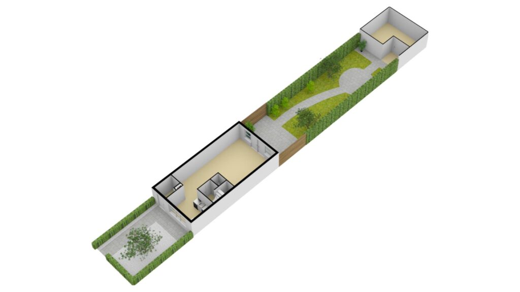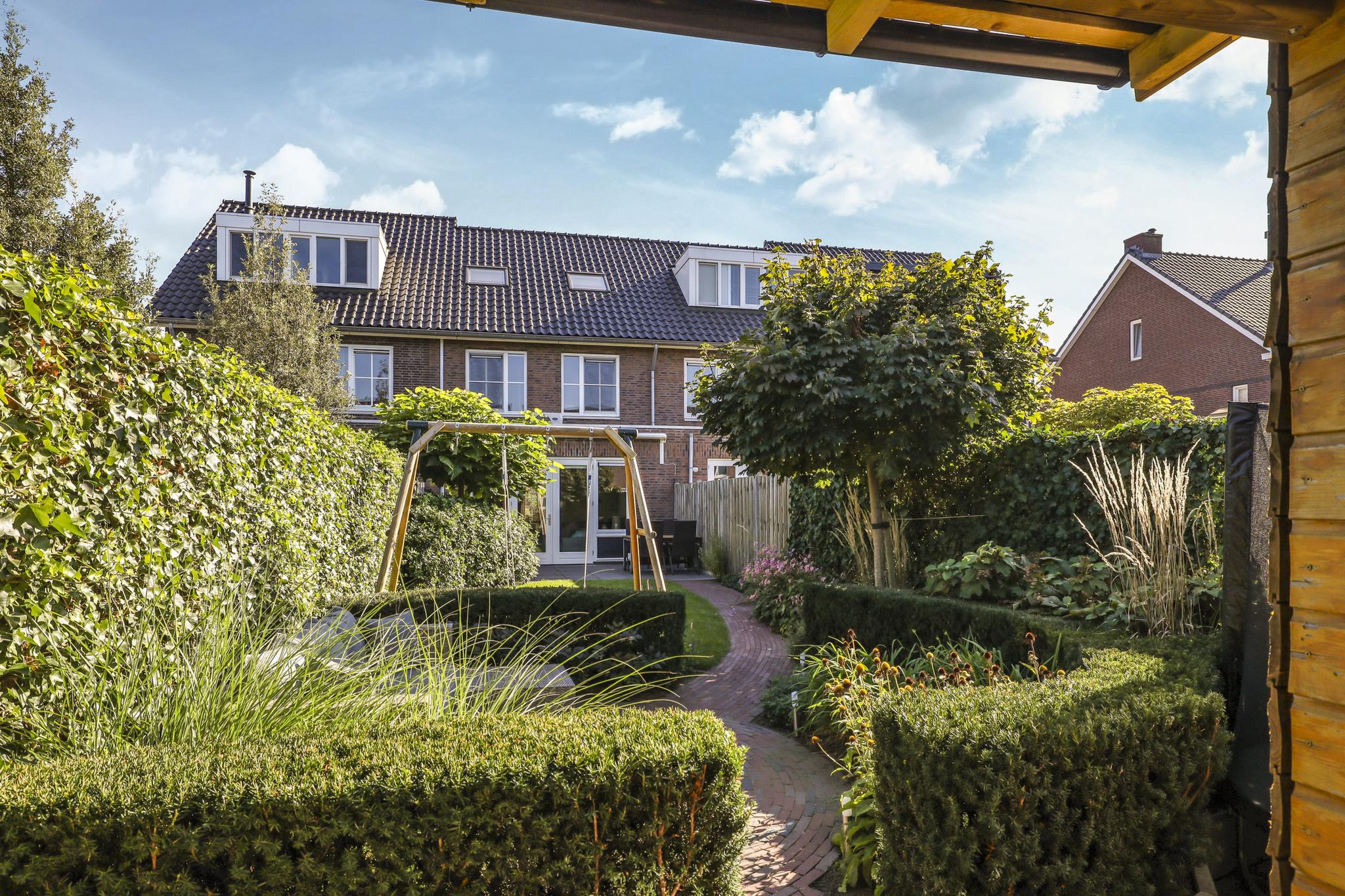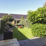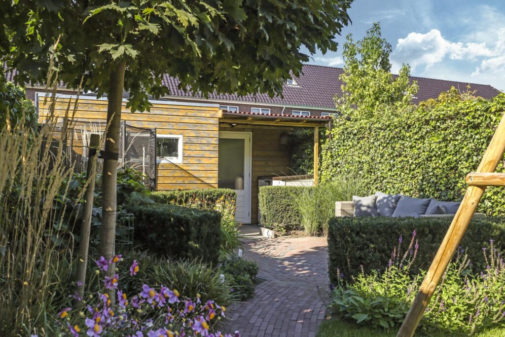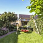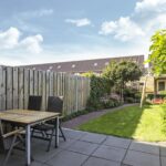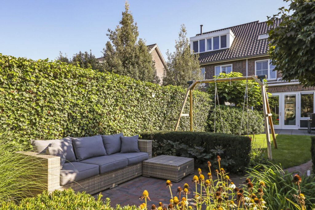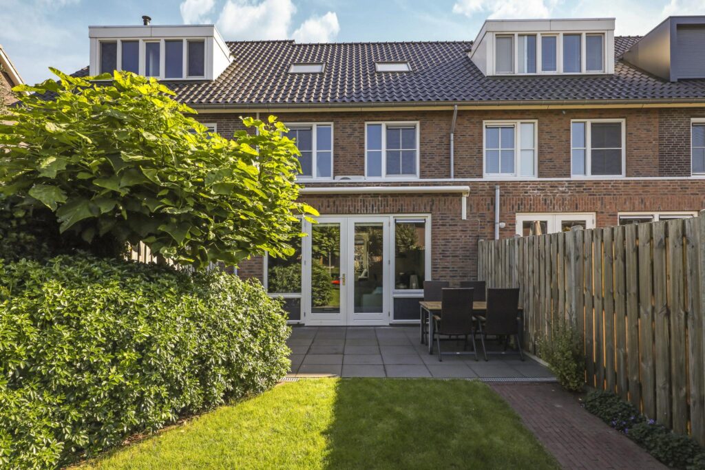 Bij een grote gezinswoning hoort ook een royale achtertuin. Met 19 meter diepte (tot aan de schuur) en bijna 6 meter breedte is de achtertuin veel groter dan in de gemiddelde nieuwbouwwijk. Dat is dan ook een sterk punt van deze woning wanneer je van het buitenleven houdt. Er zijn 2 terrassen aangelegd waardoor er altijd wel een plek in de zon te vinden is. Gelukkig is het niet zo’n tuin die helemaal is ‘dichtgestraat’ aangezien enkele bomen, verzorgde hagen en een gazon voor een groen karakter zorgen. Speeltoestellen zoals de schommel en de trampoline worden ter overname aangeboden. Het terras bij de achtergevel heeft een breed uitvalscherm (zonwering, elektrisch bedienbaar) waardoor je hier op een warme dag toch beschut buiten kunt zitten.