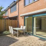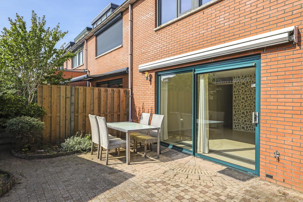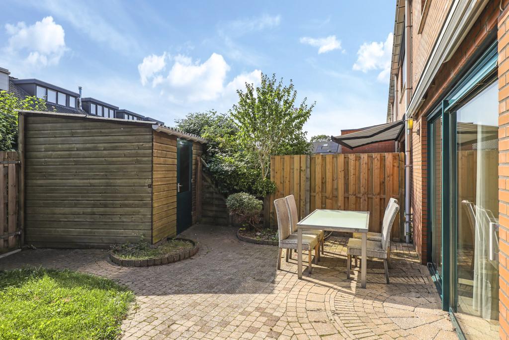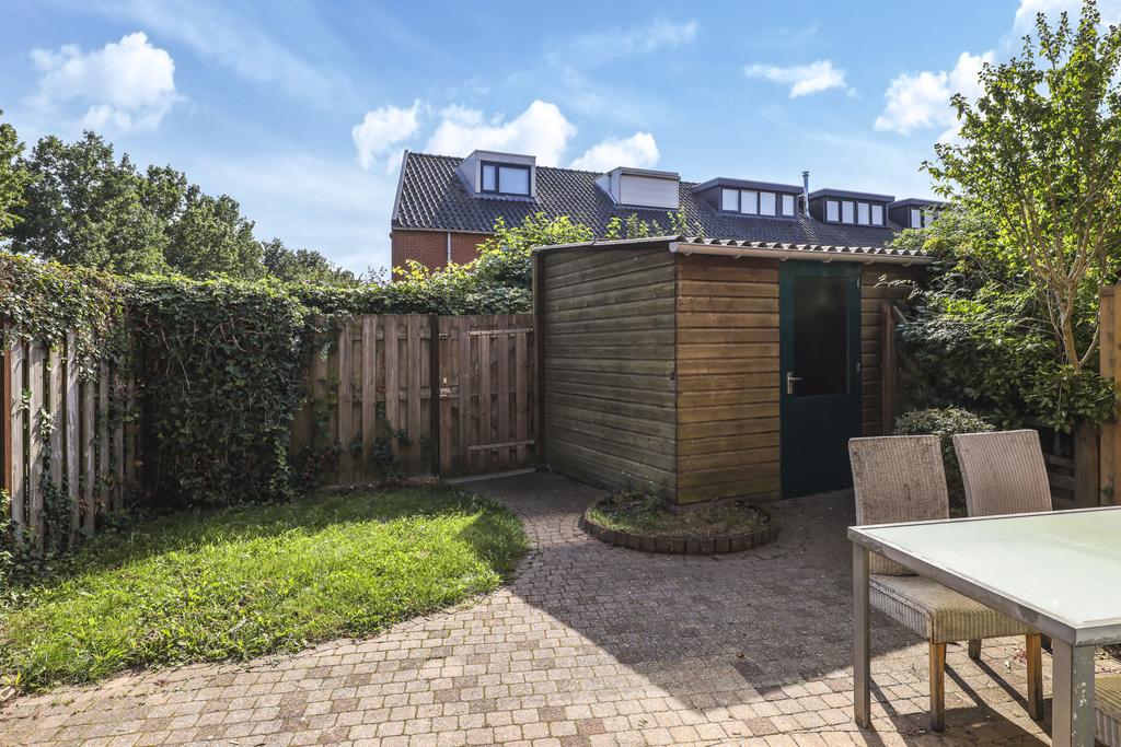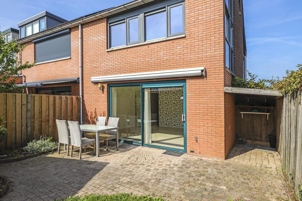 Bij deze woning hoort een zonnige achtertuin. De tuin ligt vol op het zuiden waardoor je hier de gehele dag van de zon kunt genieten. De tuin is niet diep maar door de hoekligging is deze breder dan de naastgelegen woningen. De ligging op de hoek maakt dat je een ‘vrijer’ gevoel ervaart. Aan de gevel is zonwering (elektrisch bedienbaar) geplaatst om een schaduwplek te kunnen creëren op de warme zomerdag. De tuin is omsloten met een schutting met in de hoek een houten (fietsen)berging welke is voorzien van elektra. Ook is er een achterom aanwezig.