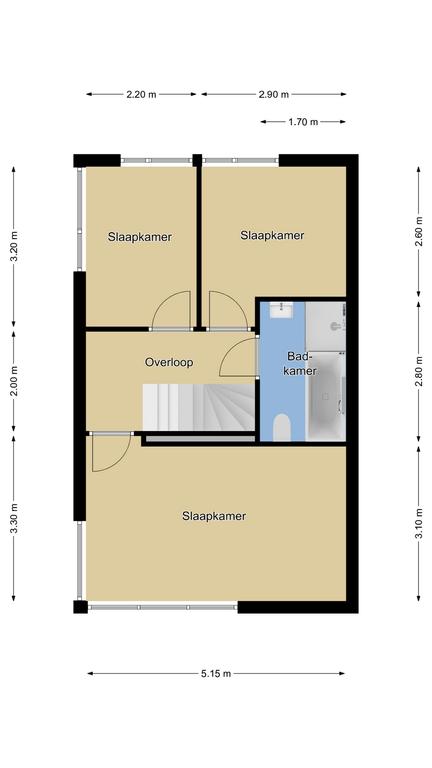Via de trapopgang in de hal komen we op de 1e verdieping terecht. Hier schakelt de overloop 3 slaapkamers en de badkamer aan elkaar. Opvallend is hier de hoofdslaapkamer welke over de gehele breedte van de woning is gelegen, de kamer heeft dan ook een goed formaat van ca. 16m². De hoekligging maakt de slaapkamer ruimtelijk en licht omdat hier een hoekraam geplaatst is. De overige 2 slaapkamers zijn respectievelijk 8m2 en 7m2.