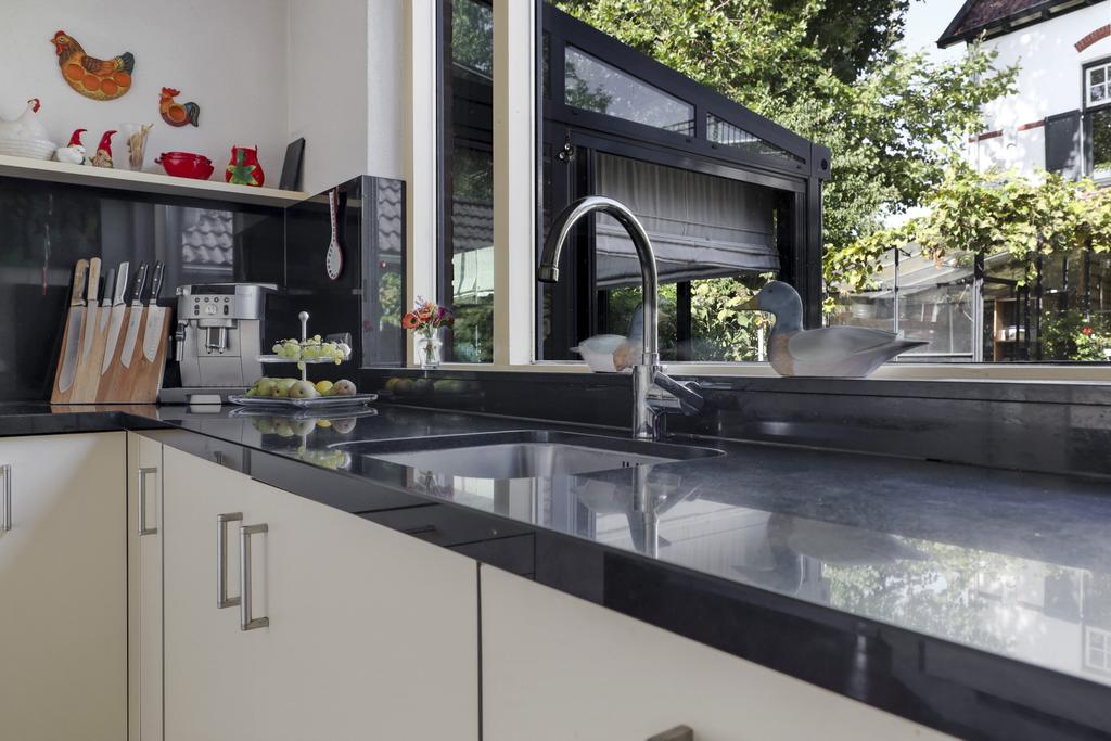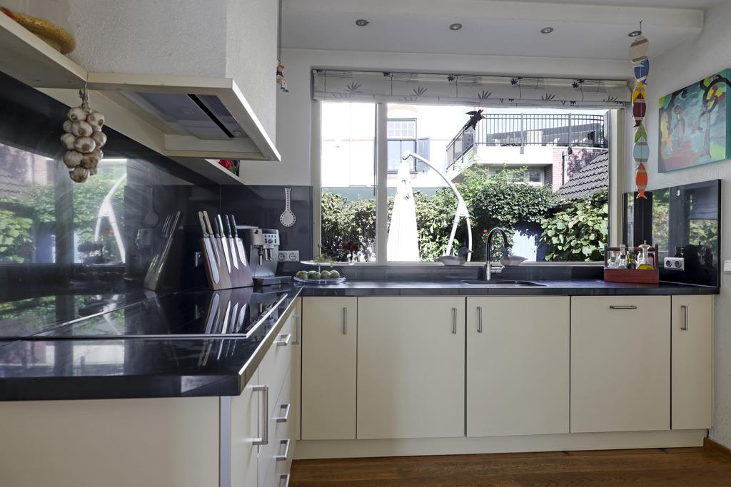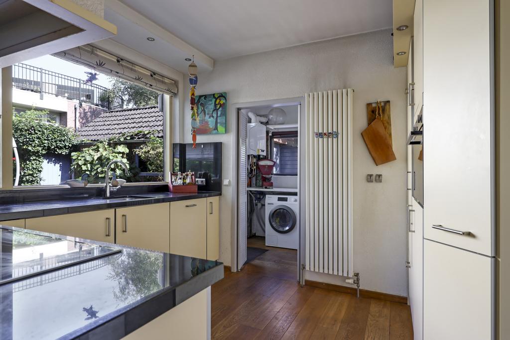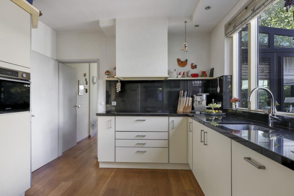 Grenzend aan de woonkamer is de keuken gelegen. Deze is ruim opgezet waarbij de keuken uit een hoekopstelling en een hoge kastenwand bestaat. Het aanrechtblad is van graniet wat de keuken een luxe uitstraling geeft. Ook op de inbouwapparatuur is niet bezuinigd waarbij je het volgende kunt verwachten: een vaatwasser (Siemens 2023), een combi-oven/magnetron (Samsung, 2023), een brede 5-zone inductie kookplaat (Bosch, 2022), een afzuigschouw, een koelkast en een aparte vriezer (4 lades). Velen zullen het prettig vinden dat het aanrecht net even iets hoger is geplaatst dan normaal. Inbouwspots en een designradiator maken de keuken compleet.