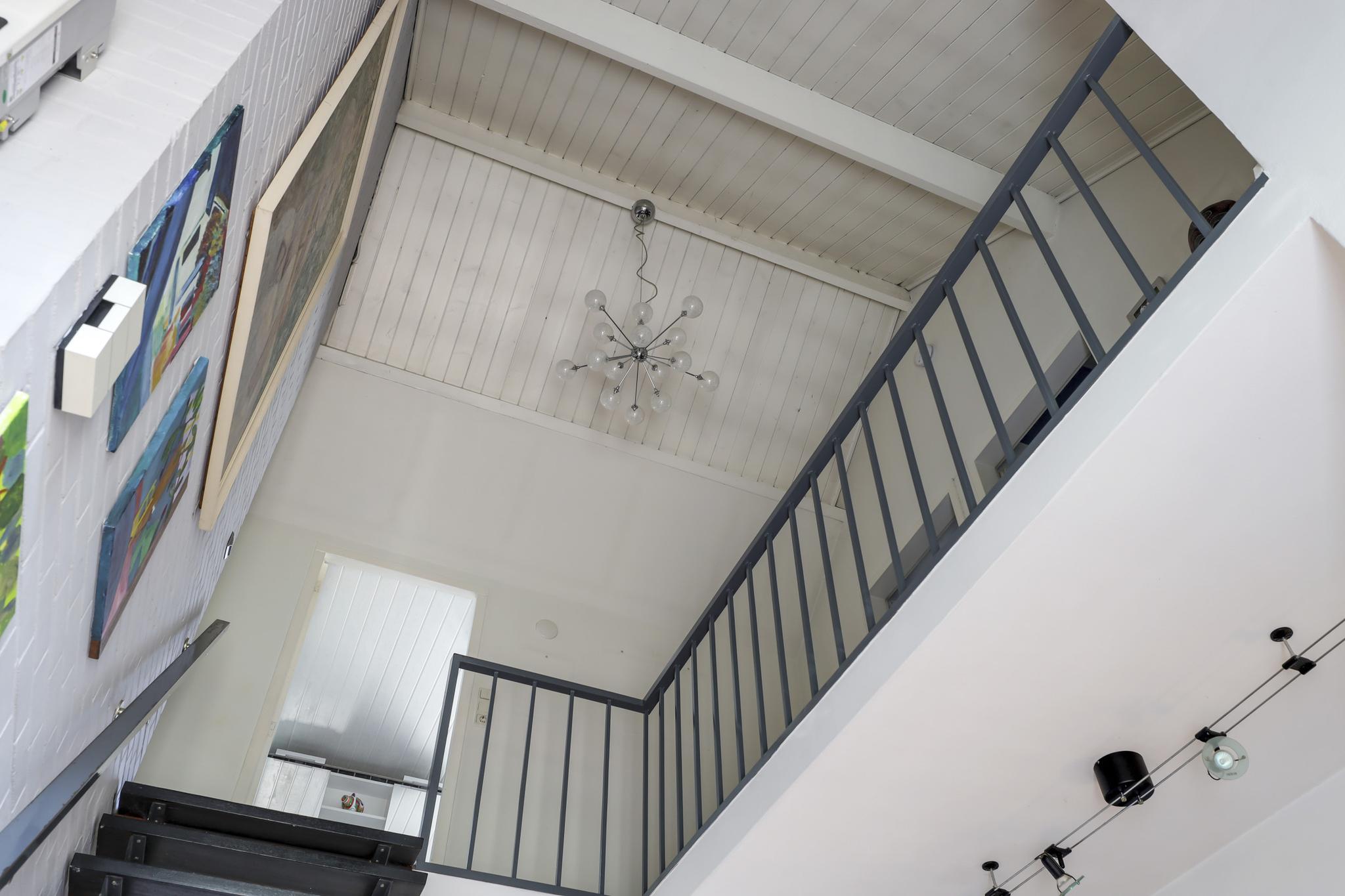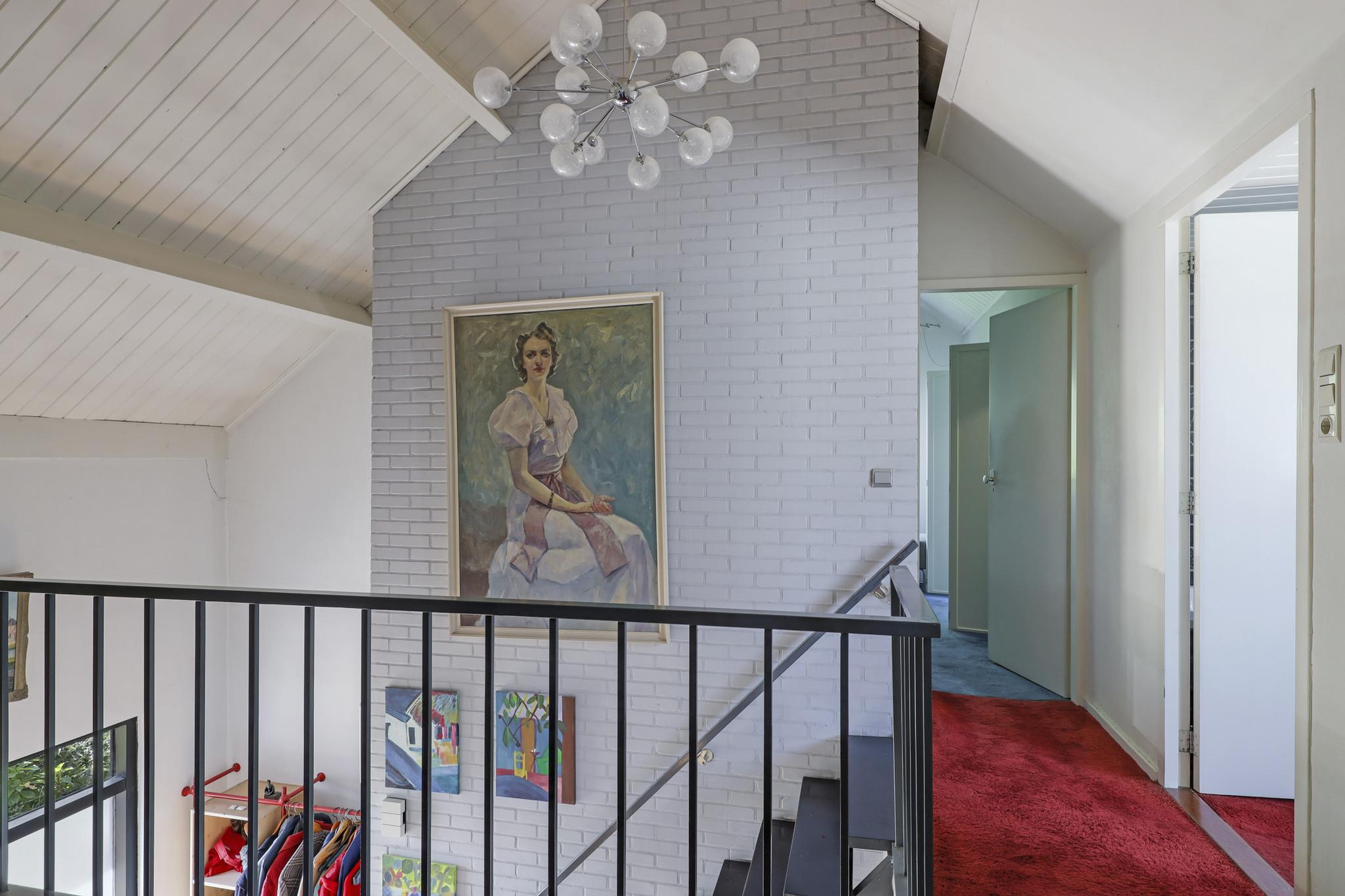 Via de open trapopgang bereiken we de 1e verdieping. Mede door de vide en de hoge nok, voelt de overloop bijzonder ruimtelijk aan. Deze overloop schakelt 3 slaapkamers en de badkamer met elkaar. Ook is er nog een handige inbouwkast op de overloop te vinden. Hier kun je bijvoorbeeld een koffer en/of een winterdekbed kwijt.