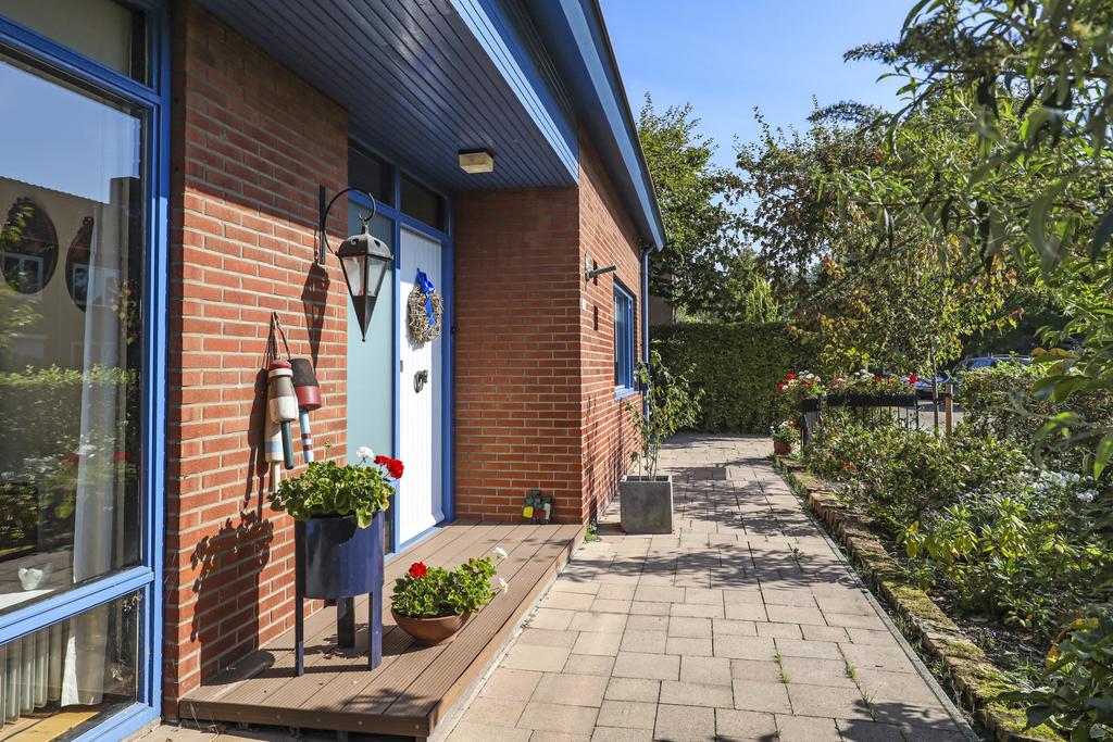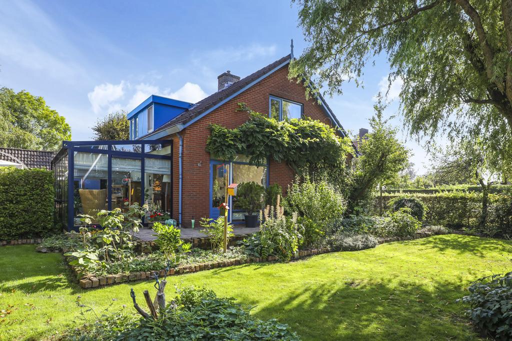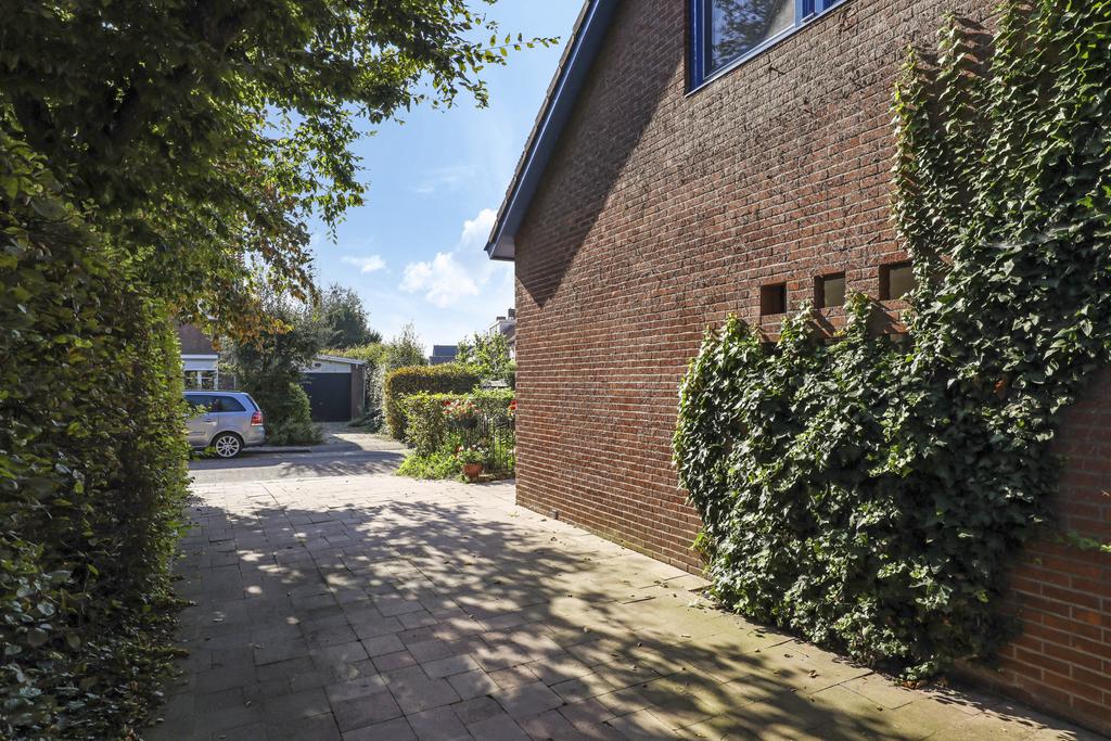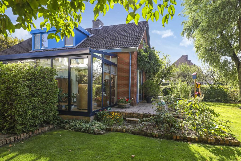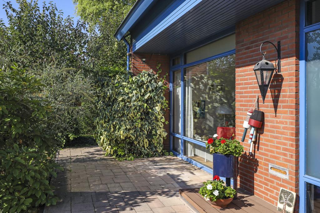 Deze woning staat op een aantrekkelijk perceel die relatief veel privacy te bieden heeft. Dit komt voornamelijk door alle (hoge) hagen, struiken en bomen die de tuin een groen en natuurrijk karakter geven. Het voelt bijna alsof je door een park loopt. Elke hoek heeft wel weer een eigen beleving en bezonning. Het grote terras is aan de achterzijde gelegen en grenst aan zowel de keuken als de serre. Hier kun je een grote tuinset met parasol kwijt. Ook aan de voorzijde voor het raam van de woonkamer kun je een lekker zitje creëren. Je zit hier dan voor een deel onder het overstek van de dakconstructie.