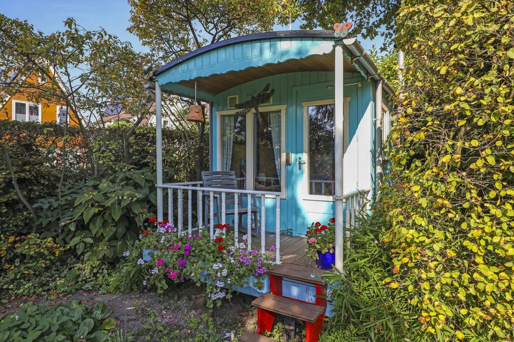 De Pipowagen is toch wel heel uniek te noemen. Het felle, azuurblauwe kleurtje valt speels op tussen al het groen. Deze is volledig geïsoleerd en daardoor voor verschillende doeleinden te gebruiken. Zelfs in de winter aangezien er ‘gewoon’ een houtkacheltje in staat. Het huidige gebruik is als een atelier, maar je kunt er ook vele andere hobby’s uitoefenen. Maar ook tieners zullen al snel inzien dat deze comfortabele pipowagen wel eens gezelliger kan zijn dan de woonkamer of de serre. Het balkonnetje aan de voorzijde maakt het helemaal af. Wanneer je hier een schommelstoel neerzet, kun je hier lekker wegdoezelen in het voorjaarszonnetje.