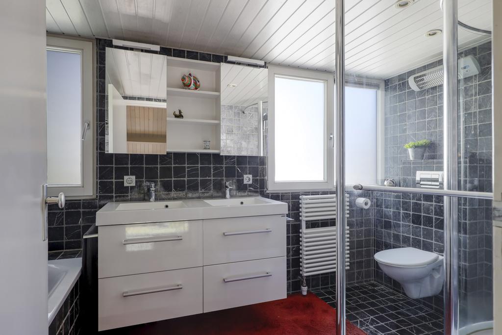 Badkamer met inloopdouche, ligbad, 2-persoons wastafelmeubel en 2e toilet.