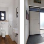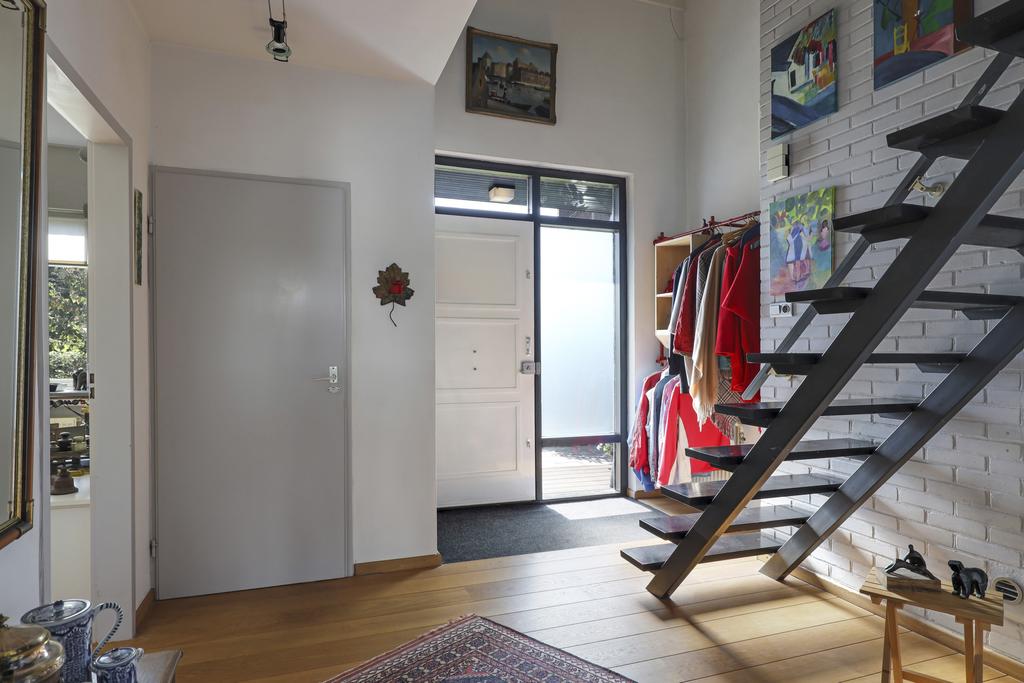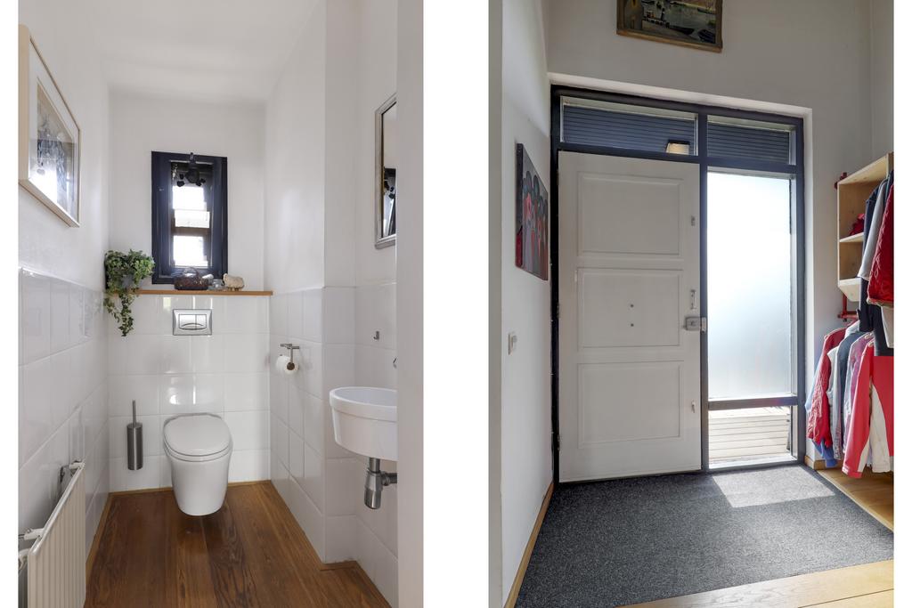 De hal/entree met vide tot aan het schuine dak is de spil van het huis. De hoogte van de vide, de royale indeling en de open trap dragen bij aan een bijzonder ruimtelijke beleving. Het toilet is eveneens groter dan gemiddeld en is voorzien van een zwevend wandcloset. Aan de linkerzijde van de voordeur is een garderobenis aanwezig met plaats voor een kapstok. Doordat de voordeurpui wat meer naar binnen ligt, is er een overstek van de kap ontstaan waardoor je bij de voordeur altijd droog staat.