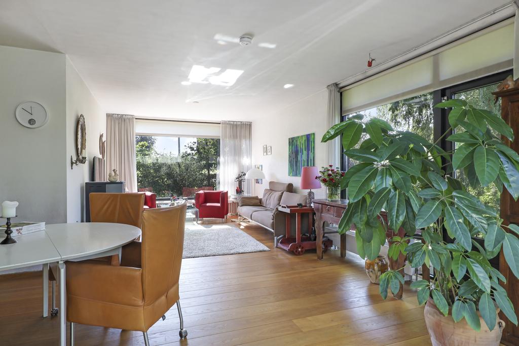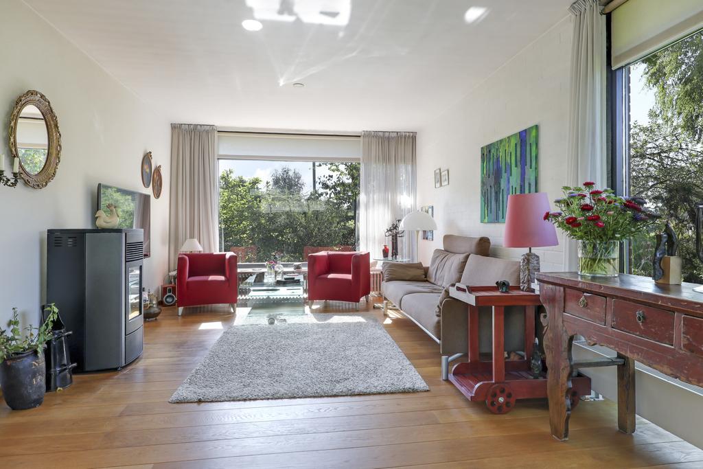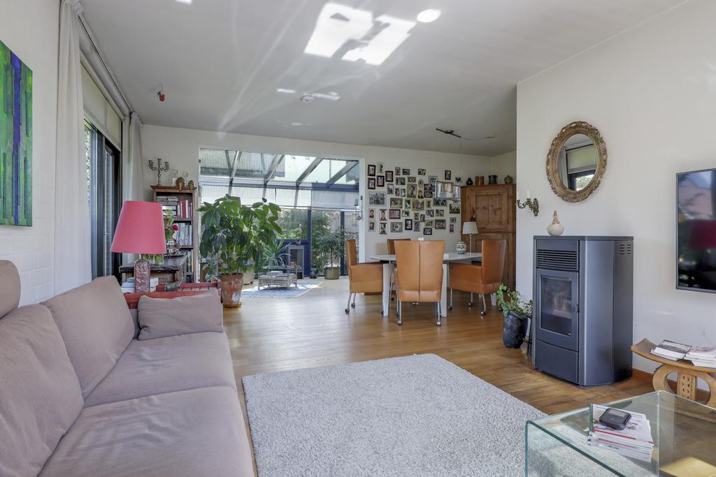 Grote ramen in voor- en zijgevel zorgen voor een prettige lichtinval in de woonkamer. Zeker doordat de zon gunstig om de woning heen draait, zal het er overdag nooit echt donker zijn. Een massief eikenhouten vloer zorgt verder voor een warme woonsfeer. Je kunt dan ook comfortabele zithoeken creëren, onder meer met een lekkere hoekbank en een 6-persoons eettafel. In de wintermaanden kun je de pelletkachel aansteken welke centraal in de woonkamer een plekje heeft gekregen.