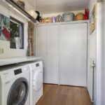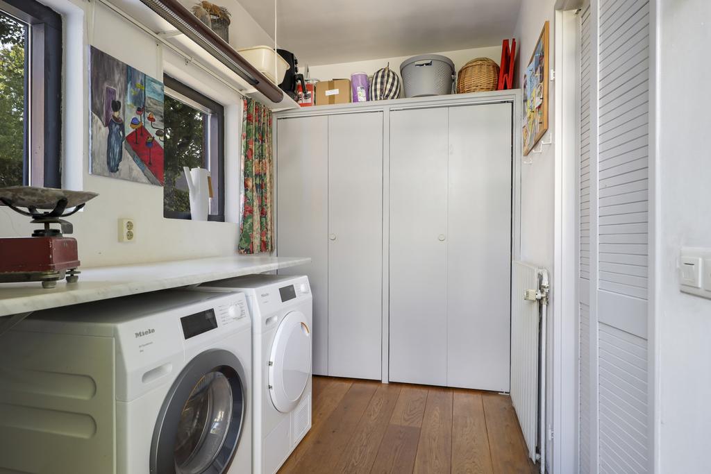 Vanuit de keuken loop je door naar de bijkeuken,. Deze ruimte is met name erg praktisch. Allereerst de vaste kastenwand die voor heel veel extra proviandruimte zorgt. Daarnaast kun je de wasmachine en wasdroger hier (onder een werkblad) kwijt. Tevens is hier in 2023 een Remeha CV-ketel geïnstalleerd (dicht bij keuken en badkamer). Een tuindeur geeft direct toegang tot het buitenterras (en indirect de garage).