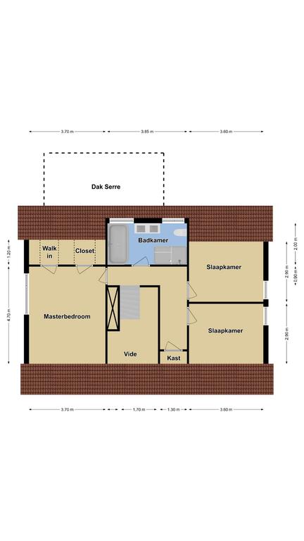 De grootste slaapkamer voelt aan als een heuse masterbedroom. Niet alleen vanwege het formaat (ca. 22m2) en de hoge nok, maar ook omdat het een eigen ‘walk-in-closet’ heeft. Deze walk-in-closet is opgedeeld in 2 kasten met aan weerzijden een hang- en een leggedeelte. Een pluspunt is de semi-mobiele airconditioning waarvan de lucht- en waterafvoer vast zijn en zal achterblijven.