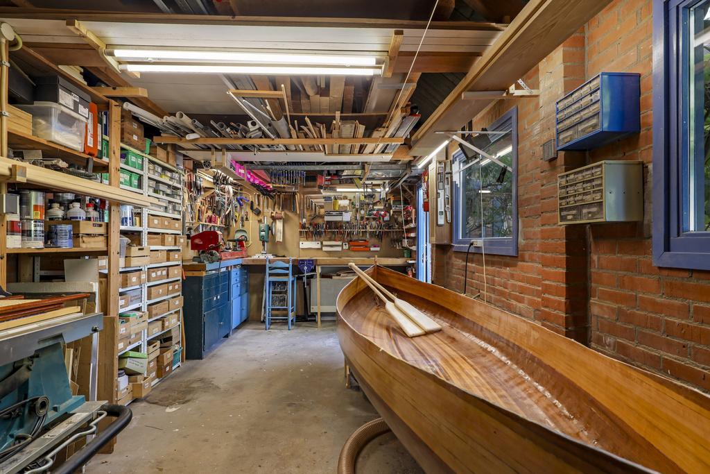 Het grootste bijgebouw is de garage aan het einde van de oprit. Deze garage is in steen opgetrokken en heeft een pannengedekt zadeldak. Met 23m2 en een opslagruimte in de nok, is deze garage veel groter dan gemiddeld (7,2m bij 3,2m). Heb je een hobby met auto’s of motoren of klus je liever aan een werkbank? In deze garage kun je het zelfs allemaal combineren. En net als in de andere bijgebouwen, is ook de garage warm te stoken (middels een gaskachel).