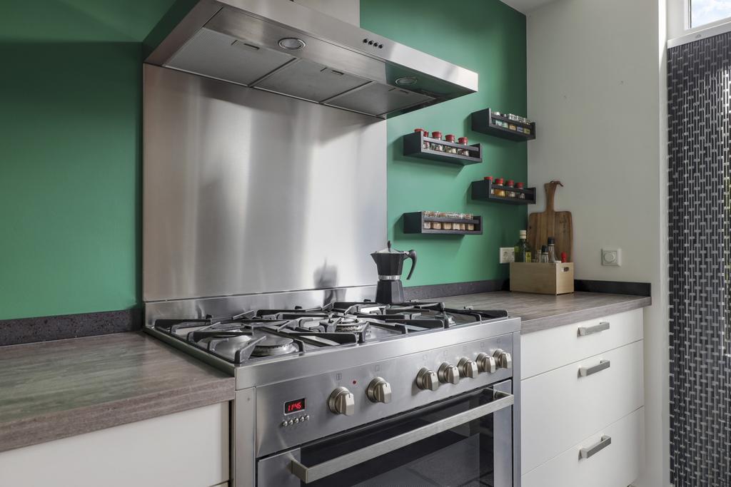 Oorspronkelijk had deze woning een dichte keuken, echter is hier de tussenmuur verwijderd waardoor er een riante, open leefruimte is ontstaan. Mede door de mooie breedtemaat van de woning voelt de keuken als een balzaal. Dit is ook terug te zien in het keukenblok zelf, er is hier gekozen voor een riante hoekopstelling waardoor je veel werkruimte hebt. Uiteraard is de keuken van alle gemakken voorzien waaronder een 90cm breed fornuis met 5-pits gaskookplaat en afzuigschouw, een vaatwasser en een grote koelkast. Brede ladekorven, een draaicarrousel in de hoek en trendy bovenkasten zorgen voor veel praktische opbergmogelijkheden. Inbouwspots zorgen voor sfeerverlichting waarbij het verzorgde stucwerk goed tot zijn recht komt. Erg comfortabel is de plavuizen vloer met vloerverwarming. Er is een tuindeur aanwezig waardoor je vanuit de keuken direct het buitenterras op loopt.