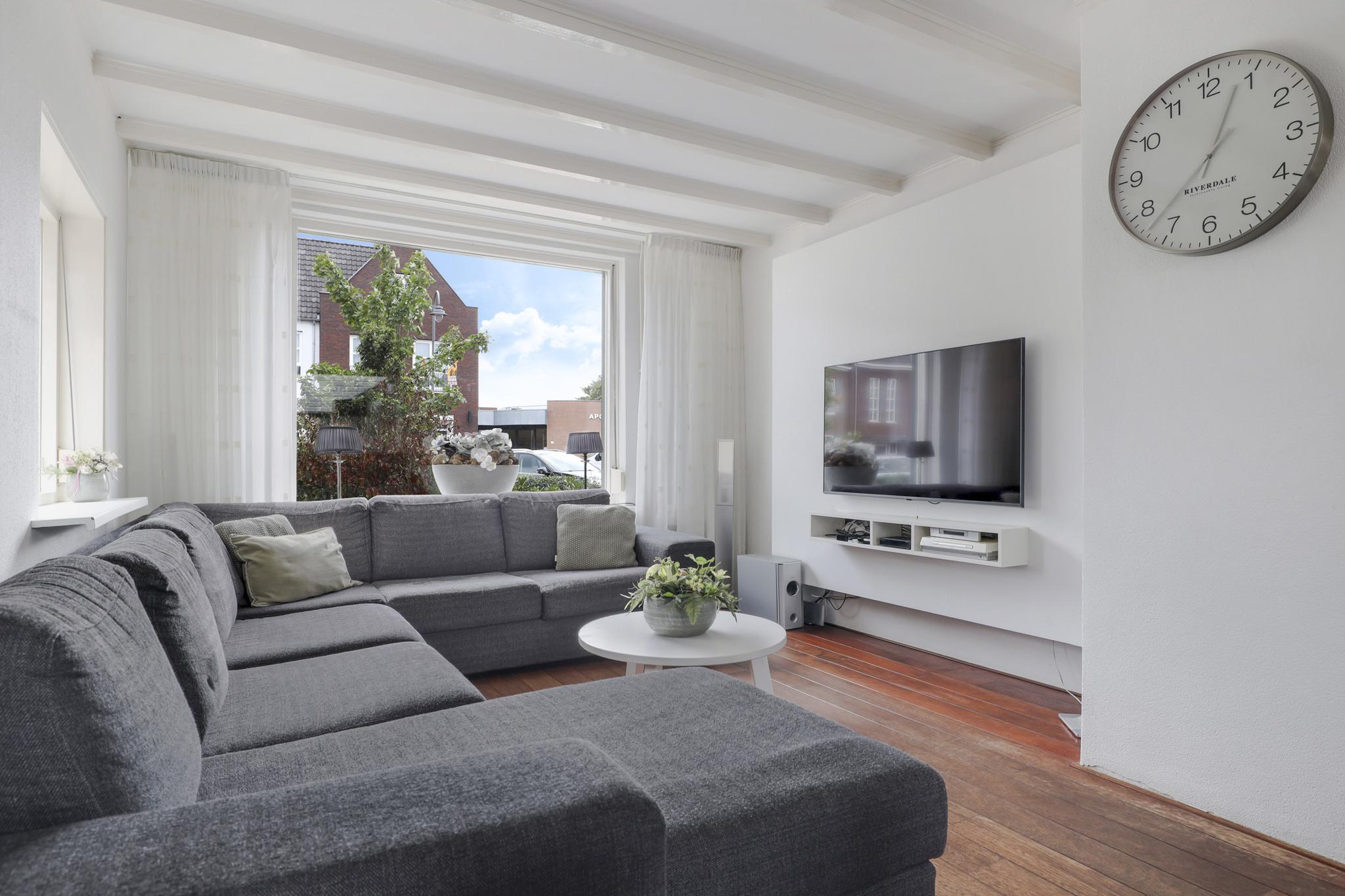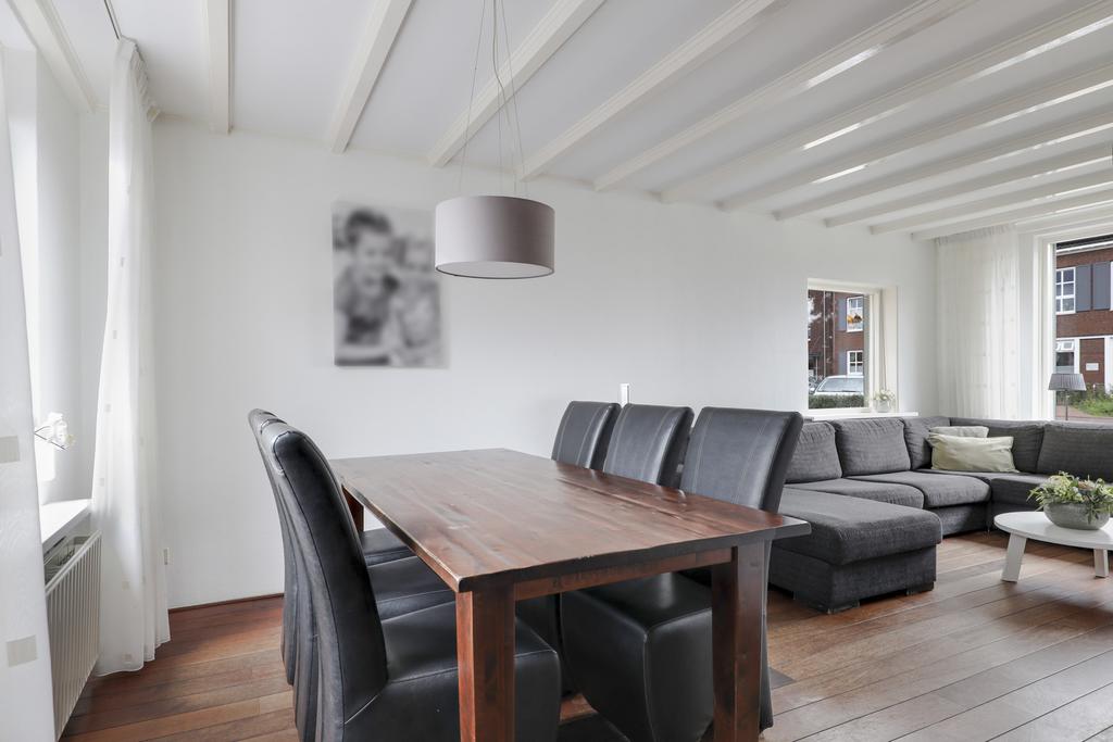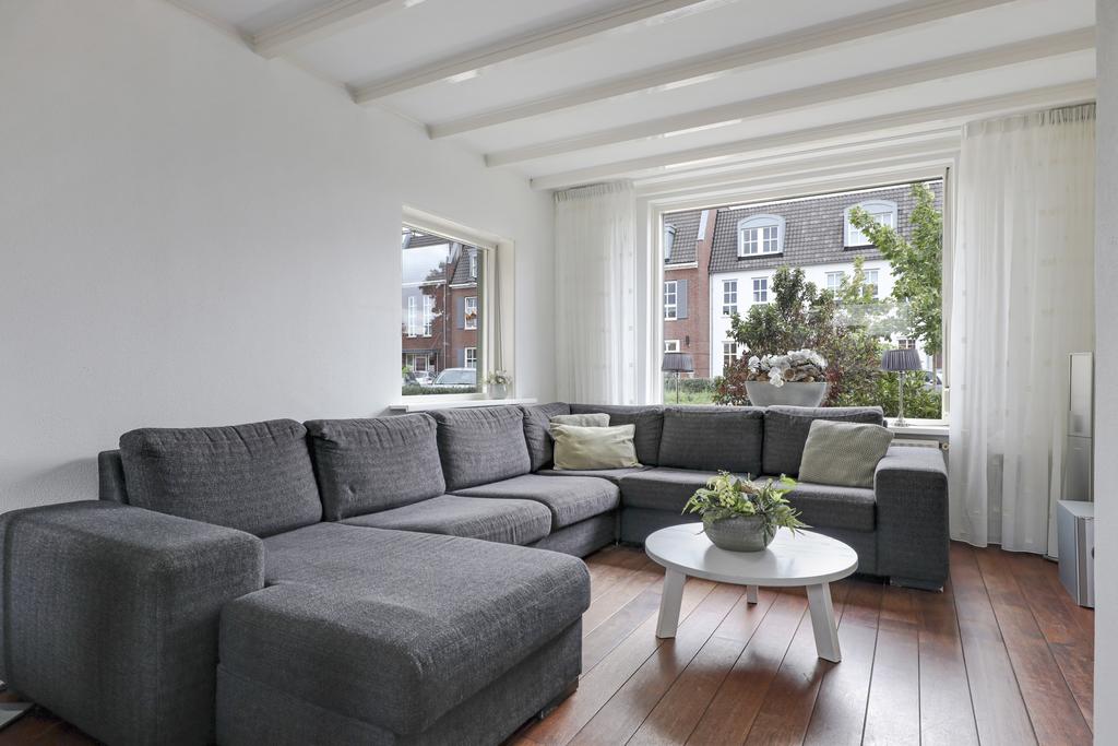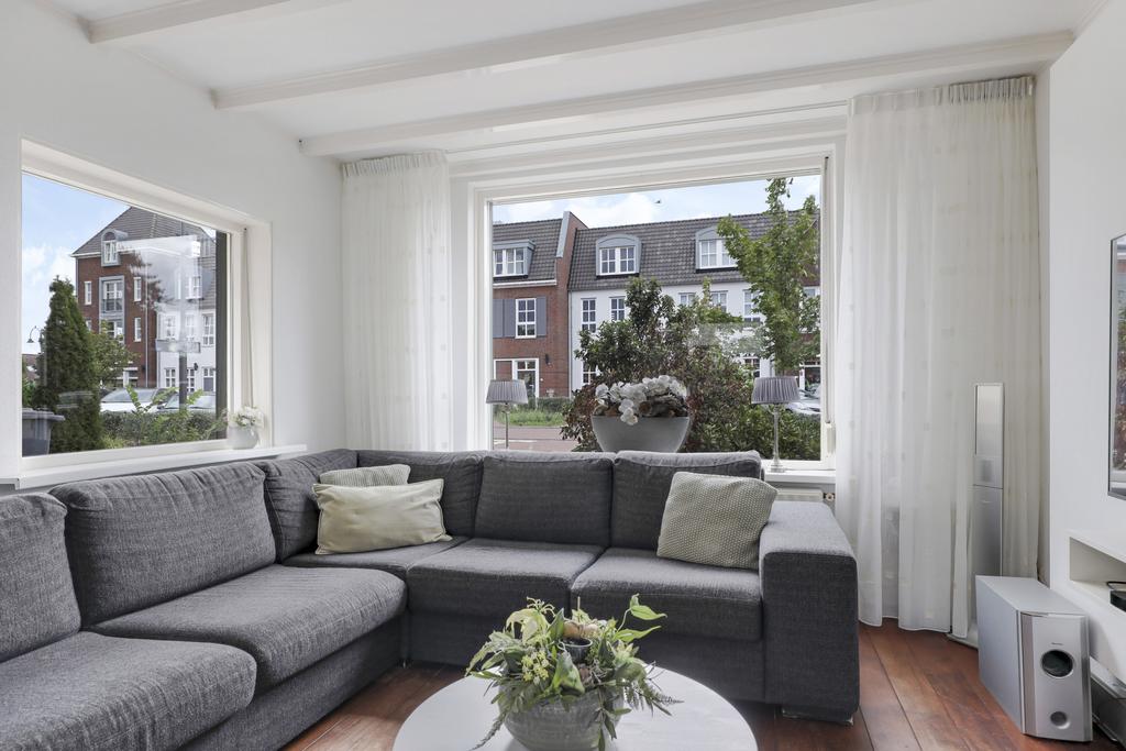 Bij deze woning hoort een ruime L-vormige woonkamer. Deze indeling zorgt ervoor dat er gespeeld kan worden met de inrichting, de eethoek en zithoek kunnen eenvoudig gewisseld worden waardoor de indeling niet standaard blijft. Grote ramen in de voor- zij- en achtergevel zorgen voor veel lichtinval in de woonkamer. De straat aan de voorzijde is recent vernieuwd waardoor er parkeergelegenheid en een buffer naar de straat toe is ontstaan.