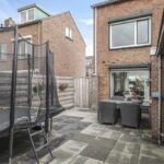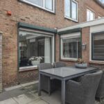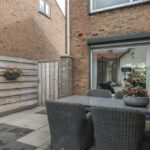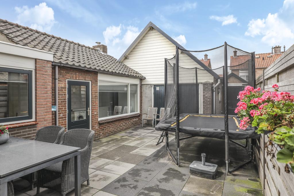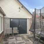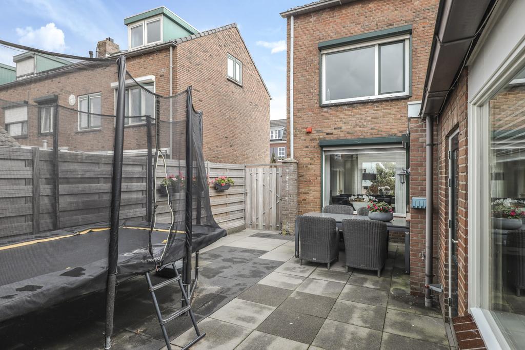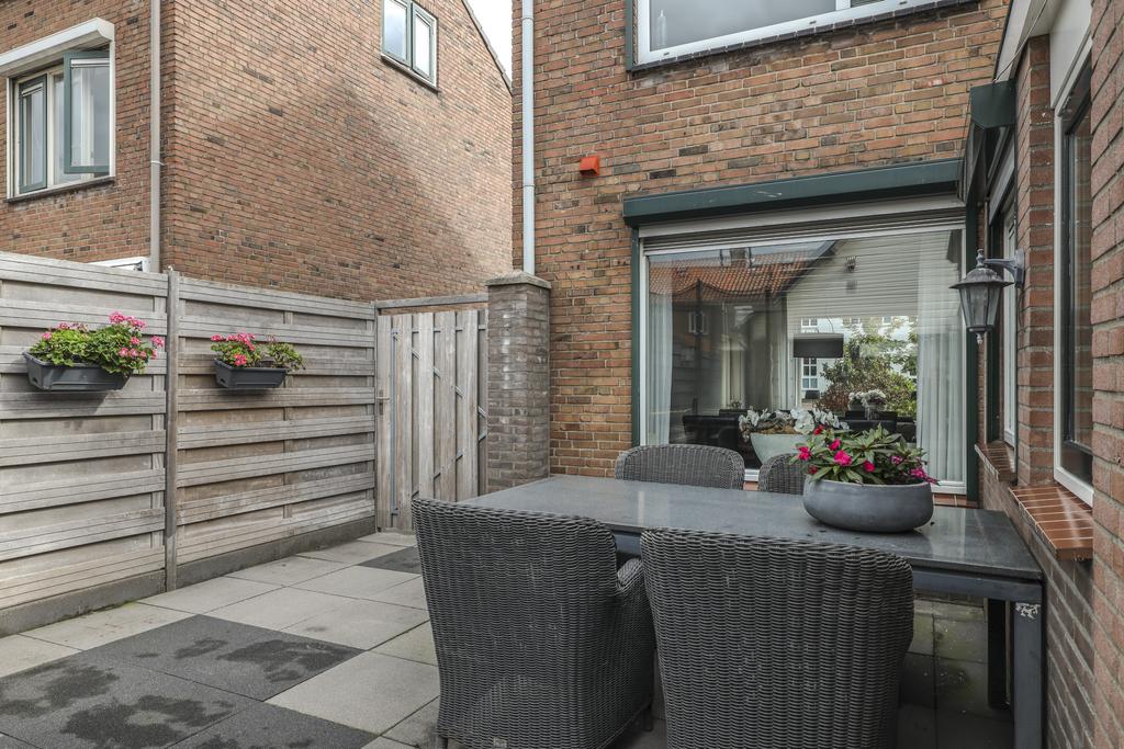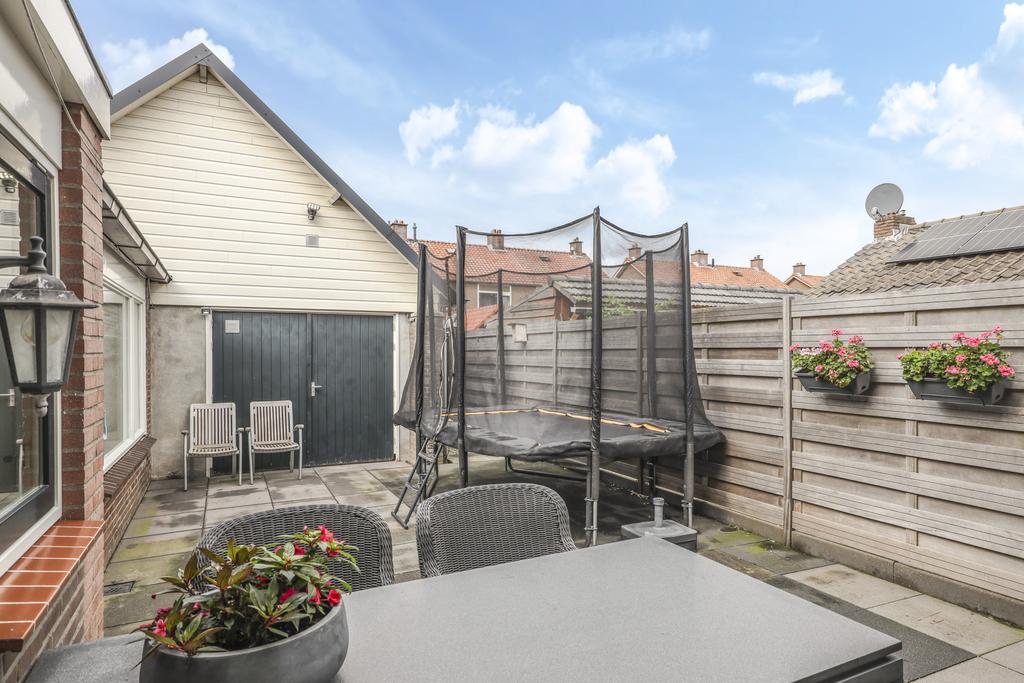 Op het midden van het perceel ligt de achtertuin. Deze is door de extra bebouwing redelijk besloten waardoor je hier van weinig inkijk geniet. De tuin is onderhoudsvriendelijk aangelegd met een groot terras. Je kan hier eenvoudig meerdere tuinsets kwijt. De tuin is middels een poort afgesloten naar de oprit toe. Door de ligging op het westen geniet je hier van veel middag- en avondzon. Naast de garage/multifunctionele ruimte is nog een houten fietsenberging te vinden.