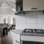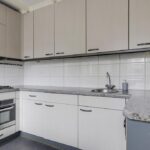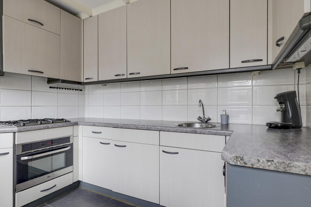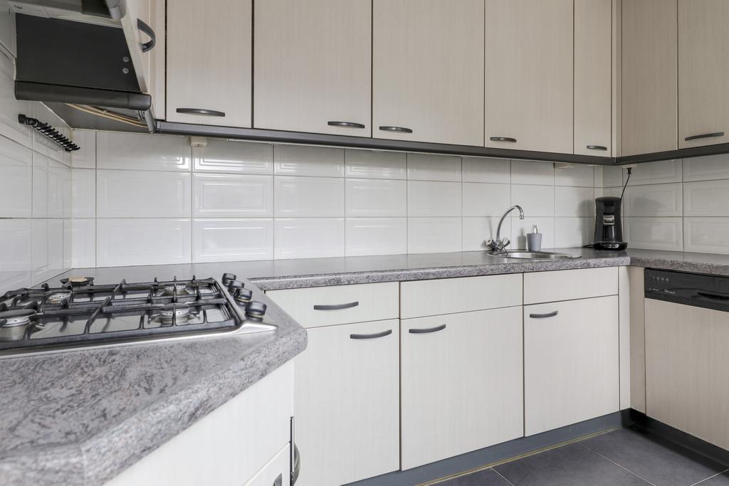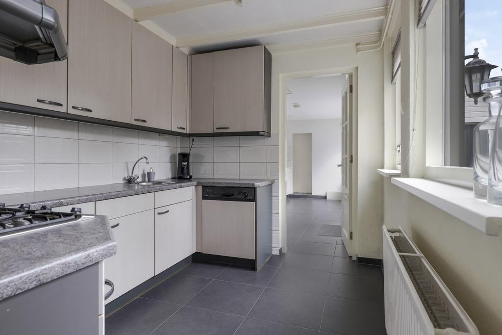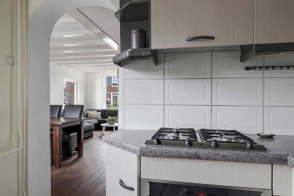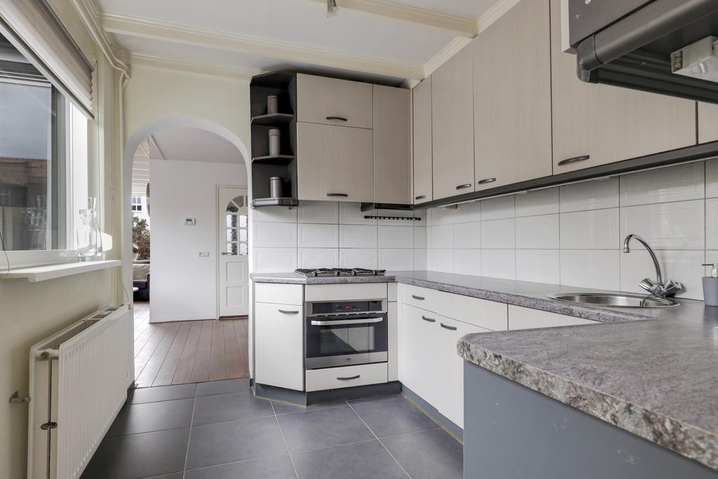 De keuken bevindt zich aan de achterzijde van de woning en is in de ‘uitbouw’ gesitueerd. Het betreft hier een halfopen keuken waardoor deze nog wel in verbinding staat met de woonkamer, maar tevens ook eigen ruimte betreft. Het keukenblok is in een U-opstelling geplaatst met bovenkasten voor maximaal veel opbergruimte. De aanwezige inbouwapparatuur bestaat uit een vaatwasser, een 4-pits gaskookplaat, een afzuigkap, een koelkast en een combi-oven/magnetron.