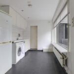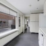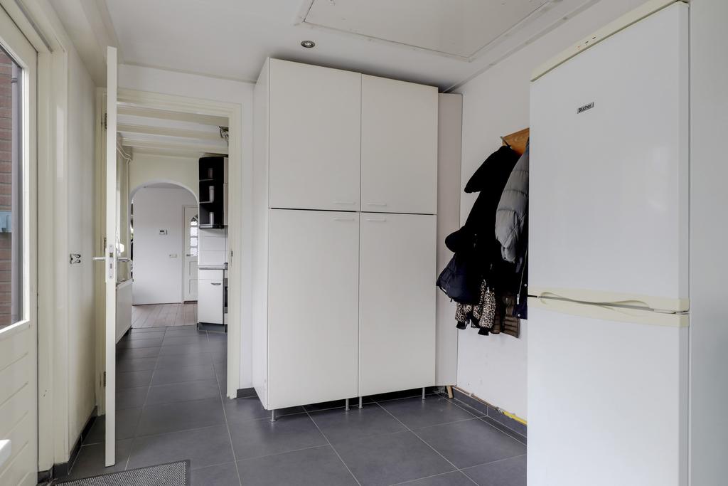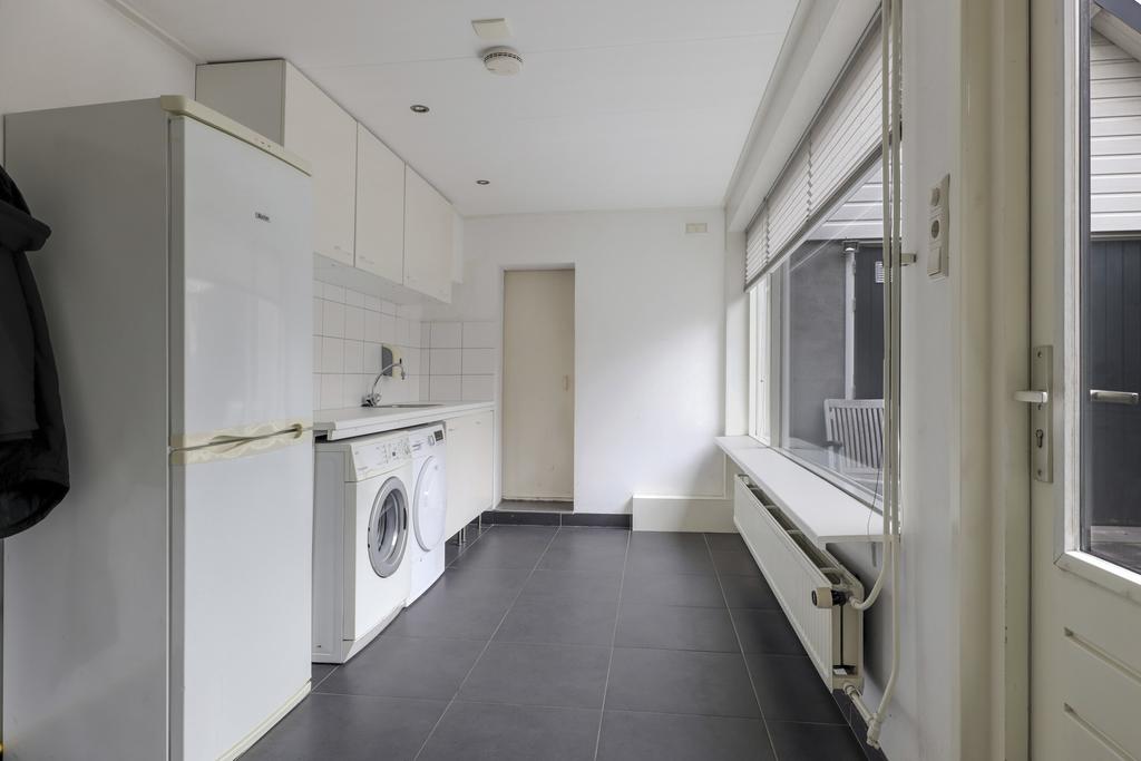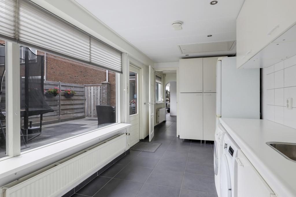 Vanuit de keuken bereik je de riante bijkeuken. Doordat deze is voorzien van een tuindeur zal deze al snel gebruikt worden als een 2e entree. Je hebt hier dan ook plaats voor een kapstok en een schoenenrek. In de bijkeuken is een 2e keukenblok geplaatst waaronder de witgoedaansluitingen verzorgd zijn weggewerkt. Een groot raam zorgt hier voor veel lichtinval.