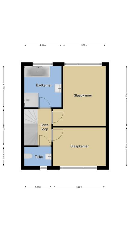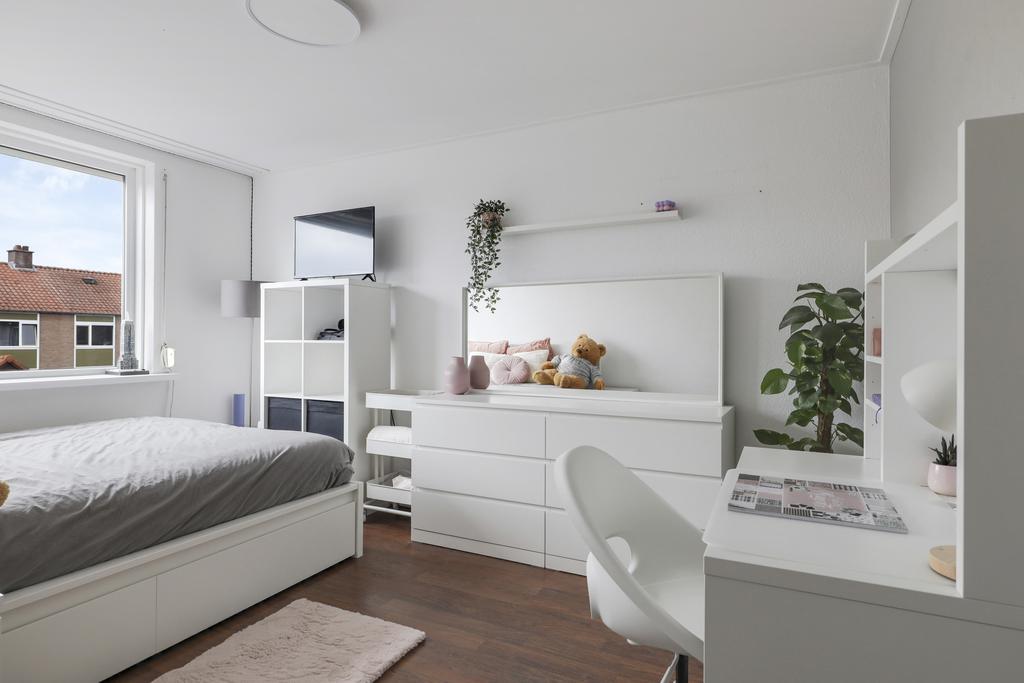 Via de trapopgang in de hal komen we op de 1e verdieping terecht, hier schakelt de overloop 2 slaapkamers, een badkamer en een toilet aan elkaar. Van oorsprong waren er 3 slaapkamers op deze verdieping, bij deze woning is een van de slaapkamers opgeofferd om een ruime badkamer te creëren. De slaapkamers hebben beiden een goed formaat, ca. 13m2 en 10m2 groot. Beide kamers hebben grote raampartijen waardoor de ruimtes licht aanvoelen. Middels de rolluiken zijn de kamers volledig te verduisteren.