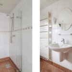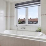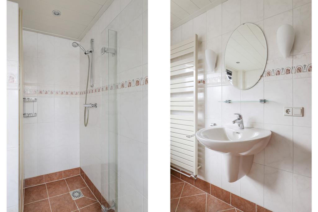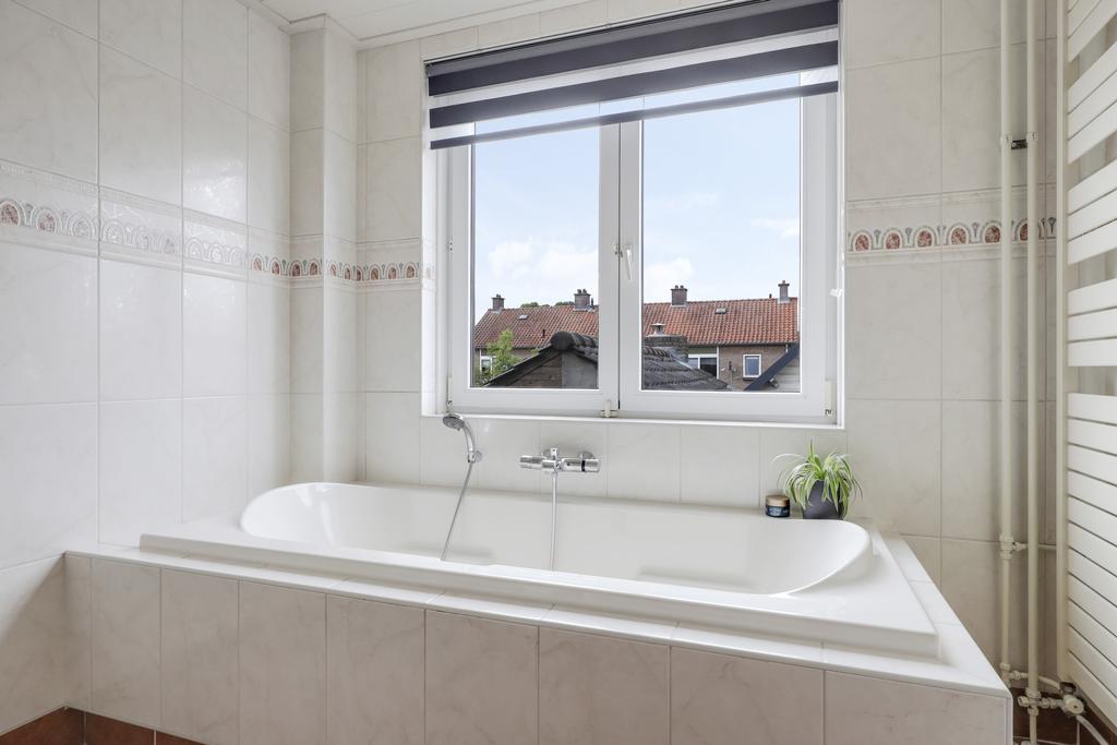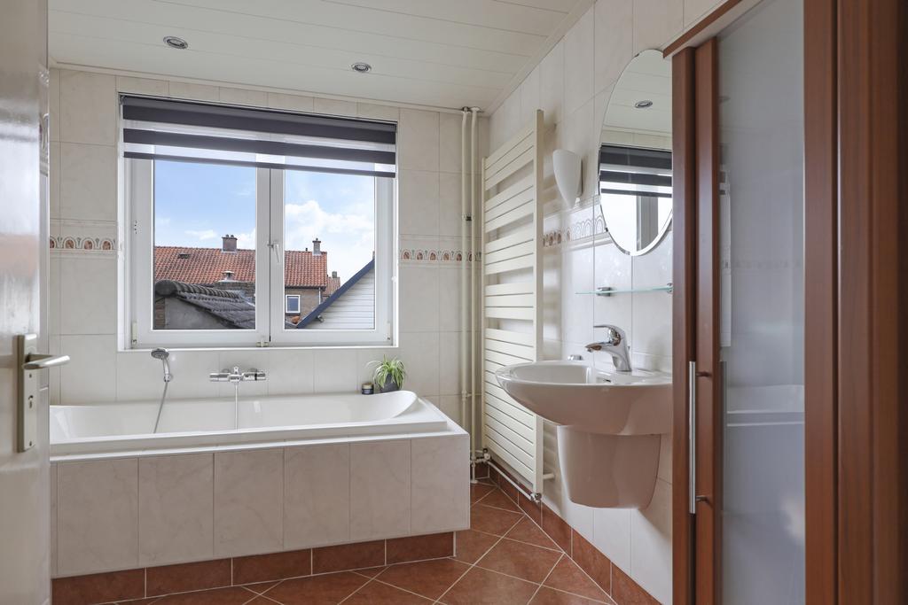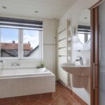 Zoals benoemd heeft de woning van origine een kleinere badkamer. Om meer ruimte te krijgen is bij deze woning de badkamer verplaatst naar een slaapkamer. Hierdoor is er een prettige ruimte beschikbaar gekomen waardoor de badkamer is voorzien van een ligbad, een inloopdouche en een wastafel. Een design handdoekradiator maakt het geheel af. Ook deze ruimte is voorzien van een grote raampartij.
