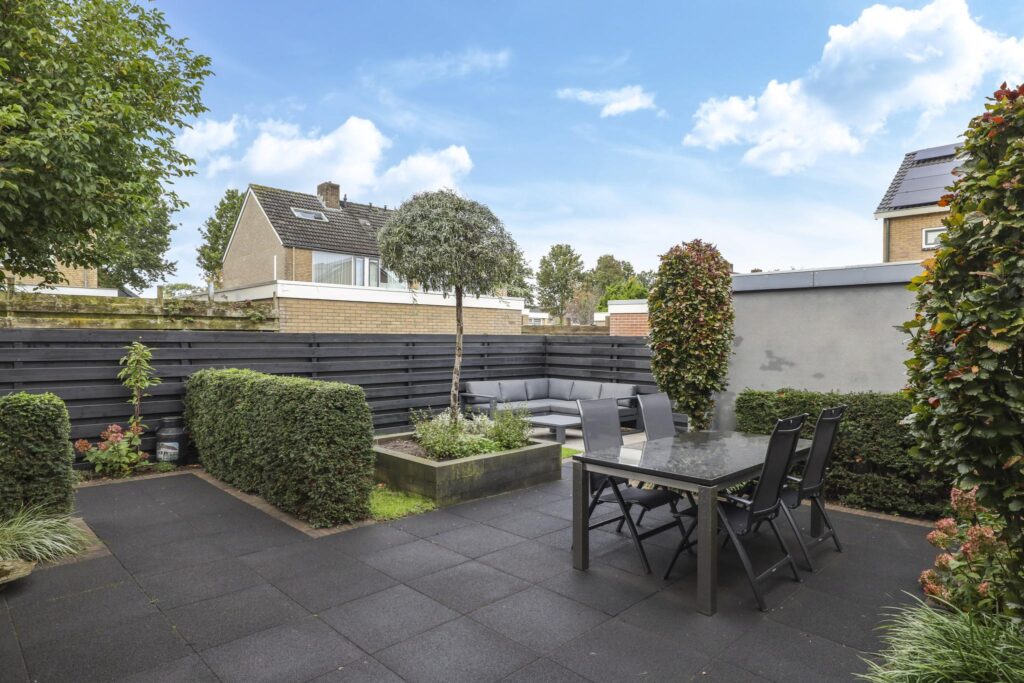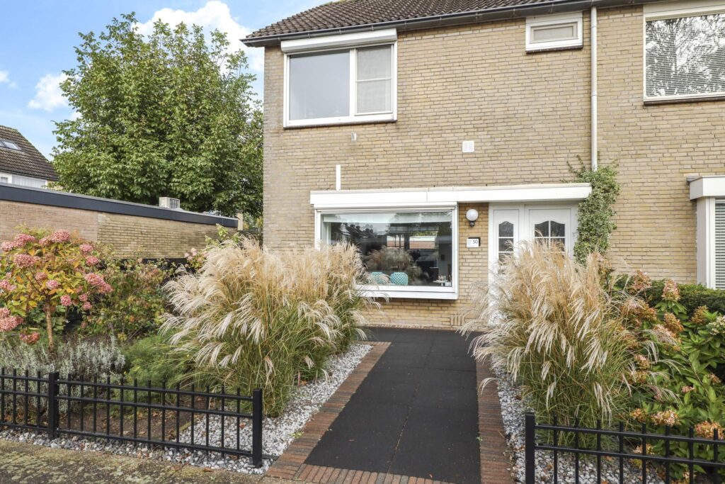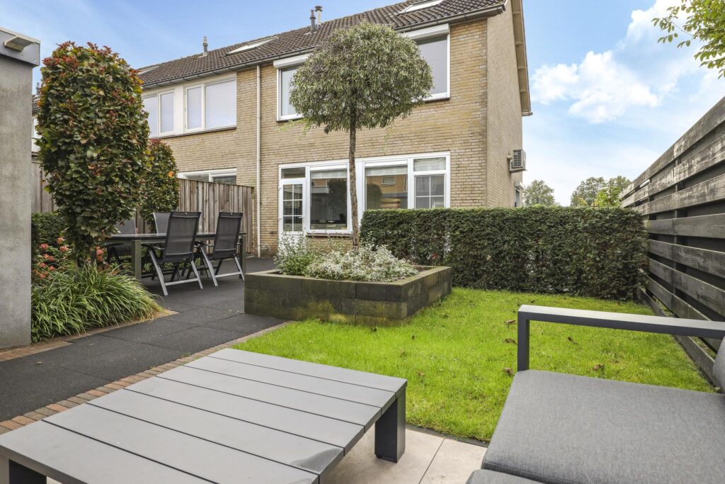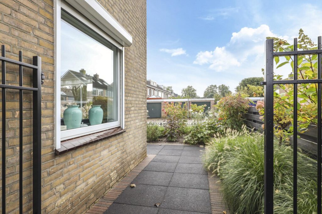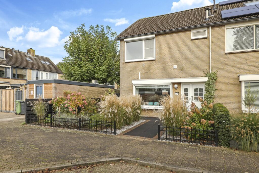 Wanneer je de auto voor de deur hebt geparkeerd en de auto uitstapt, zal je meteen de verzorgde onderhoudsstaat van de voortuin opvallen. Sierlijke grassen, antracietkleurig split en groot formaat tegels maken de voortuin tot een overzichtelijk en strak geheel. Deze verzorgde tuinaanleg loopt door aan de zijkant van de woning waar een stijlvolle poort toegang verleend tot de achtertuin. En doordat de zijtuin bijna 3 meter is, is ook de achtertuin ook een stuk breder dan de gemiddelde tuin in de wijk (9 meter breed).