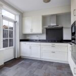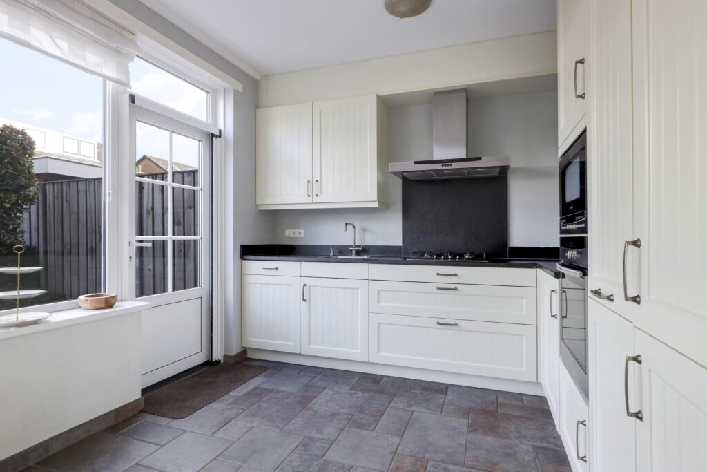 De keuken is aan de achterzijde gelegen en heeft een verrassend ruime hoekopstelling. Het open karakter naar de eethoek en de grote ramen versterken het ruime gevoel. De keukenopstelling is modern en compleet te noemen waarbij het zwartgranieten aanrechtblad met gebrande afwerking voor een luxe uitstraling zorgt. De inbouwapparatuur bestaat uit een vaatwasser, een koel/vriescombi, een grote oven, een aparte magnetron, een 4-pits gaskookplaat en een afzuigschouw. Ook is er goed nagedacht over de kastruimte waaronder een brede, hoge apothekerskast, 120cm brede ladekorven en een luxe Le Mans-slede waardoor de hoekkast optimaal te benutten is. Dimbare inbouwspots maken het geheel af. En niet te vergeten de tuindeur waardoor je direct vanuit de keuken het buitenterras oploopt.