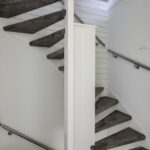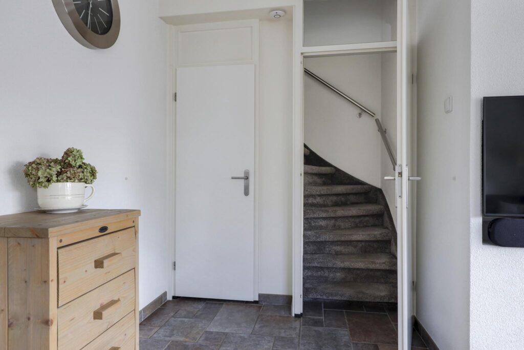 De speelse indeling komt verder tot uiting doordat de hal/entree is losgekoppeld van de trapopgang die in de woonkamer te vinden is. Om de warmte niet naar boven verloren te laten gaan, is het trappenhuis met een deur afsluitbaar. Tegelijkertijd is er onder de trap een erg handige trap/voorraadkast gecreëerd.