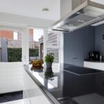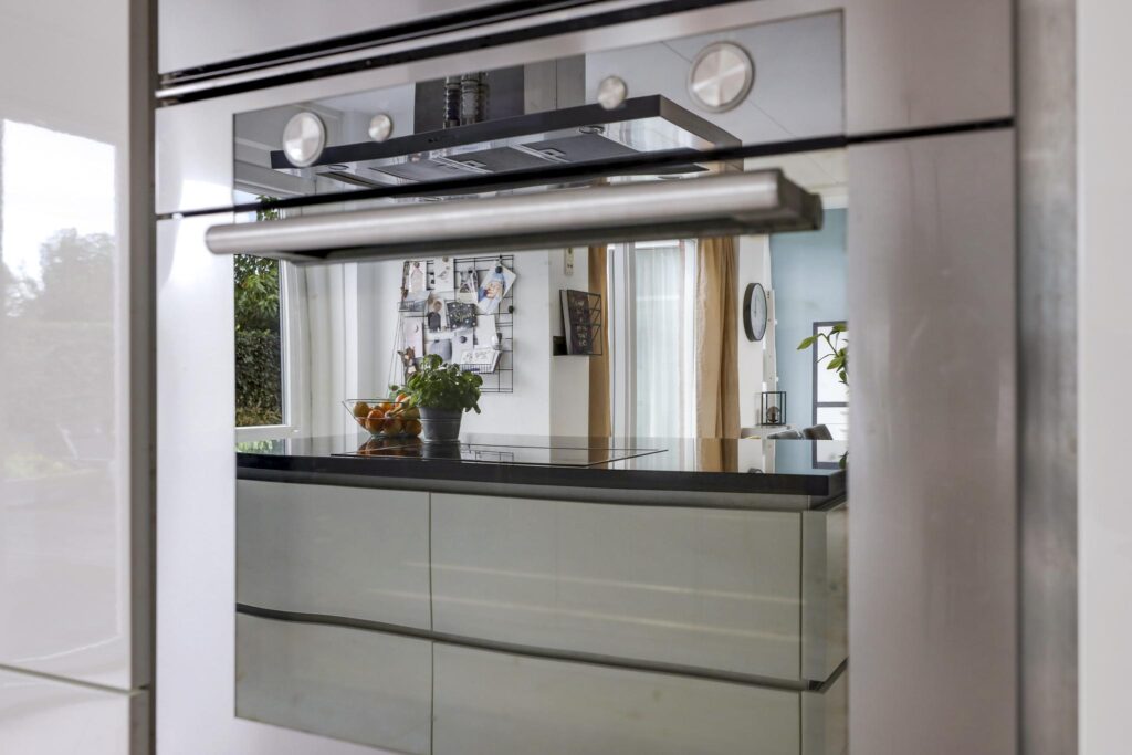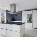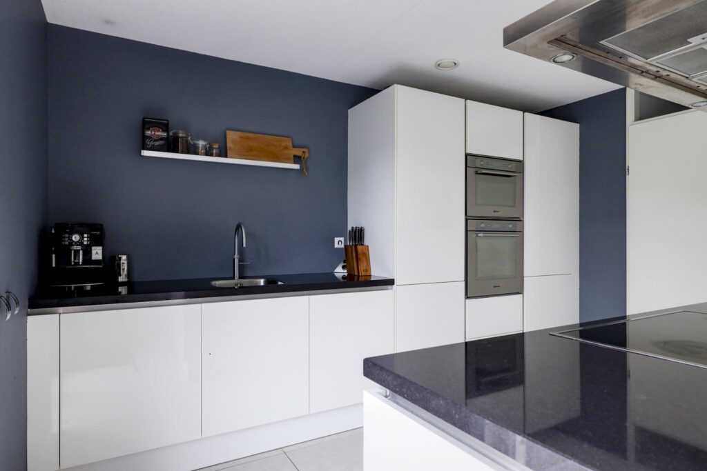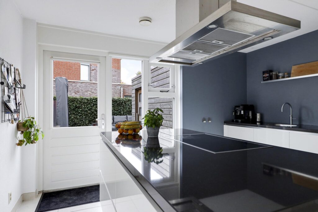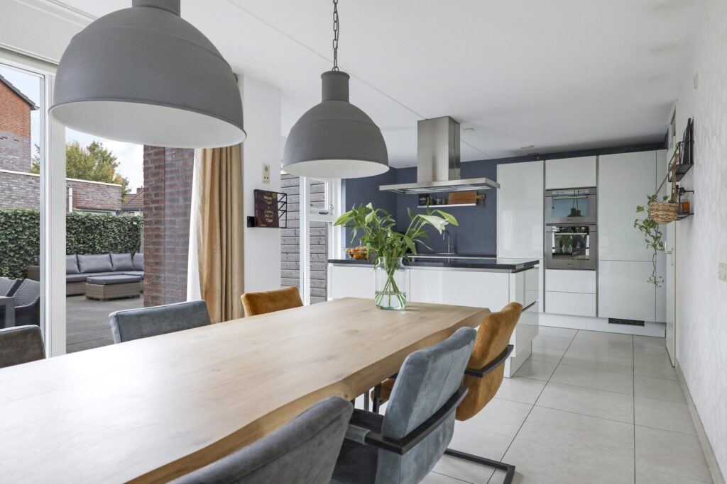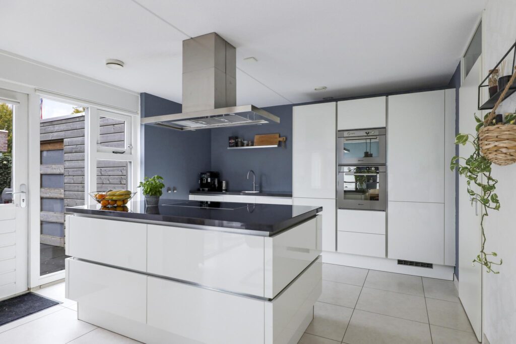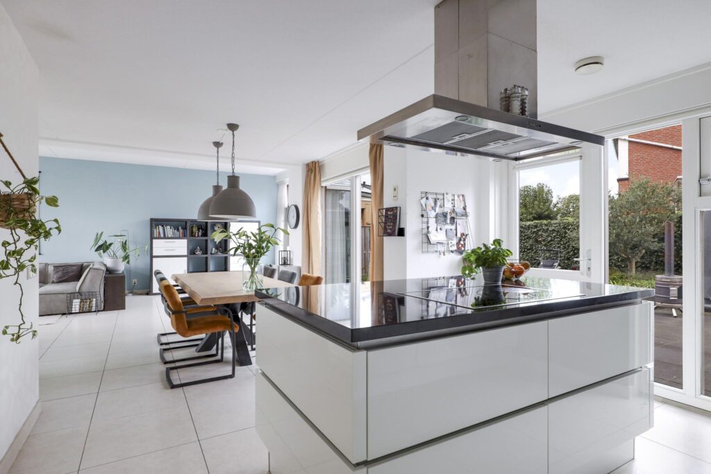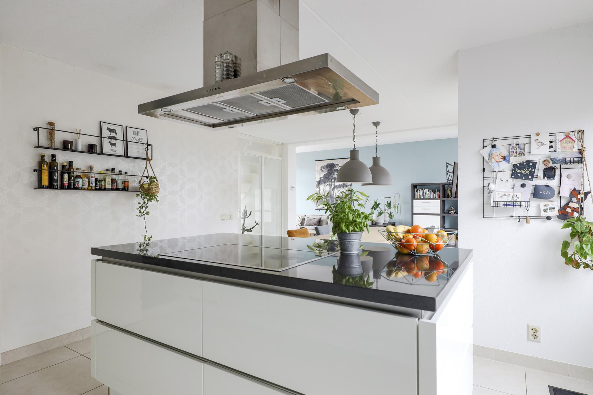 Deze woning heeft een moderne en trendy keuken. Er is gekozen voor een keukenopstelling met een kookeiland, erg prettig hierbij is dat je tijdens het koken zicht hebt richting de woning. Je kan eenvoudig contact houden met je tafelgasten. Tegen de achterwand is een recht keukenblok geplaatst, hierbij is een afwisseling gemaakt tussen hoge en lage kasten voor de perfecte combinatie tussen inbouwapparatuur en werkruimte. Bij deze keuken is aan alle wenselijke inbouwapparatuur gedacht, zijnde een inductiekookplaat, een afzuigkap, een oven, een combi-oven/magnetron, een koel/vriescombinatie en een vaatwasser. Natuurlijk mag de Quooker voor direct kokend water niet ontbreken. Achter de witte fronten vind je praktische kastruimte zoals brede ladekorven en een verdekte besteklade. Het verzorgde afwerkingsniveau van de woonkamer is doorgetrokken in de keuken. Naast de brede schuifpui van de woonkamer is er nog een extra loopdeur die direct toegang geeft tot het buitenterras.