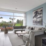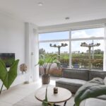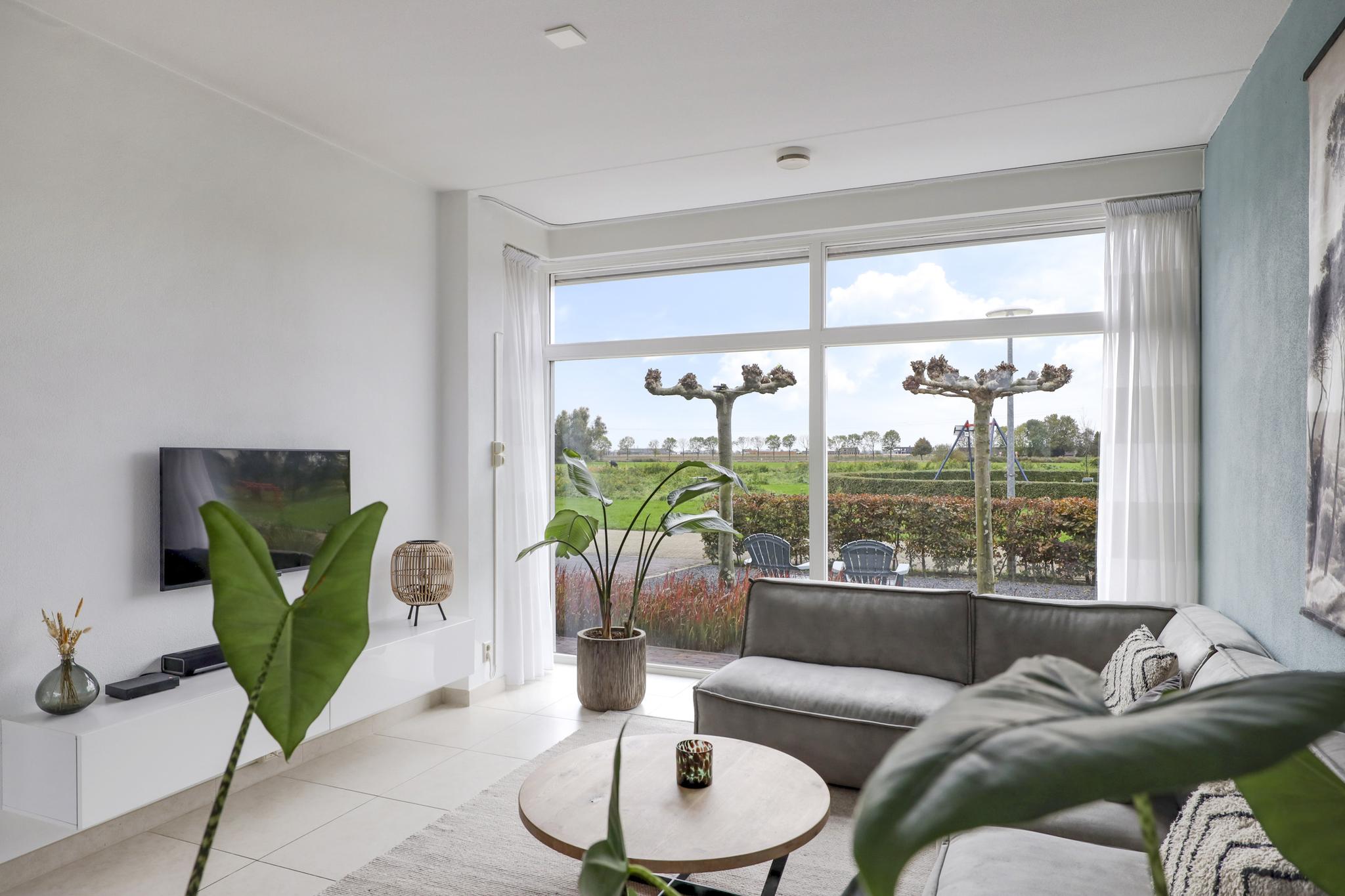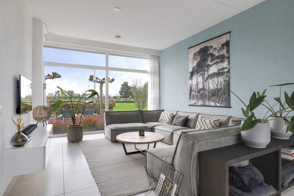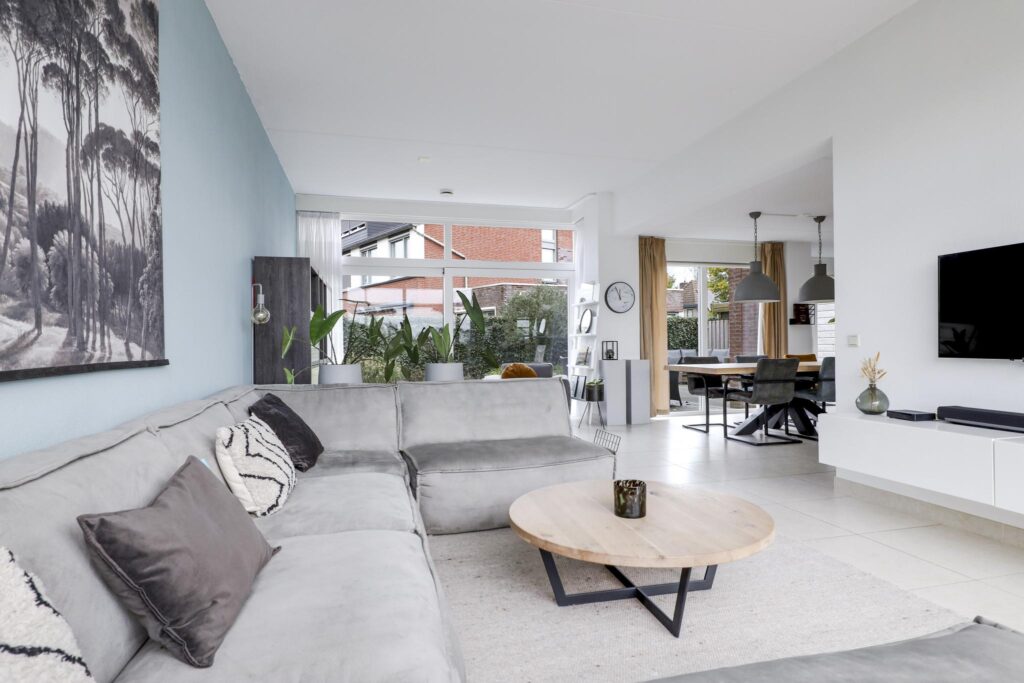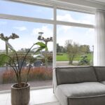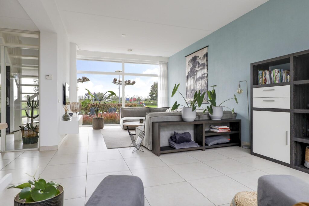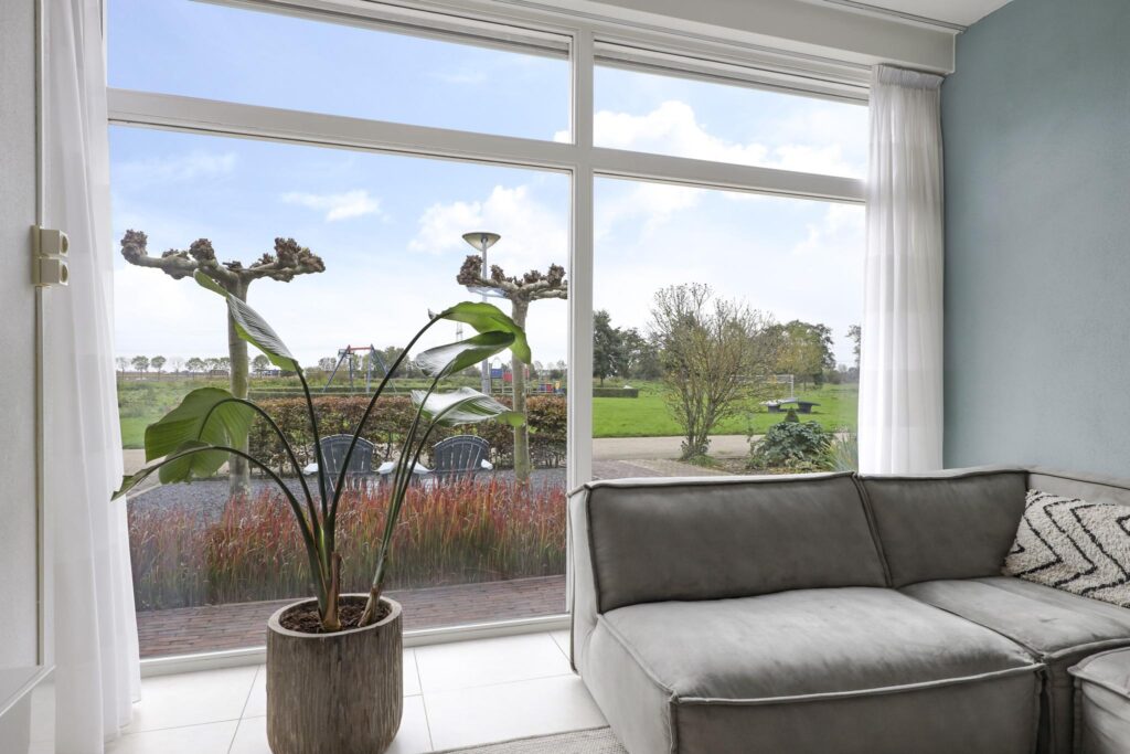 Woonkamer met grote glaspuien en schuifpui
