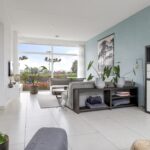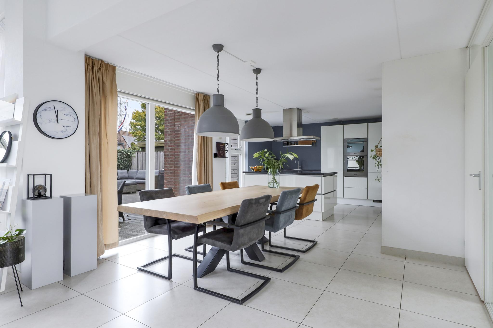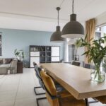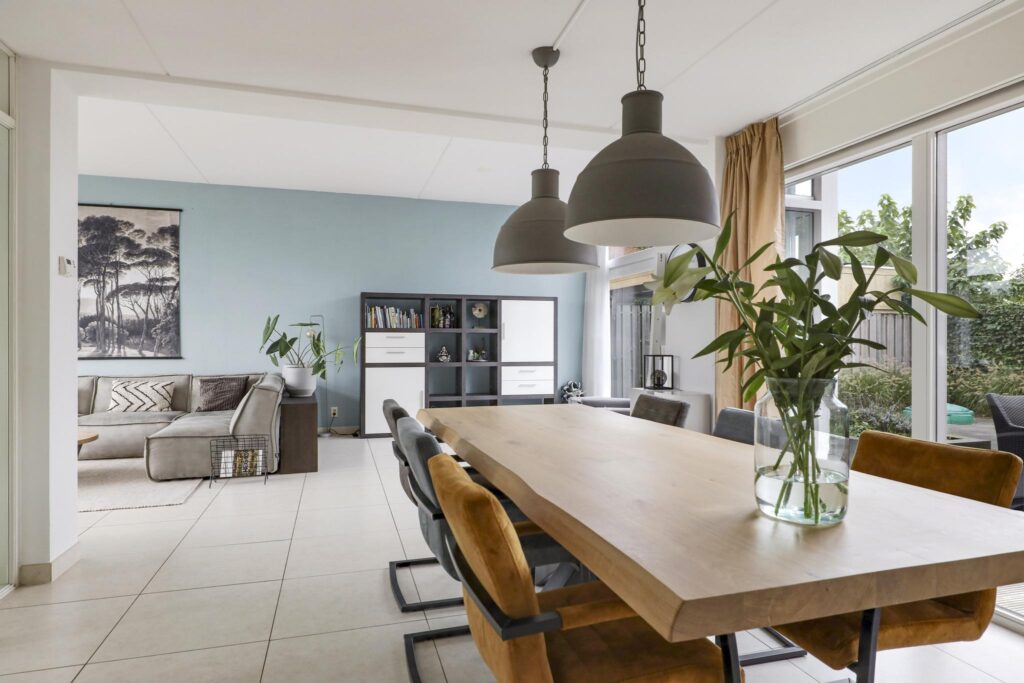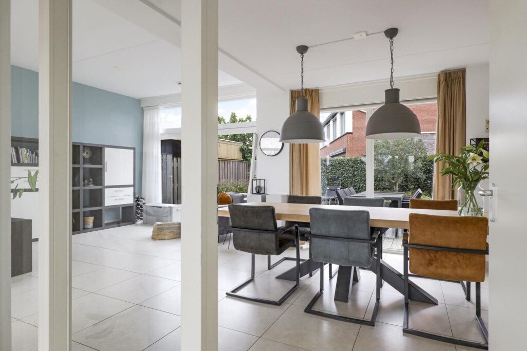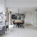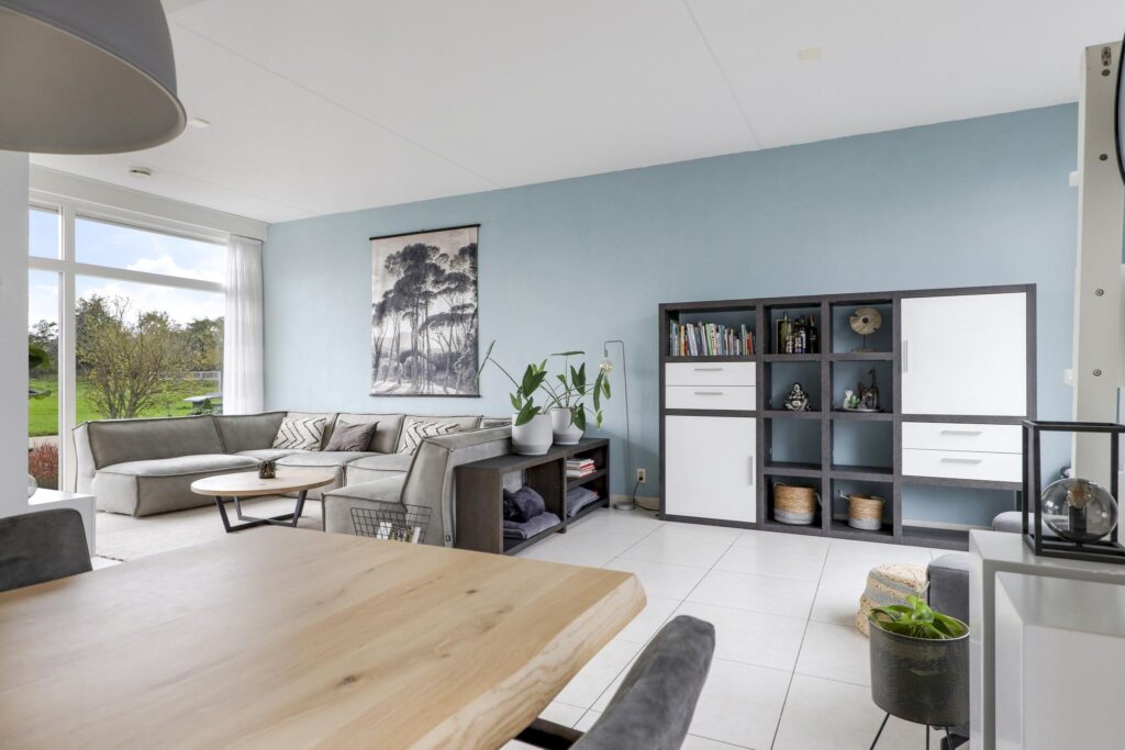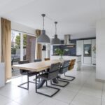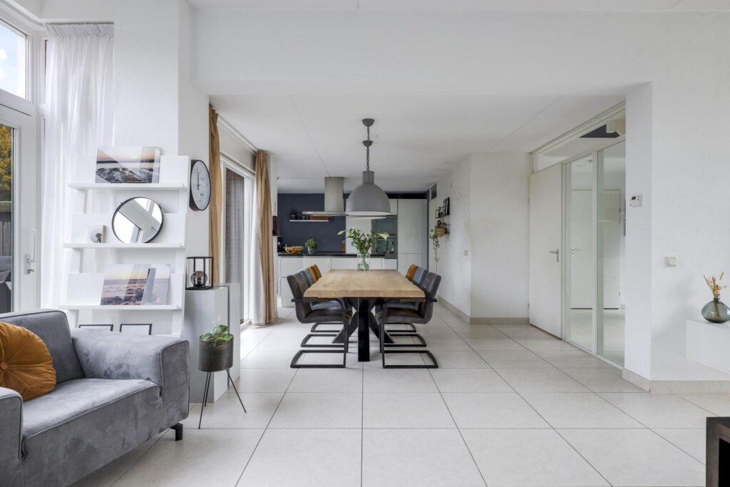 Wanneer je op zoek ben naar een unieke living, ben je bij deze woning zeker aan het juiste adres. De hoogte van het plafond en de maximaal grote raampartijen maken de beleving in deze woning uniek! Daarbij kijk je aan de voorzijde uit over veel groen waardoor je een vrij gevoel ervaart. De woonkamer is royaal opgezet waardoor je hier naast een grote bank en een 6-persoons eettafel ook nog ruimte hebt voor een grote kast en een 2e zithoek. Op de vloer liggen grote tegels welke aangenaam worden verwarmd door de vloerverwarming. In de zomer laat je de vloerverwarming koelen waardoor het nooit te warm wordt in de woning. Een grote schuifpui geeft in de zomerdag direct toegang tot de achtertuin.
