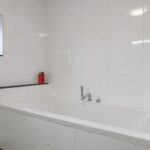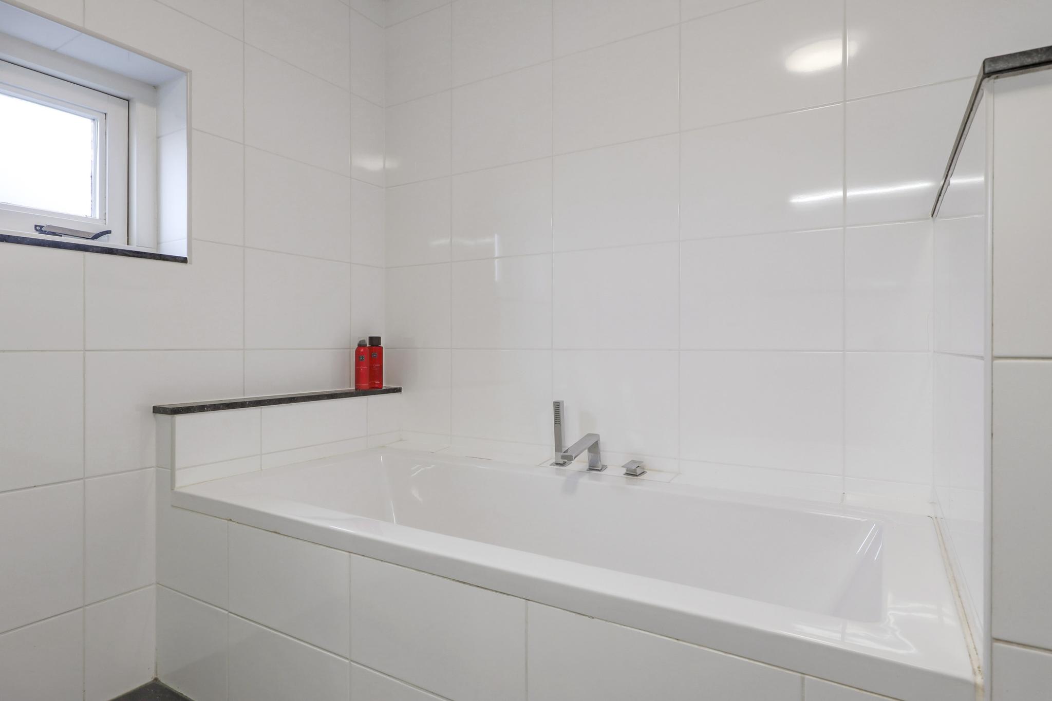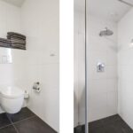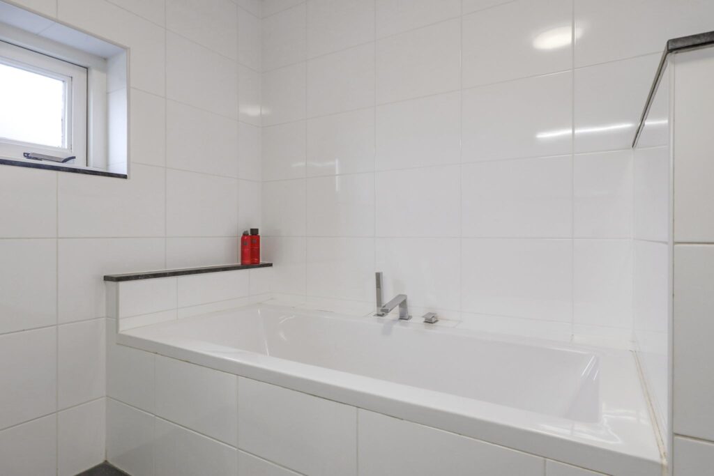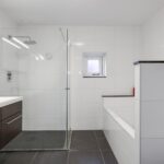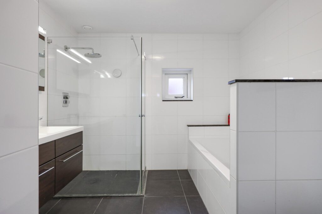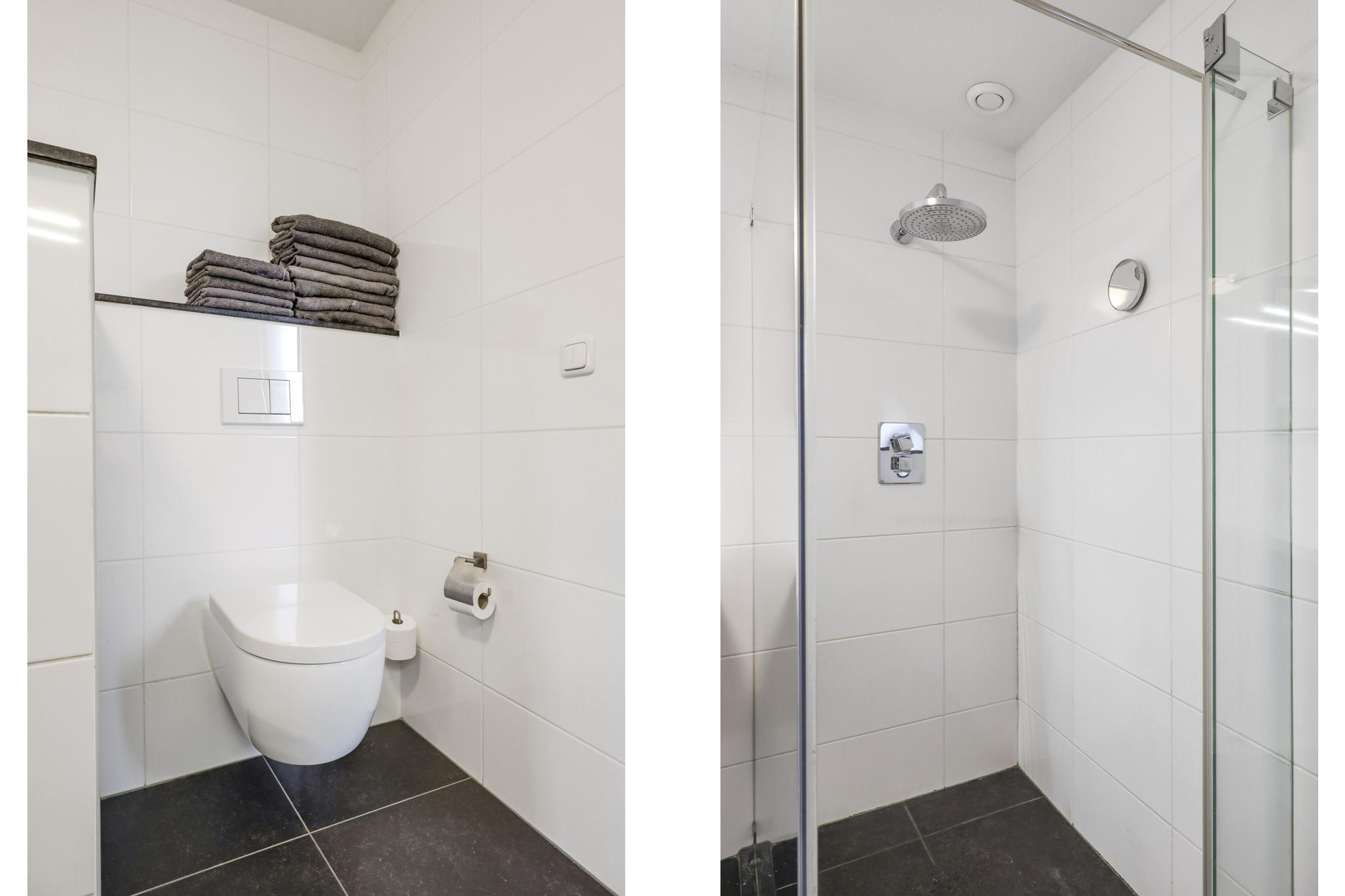 Net als de rest van de woning is ook de badkamer modern en stijlvol. Door de ruime opzet is er gekozen voor een ligbad en een separate inloopdouche. De douche heeft een glazen scheidingswand en een drainafvoer. Stijlvol is het in de wand weggewerkte leidingwerk. Uiteraard ontbreekt het 2e toilet hier niet, deze is zwevend geplaatst. Om het helemaal af te maken is er gekozen voor een dubbel wastafelmeubel met diepe lades voor veel opbergruimte. Het tegelwerk is neutraal in de klassieke combinatie van wit en antraciet waarbij gekozen is voor een groot formaat tegel. Uiteraard ligt ook hier vloerverwarming. Een raam zorgt voor lichtinval en een ventilatiemogelijkheid, er is tevens mechanische ventilatie aanwezig.