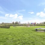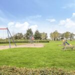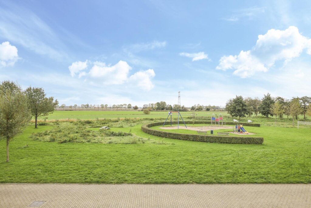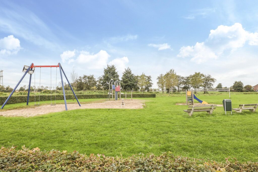 Speelweide met speeltoestellen voor de deur