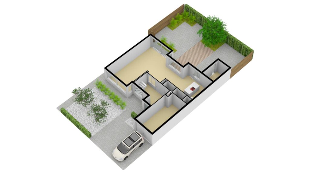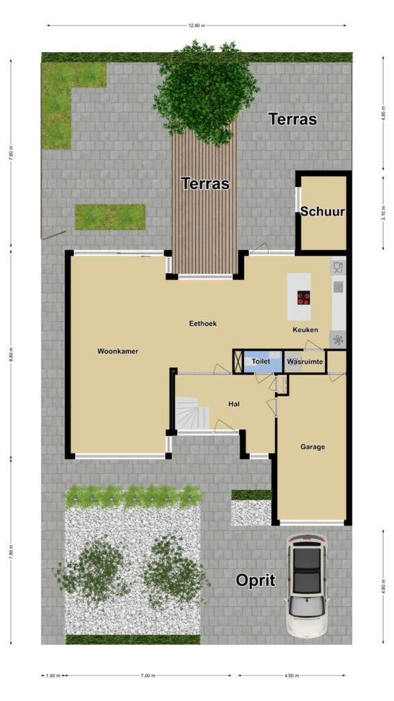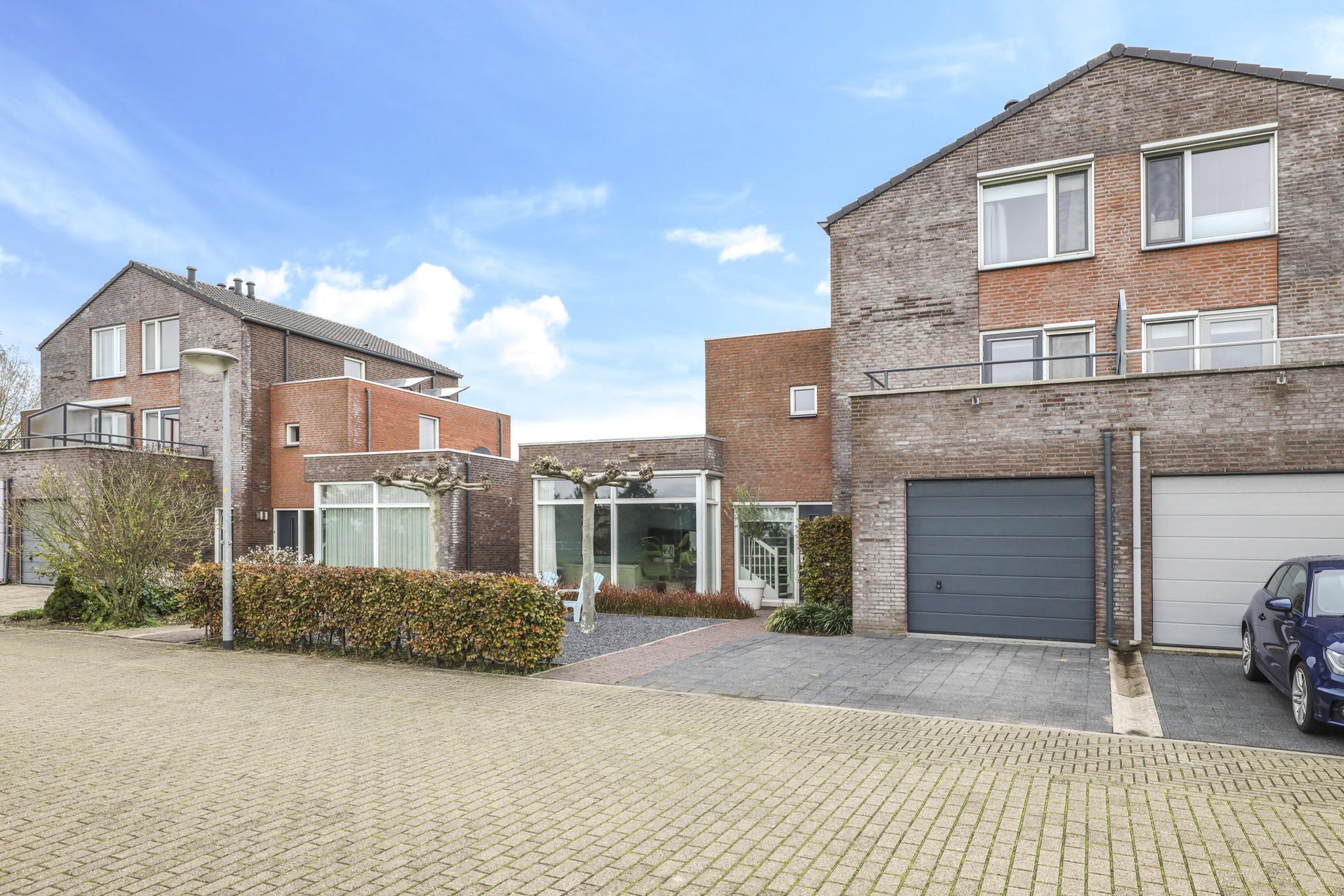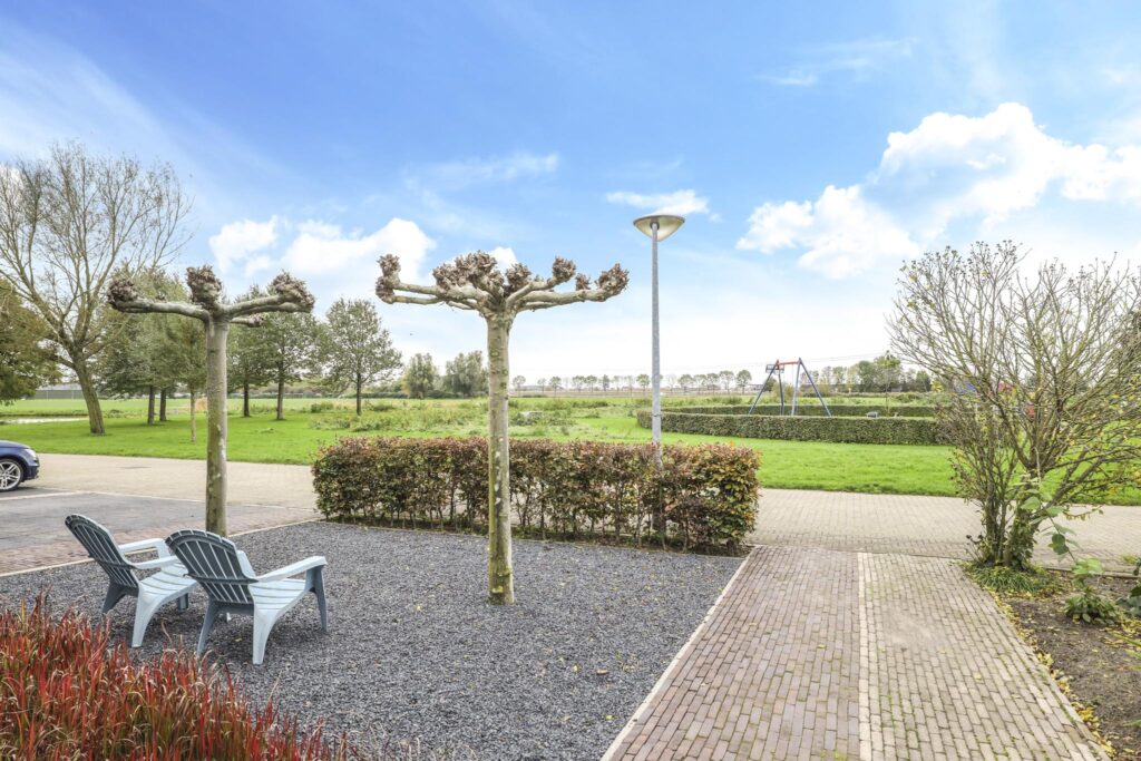 Vóór de garage ligt een comfortabele oprit waar je met 2 auto’s naast elkaar op eigen terrein kunt parkeren. Hierdoor hoef je elkaar niet in de weg te staan.