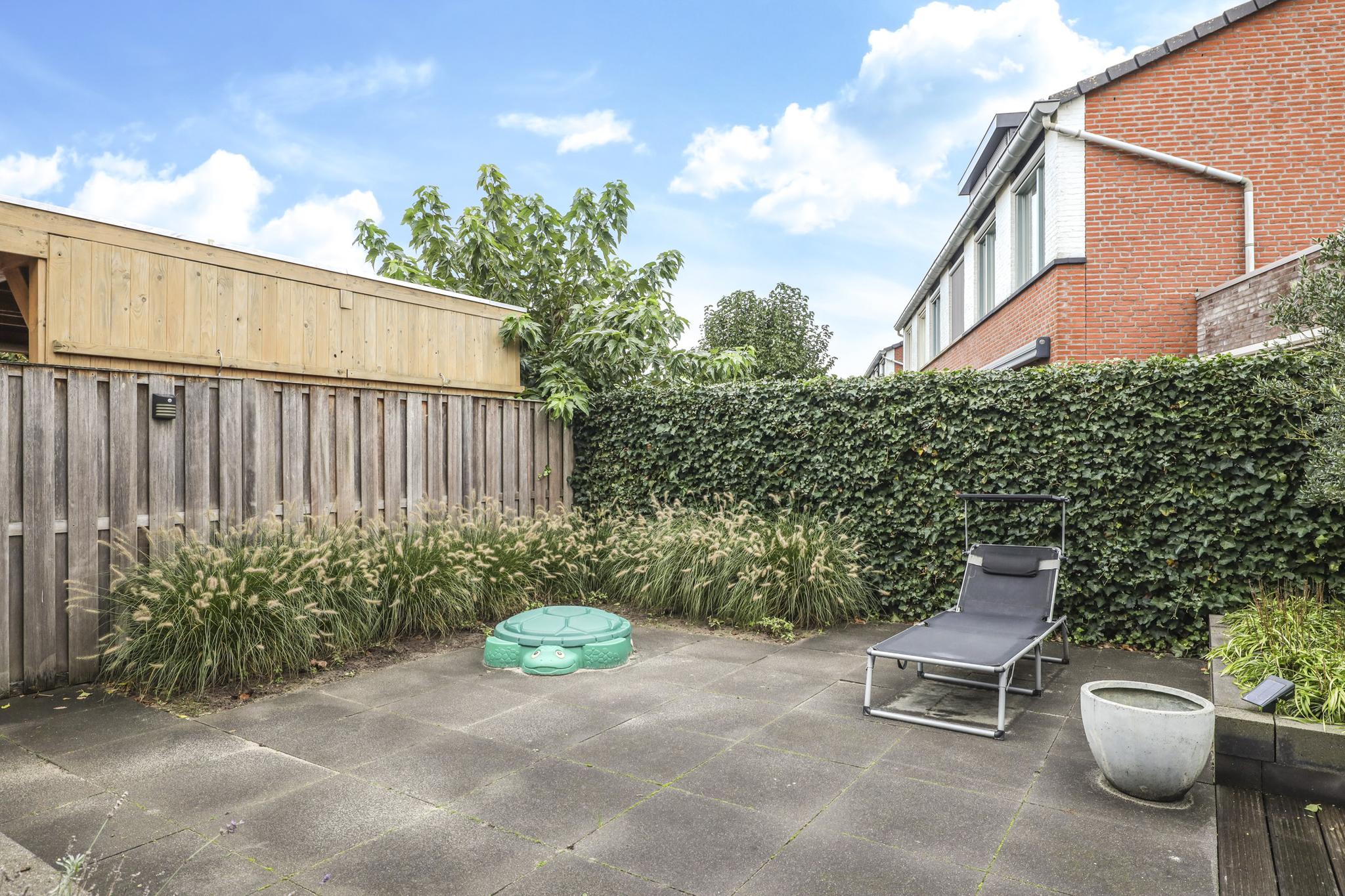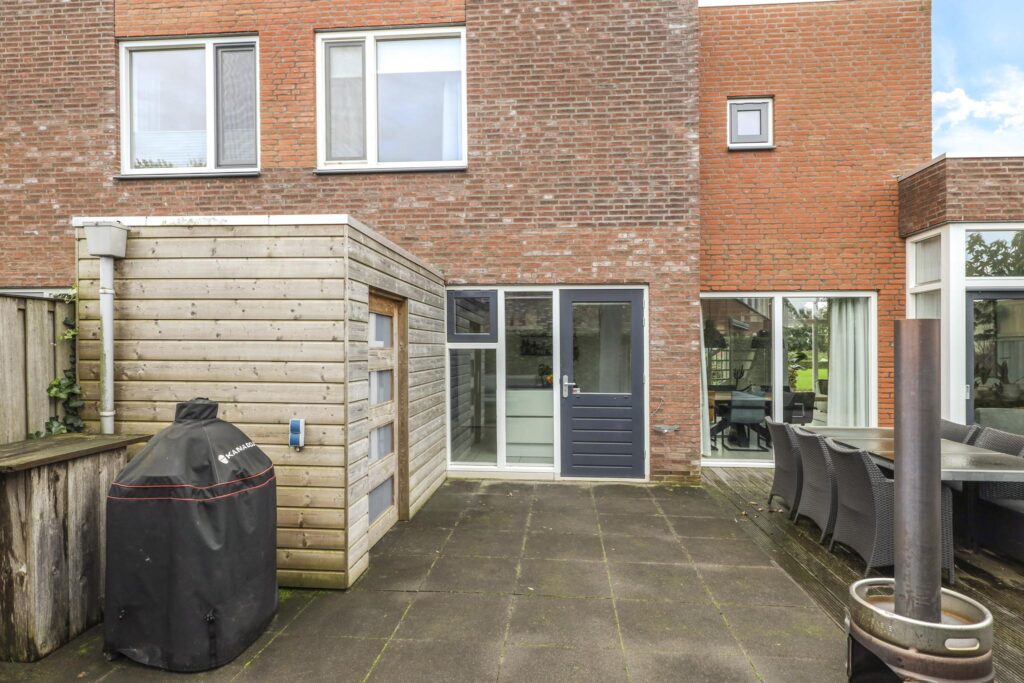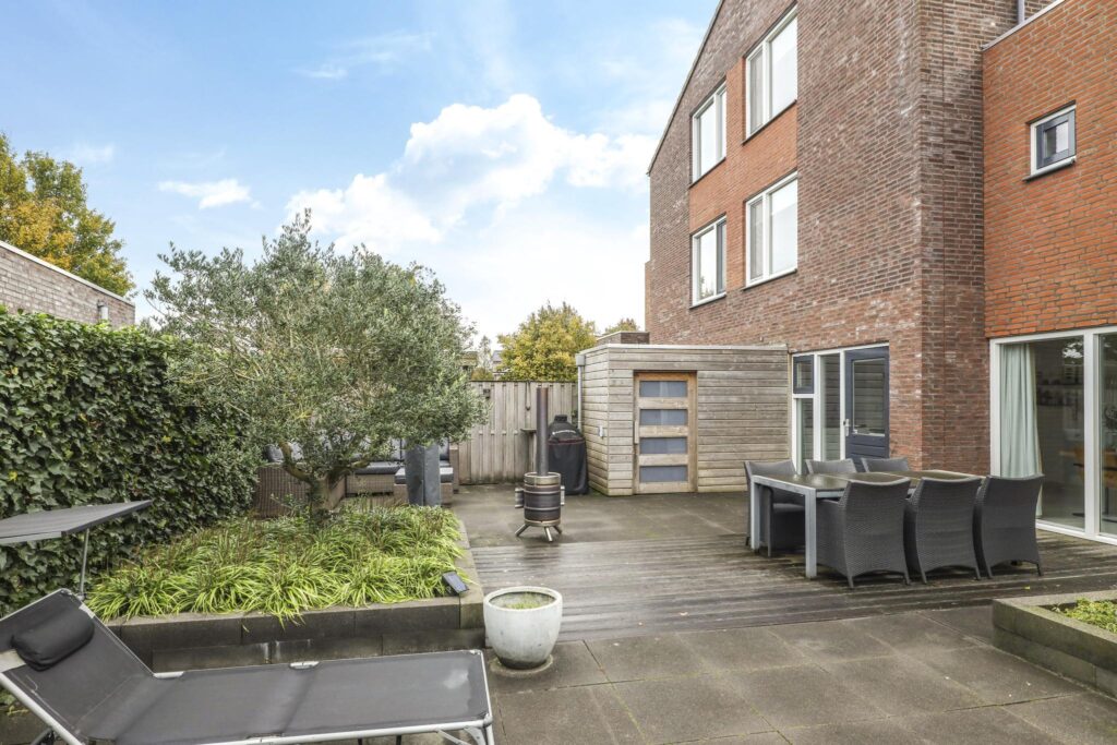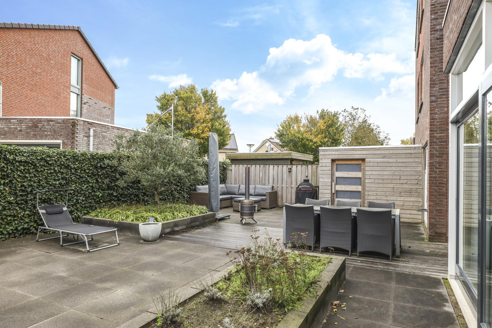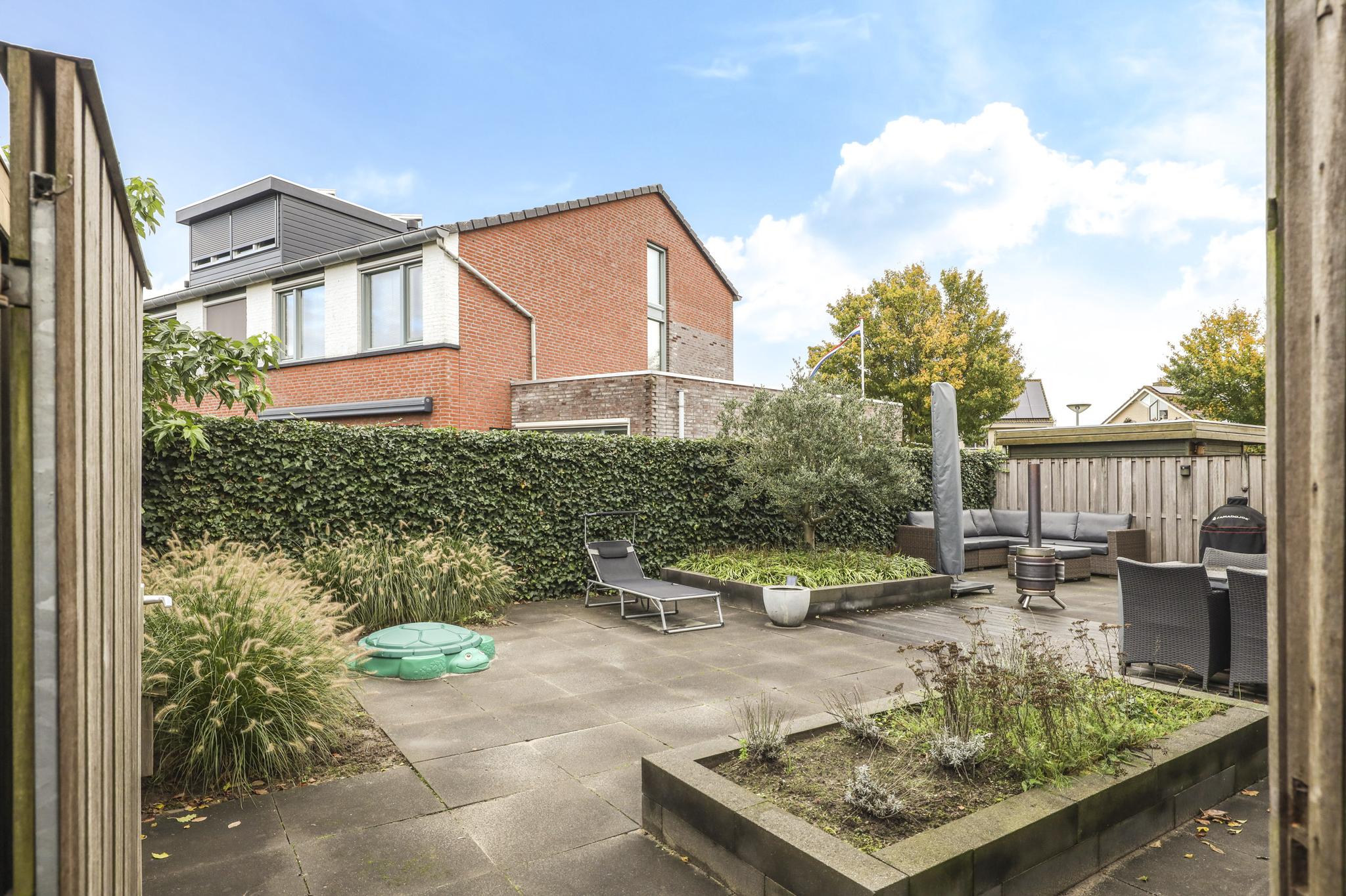 Niet alleen de woning heeft veel te bieden, ook de achtertuin heeft grote pluspunten. Alleen al het formaat is groter dan in een gemiddelde nieuwbouwwijk (ca. 8m diep en 12,5m breed). Door de brede opzet van de woning zie je dit ook in de achtertuin terug. Door deze opzet kan je hier eenvoudig meerdere terrassen kwijt. Diverse groenborders en een groene erfafscheiding aan de achterzijde zorgen voor een natuurlijke uitstraling. Een leuk details is de afwisseling tussen een groot formaat tegels en houten vlonders waardoor de tuin als het ware wordt verdeeld. Prettig is dat de achtergelegen woning haaks op de achtertuin staan waardoor je van veel privacy geniet. In de hoek van de tuin staat nog een houten schuur met schuifdeur, hierdoor heb je de tuinspullen of de tuinkussens altijd bij de hand. Aan de linkerzijde van de woning is een achterom aanwezig.