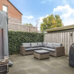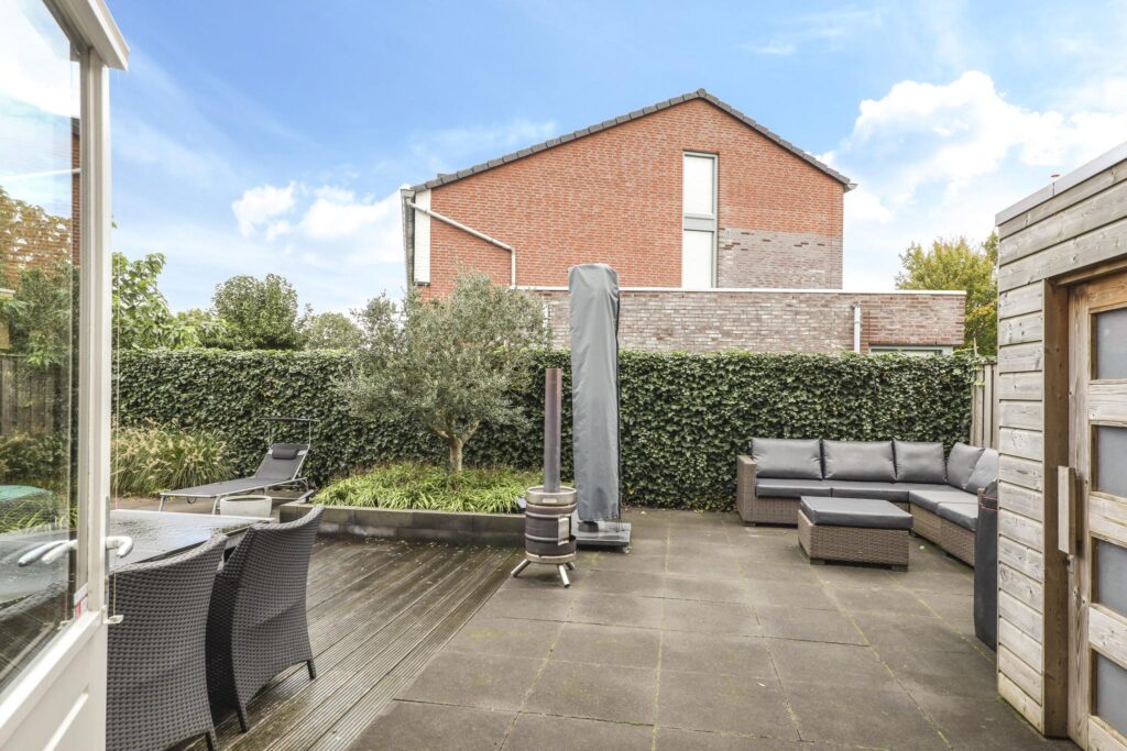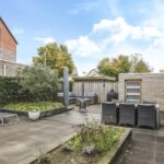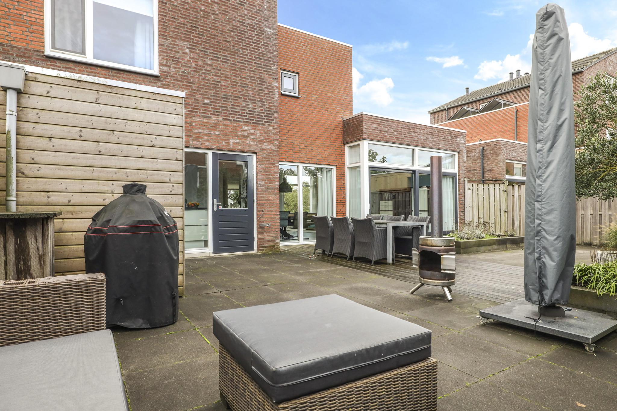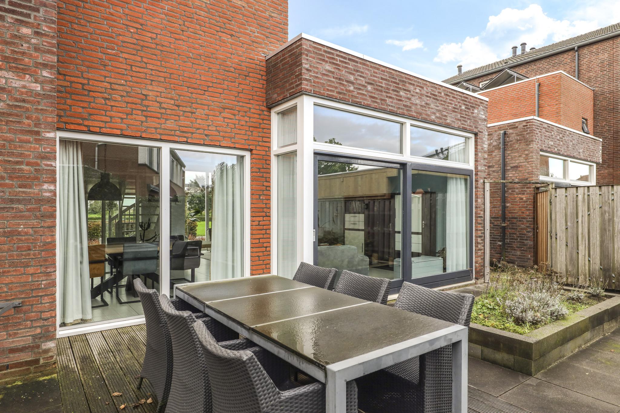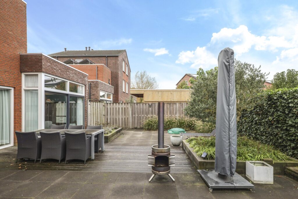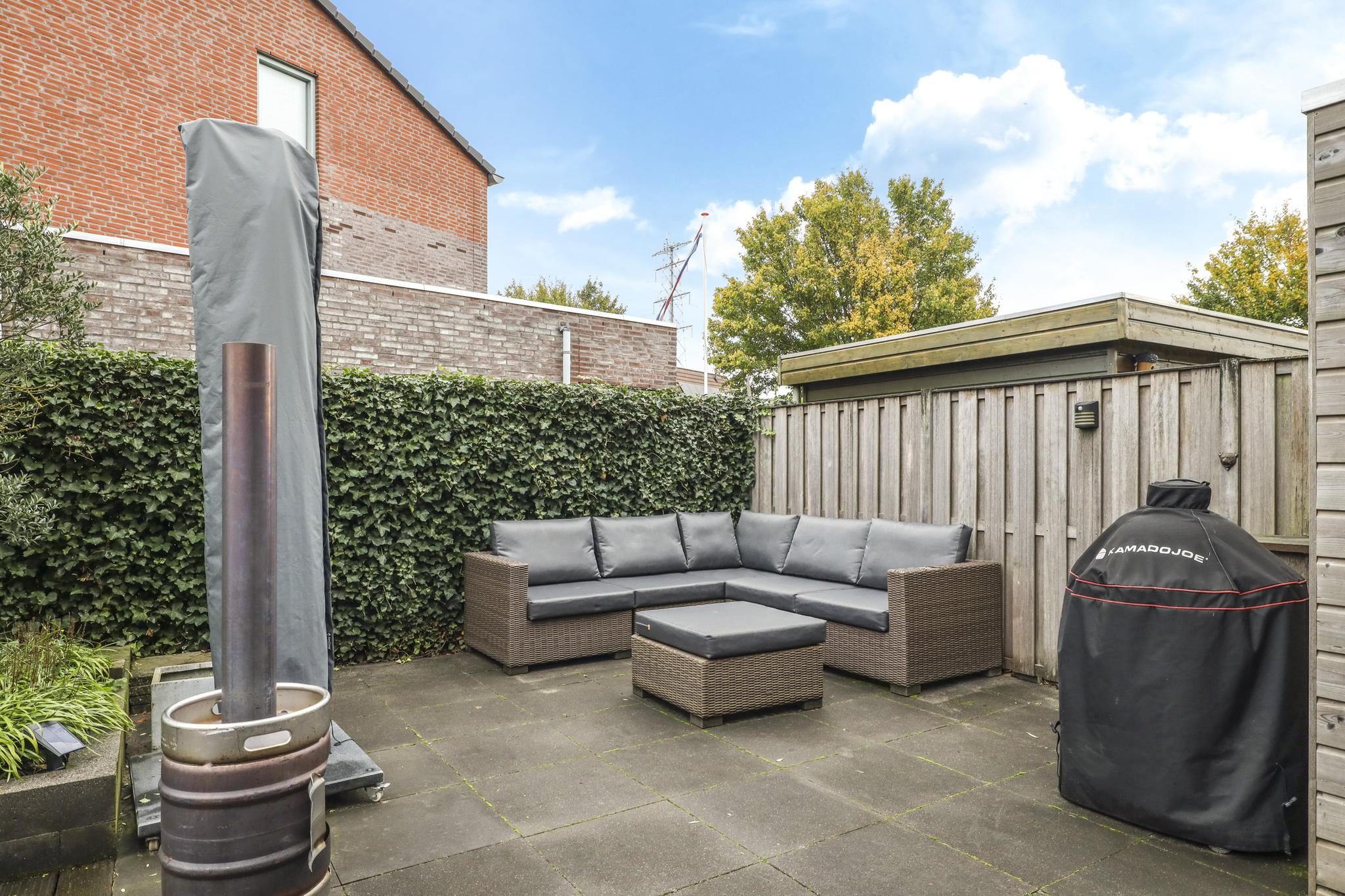 Niet alleen de woning heeft veel te bieden, ook de achtertuin heeft grote pluspunten. Alleen al het formaat is groter dan in een gemiddelde nieuwbouwwijk (ca. 8m diep en 12,5m breed). Door de brede opzet van de woning zie je dit ook in de achtertuin terug. Door deze opzet kan je hier eenvoudig meerdere terrassen kwijt. Diverse groenborders en een groene erfafscheiding aan de achterzijde zorgen voor een natuurlijke uitstraling. Een leuk details is de afwisseling tussen een groot formaat tegels en houten vlonders waardoor de tuin als het ware wordt verdeeld. Prettig is dat de achtergelegen woning haaks op de achtertuin staan waardoor je van veel privacy geniet. In de hoek van de tuin staat nog een houten schuur met schuifdeur, hierdoor heb je de tuinspullen of de tuinkussens altijd bij de hand. Aan de linkerzijde van de woning is een achterom aanwezig.