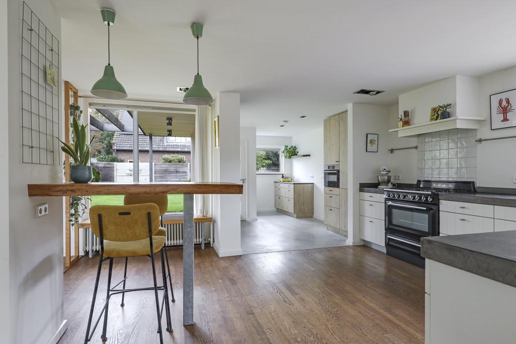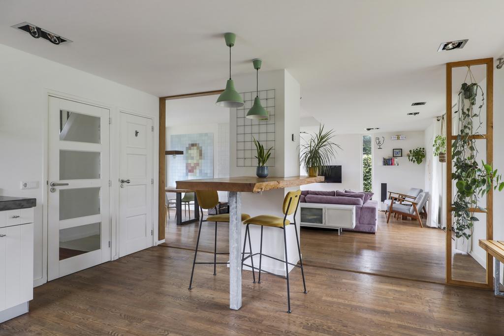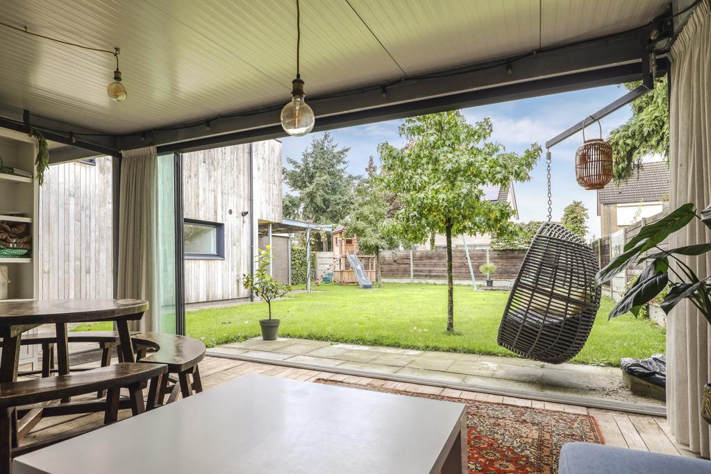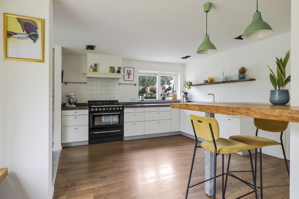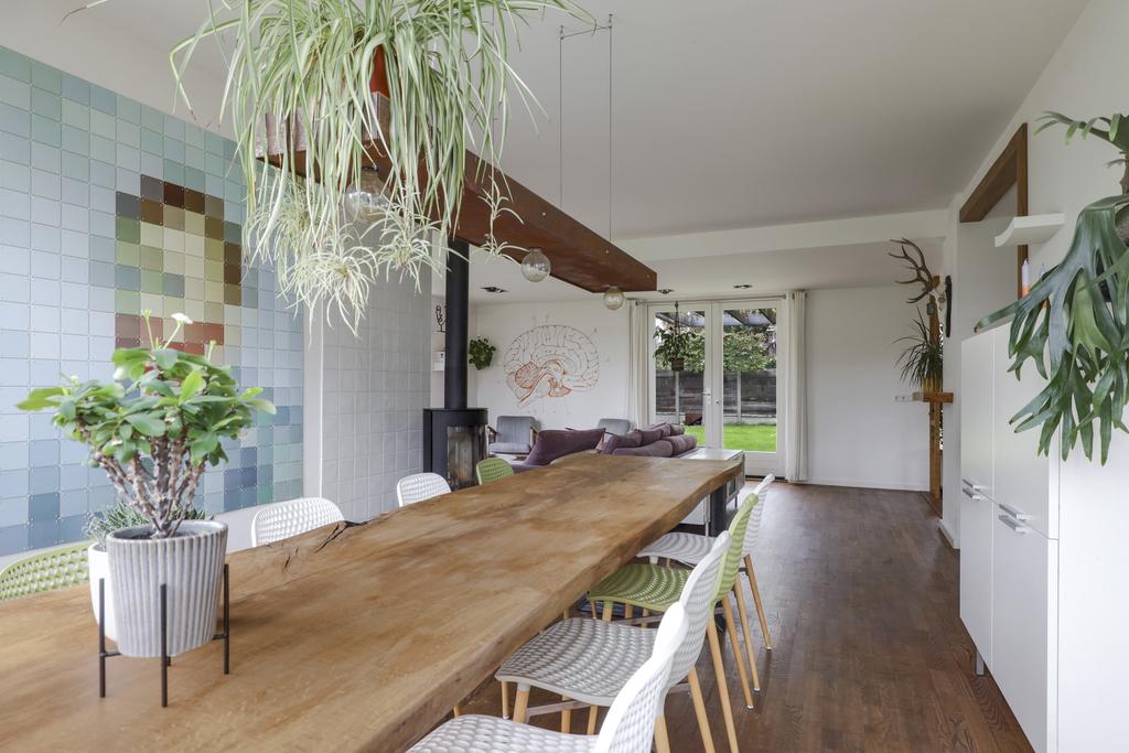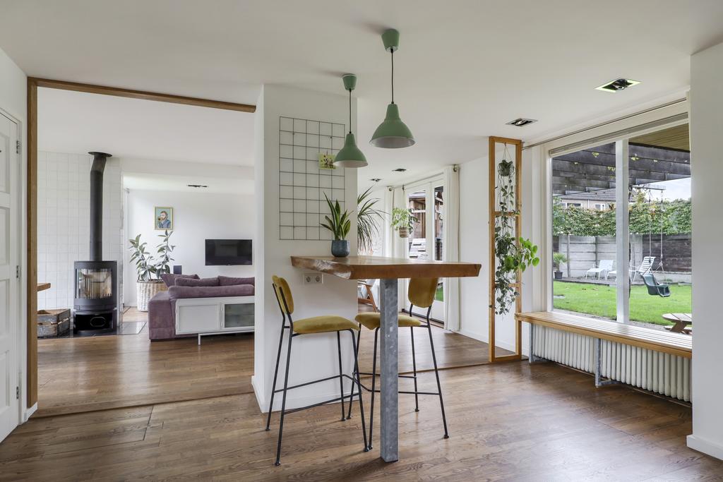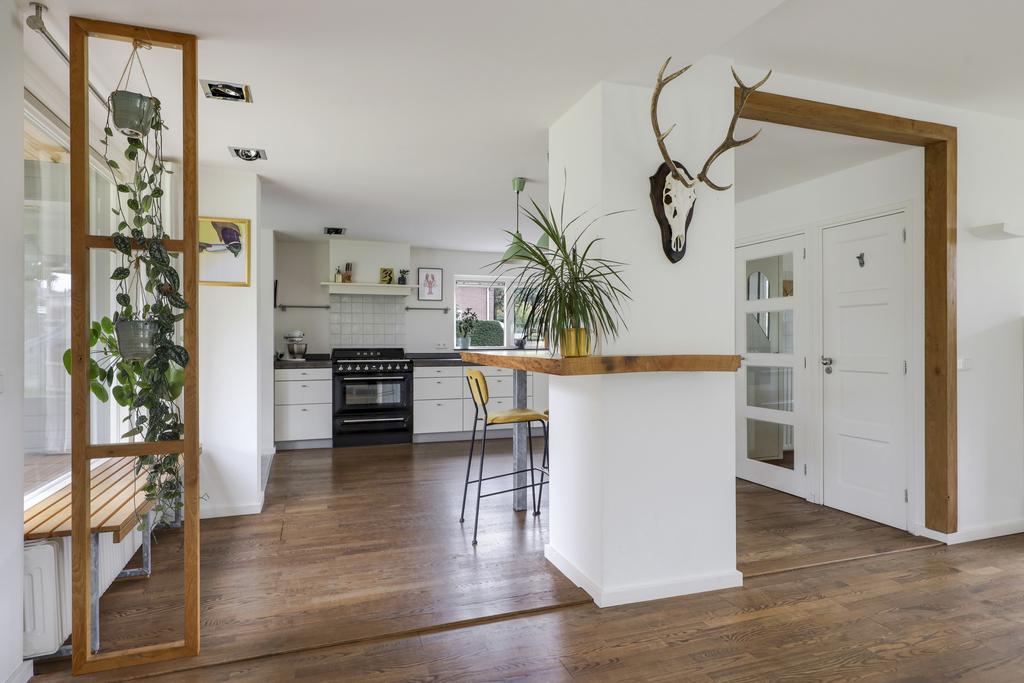 De houten accenten in de keuken zal je vast niet ontgaan. Bijvoorbeeld het zitje boven de radiator (maatwerk), het houten ‘doorkijkframe’ in de overgang naar de woonkamer en de houten bar springen in het oog. Een tuindeur geeft direct toegang tot het buitenterras met (deels) overkapping en pergola.