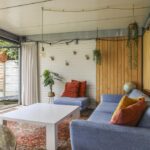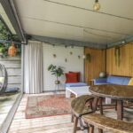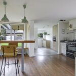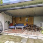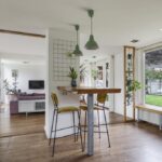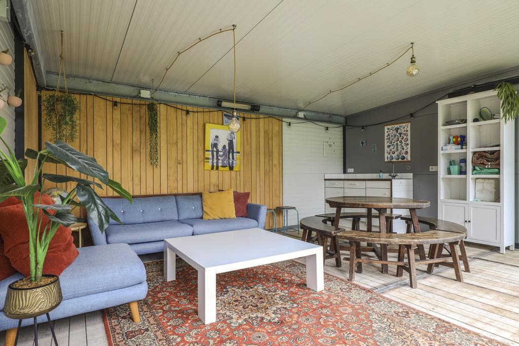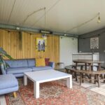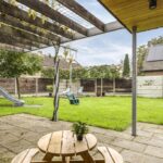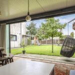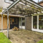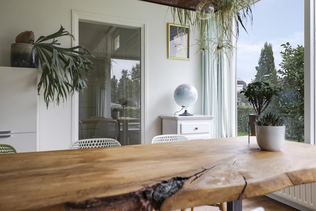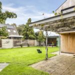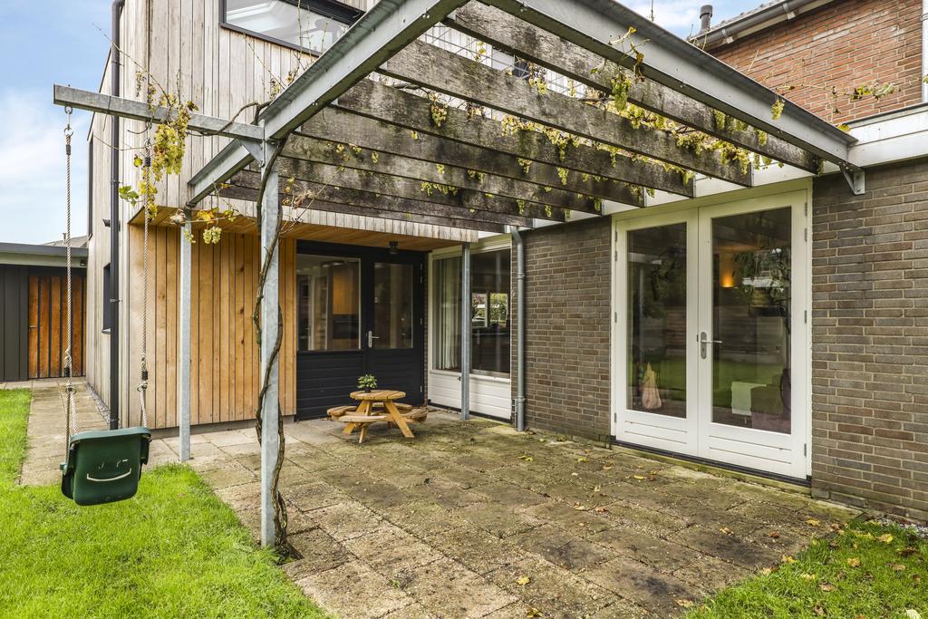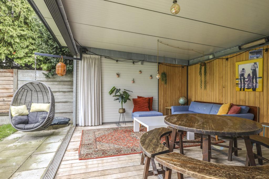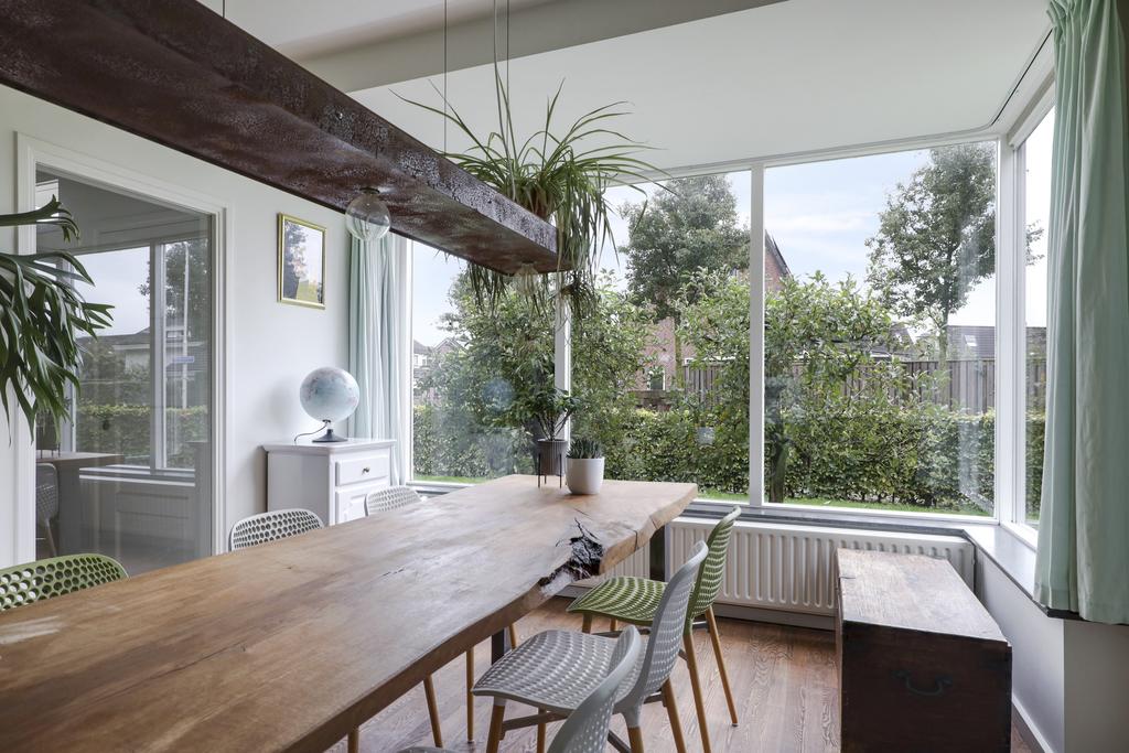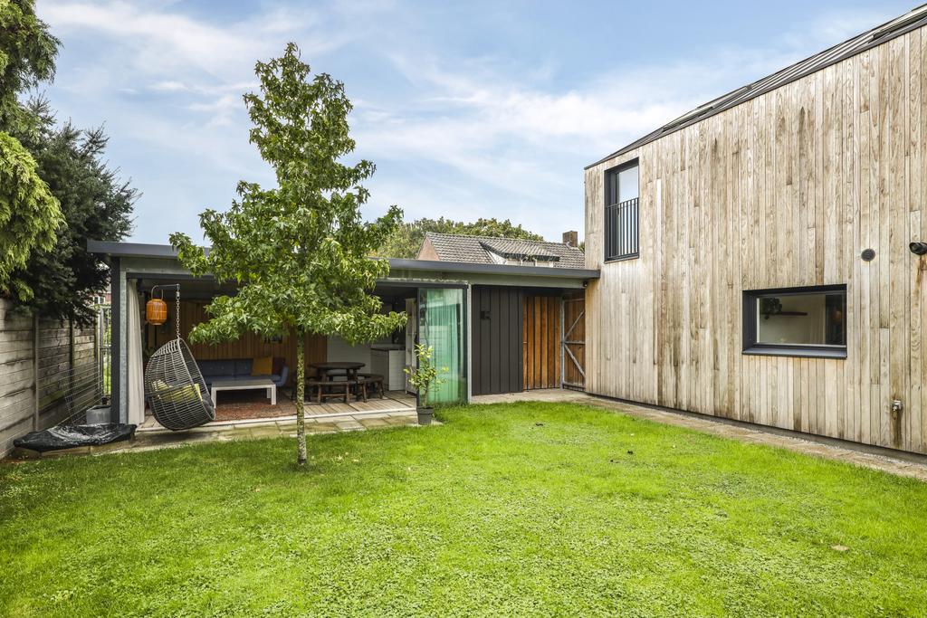 De houten accenten in de keuken zal je vast niet ontgaan. Bijvoorbeeld het zitje boven de radiator (maatwerk), het houten ‘doorkijkframe’ in de overgang naar de woonkamer en de houten bar springen in het oog. Een tuindeur geeft direct toegang tot het buitenterras met (deels) overkapping en pergola.