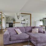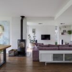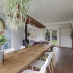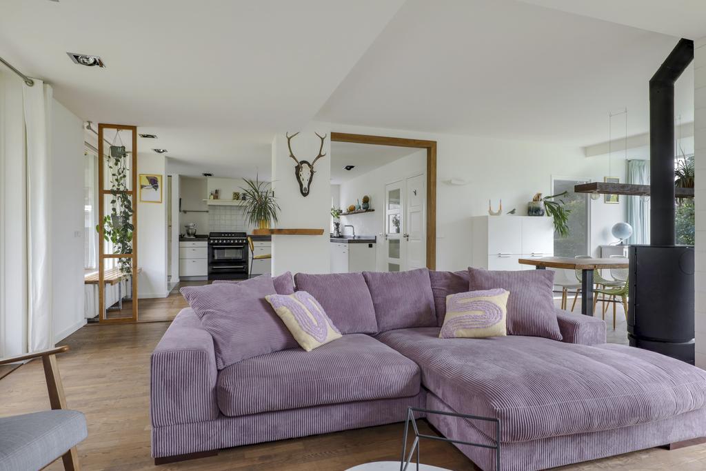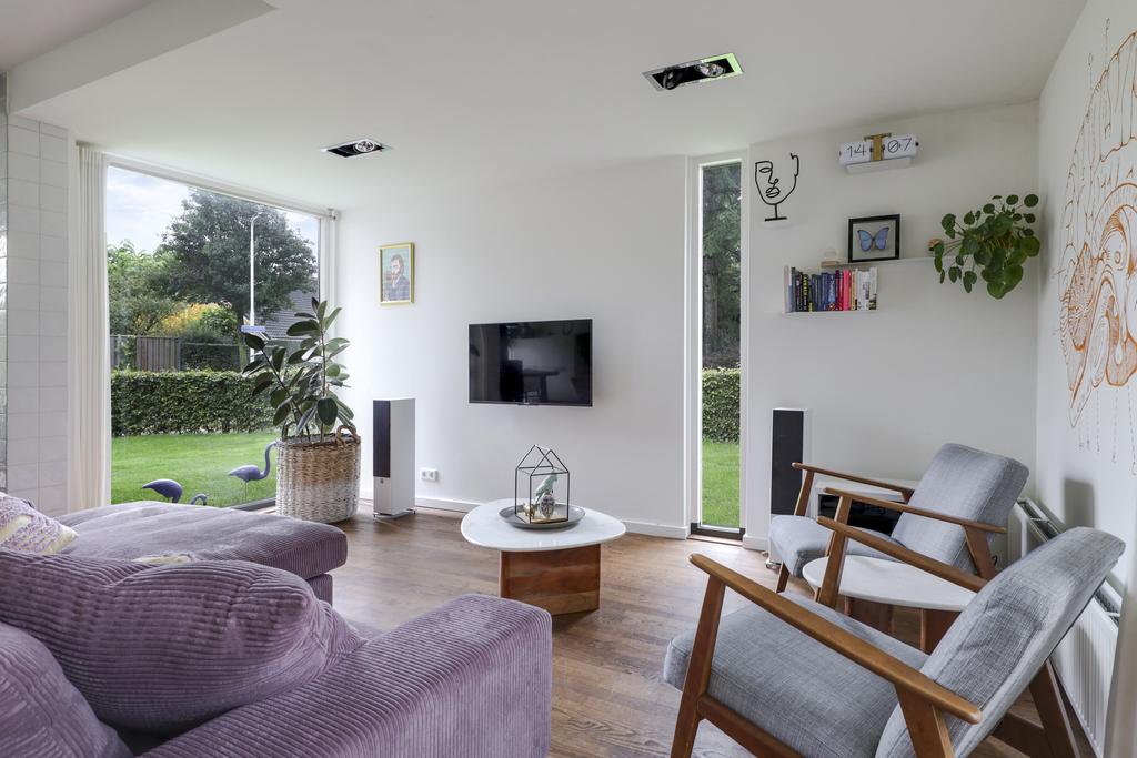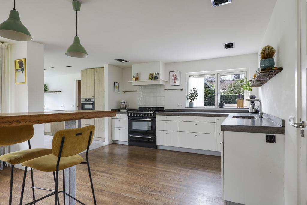 Door de aanbouw is de woonkamer aanzienlijk vergroot waardoor het een gezellige living is geworden. Je kunt er namelijk meerdere zithoeken creëren waarbij de vrijstaande houtkachel mooi centraal in de ruimte staat. In de ene hoek een 6-persoons eettafel, in de zijvleugel een lekkere hoekbank met zicht op het TV-scherm aan de muur. Overigens zou je de eettafel ook in de keuken kwijt kunnen waardoor je een extra zithoek overhoudt. Opvallend detail is het plafond dat deels in hoogte verspringt en is voorzien van stijlvolle inbouwspots. Wat ook direct zal opvallen zijn de verschillende raampartijen waarvan enkele tot aan de vloer doorlopen. Dit geeft niet alleen een bijzonder prettige lichtinval maar ook een speels gezichtsveld in de tuin. De massief essenhouten vloer geeft de woonkamer (en keuken) een warme woonsfeer.