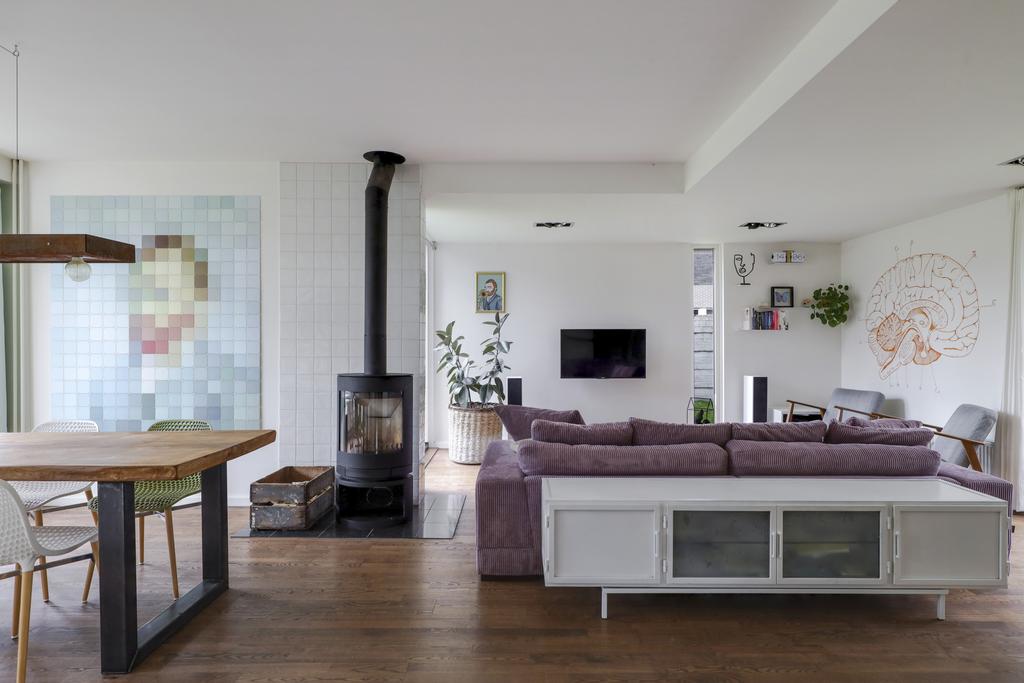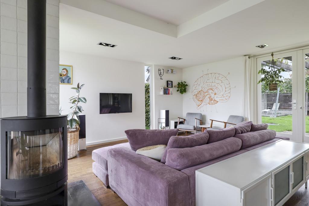 Gezellige woonkamer met 2 zithoeken en houtkachel