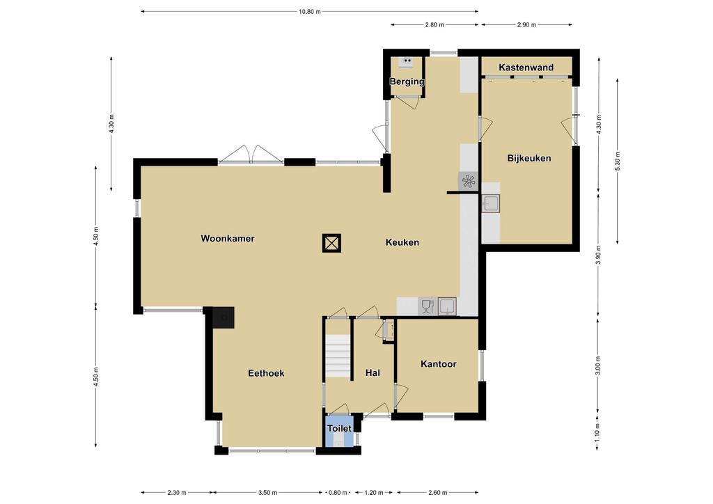 De begane grond telt maar liefst ca. 109m2 en dat zijn niet alleen de woonkamer en de keuken. Aan de voorzijde van de woning is via de hal een werk/studiekamer gelegen. Hier kun je je geheel terugtrekken wanneer je vanuit huis werkt. Maar ook een speelkamer behoort tot de mogelijkheden waarbij je de deur dicht trekt en de boel, de boel laat.