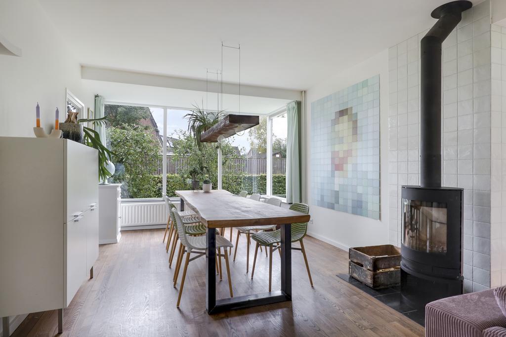 Woonkamer (living) met eethoek, houtkachel en dubbele terrasdeuren