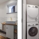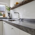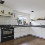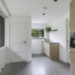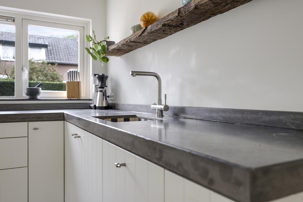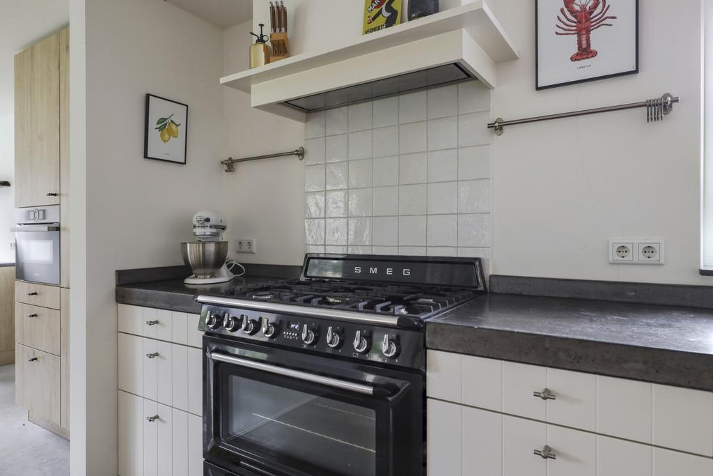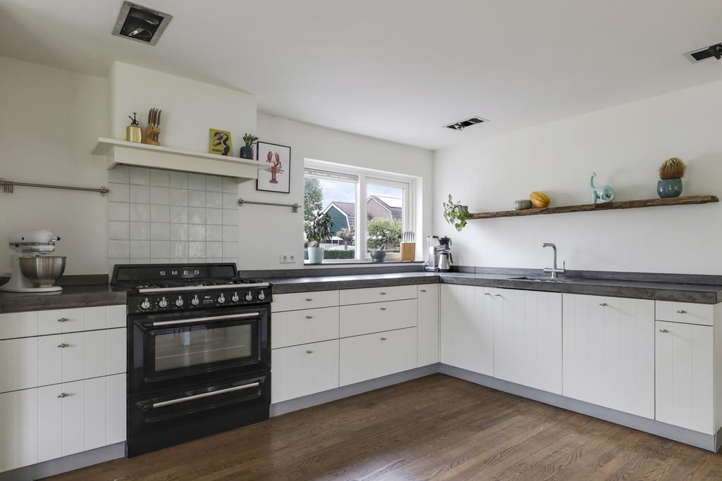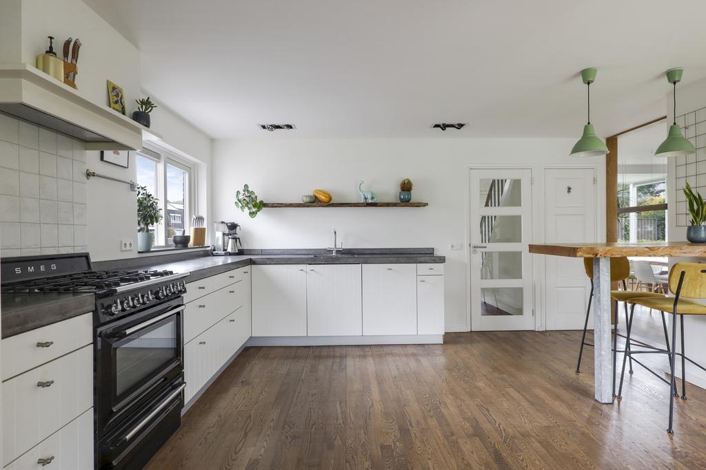 De keuken heeft een bijzonder ruimtelijke beleving waardoor je hier elkaar niet snel in de weg zult staan. De uitgebreide hoekopstelling heeft een werkblad van beton wat voor een robuuste uitstraling zorgt. De gootsteen met zwart/wit gebokte tegeltjes is daarin een echte eye-catcher, net als het 90cm brede SMEG-fornuis met oven. Boven het kookfornuis is een afzuigschouw met kranslijst ingestuct. En uiteraard ontbreekt de vaatwasser niet. En niet te vergeten de waterkraan (Franke) die voor direct kokend water zorgt. Brede ladekorven zorgen voor praktische opbergruimte. In het verlengde van het keukenblok zijn een maximaal grote koelkast en een combi-oven/magnetron ingebouwd (2022).