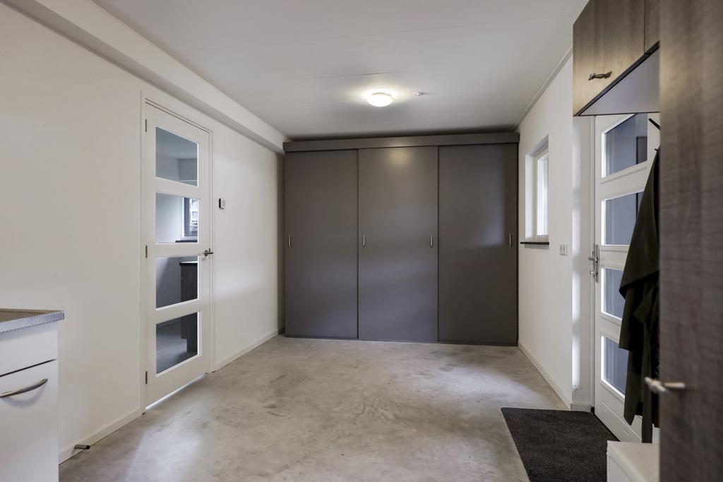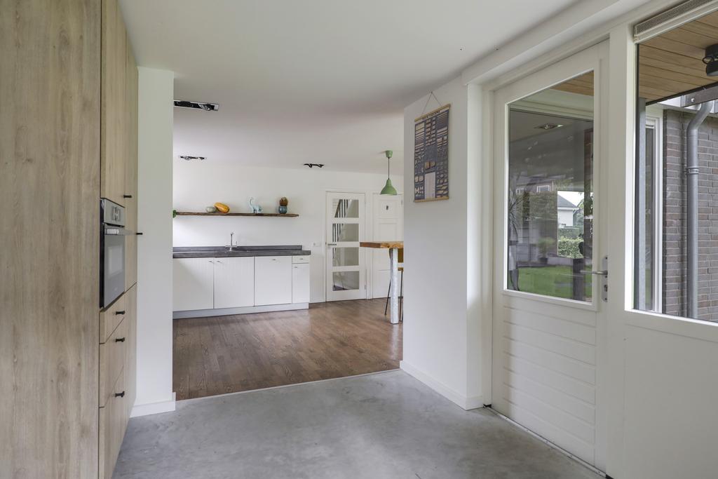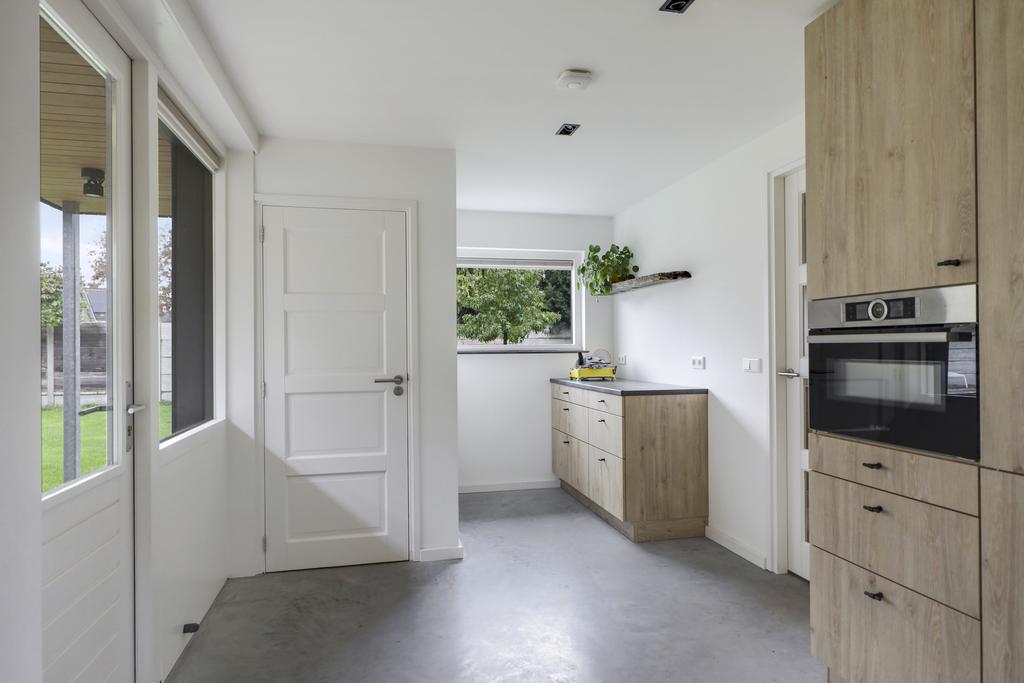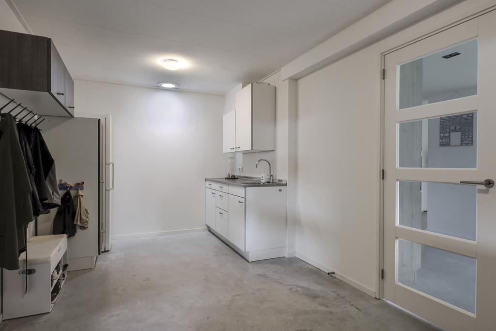 Vanuit de keuken is er een doorloop naar de voormalige garage. Deze ruimte is volledig geïsoleerd en betreft de ideale bijkeuken. Er is een extra keukenblokje met gootsteen geïnstalleerd alsmede een vaste schuif/kastenwand waar je (schoonmaak)spullen, voorraad en de stofzuiger kwijt kunt. Vanuit deze bijkeuken is er een doorloop naar de carport vanwaar je droog naar de schuur en de tuinkamer loopt.