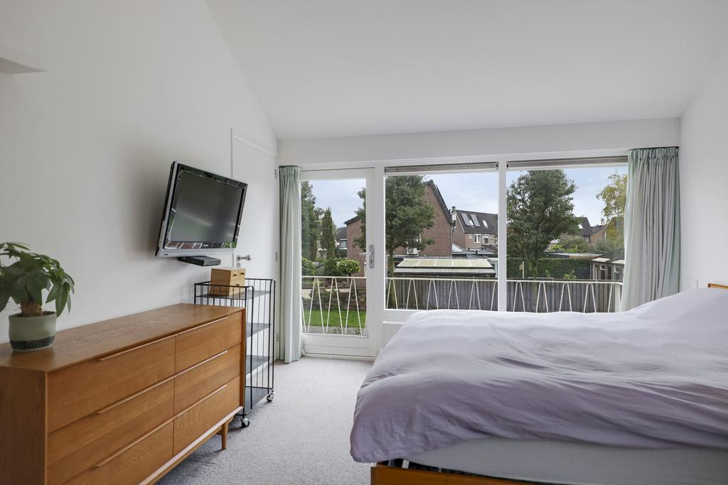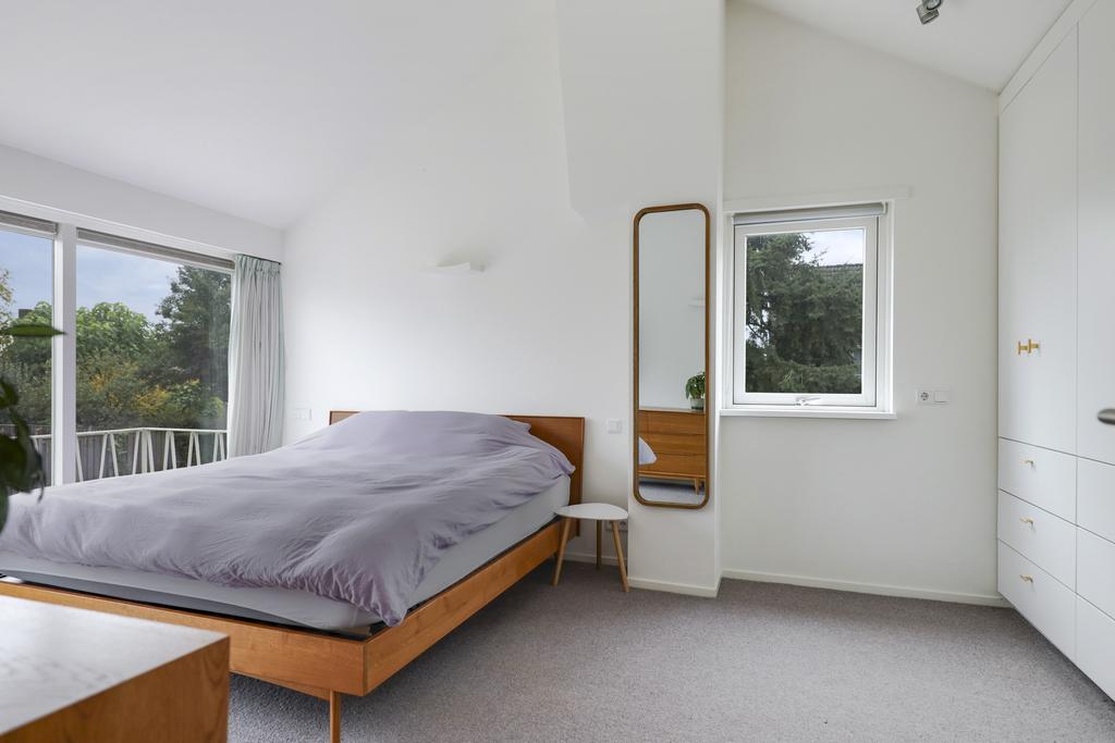 Het zijn stuk voor stuk volwaardige slaapkamers van respectievelijk 17m2, 11m2, 10m2, 10m2 en 7m2 groot. Alle kamers hebben rechte muren waardoor ze optimaal en praktisch in te richten zijn. De grootste kamer is een heuse masterbedroom die een bijzonder, ruimtelijke beleving heeft vanwege het zicht tot in de nok. Overigens ga je dat ruimtelijke gevoel in elke slaapkamer tegen komen wat voor een unieke en speelse beleving zorgt. De masterbedroom is niet alleen onderscheidend vanwege het formaat, maar ook doordat het een vaste, maatwerk kastenwand met hanggedeelte en opberglades heeft. Tevens heeft het een grote glaspui met deur die toegang geeft tot het balkon. Een airconditioning maakt deze ouderslaapkamer compleet.