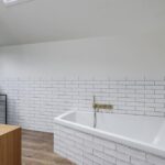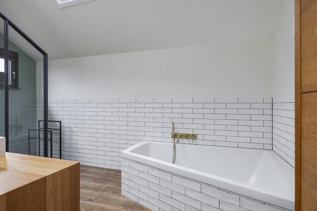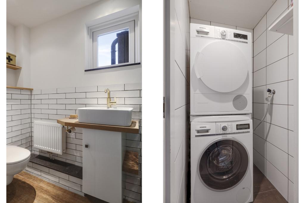 Nadat je onder meer al 5 slaapkamers bent tegengekomen, tref je aan het einde van de verlengde overloop de badkamer aan. Je verwacht niet dat er zoveel ruimte in het ‘achterhuis’ zit en ook in de badkamer zal je verbaasd zijn. Er is dan ook dankbaar gebruik gemaakt van de ruimte met o.a. een groot ‘familieligbad’, een royale inloopdouche met stijlvol zwartstalen glaswand (maatwerk) en een houten wastafelmeubel (maatwerk) met waskom en opberglades. Ook is er een bijbehorende kolomkast aanwezig waar je al je toiletspullen in kwijt kunt. Andere stijlelementen zijn de goudkleurige, in messing uitgevoerde kranen die sierlijk uit de muur komen. Zo ook in de douche waar je zowel een rainshower als een handdouche tegenkomt. Een breed draai/kiepraam en een hoog gelegen dakvenster zorgen niet alleen voor een prettige lichtinval, maar ook voor de ideale ventilatiemogelijkheid. Natuurlijk is de mechanische ventilatie niet vergeten. Koude voeten hoef je hier niet te krijgen aangezien de vloerverwarming hier is doorgetrokken.