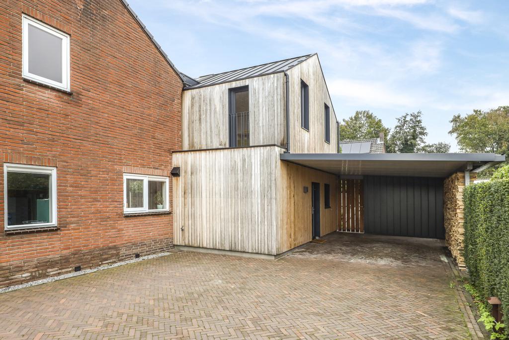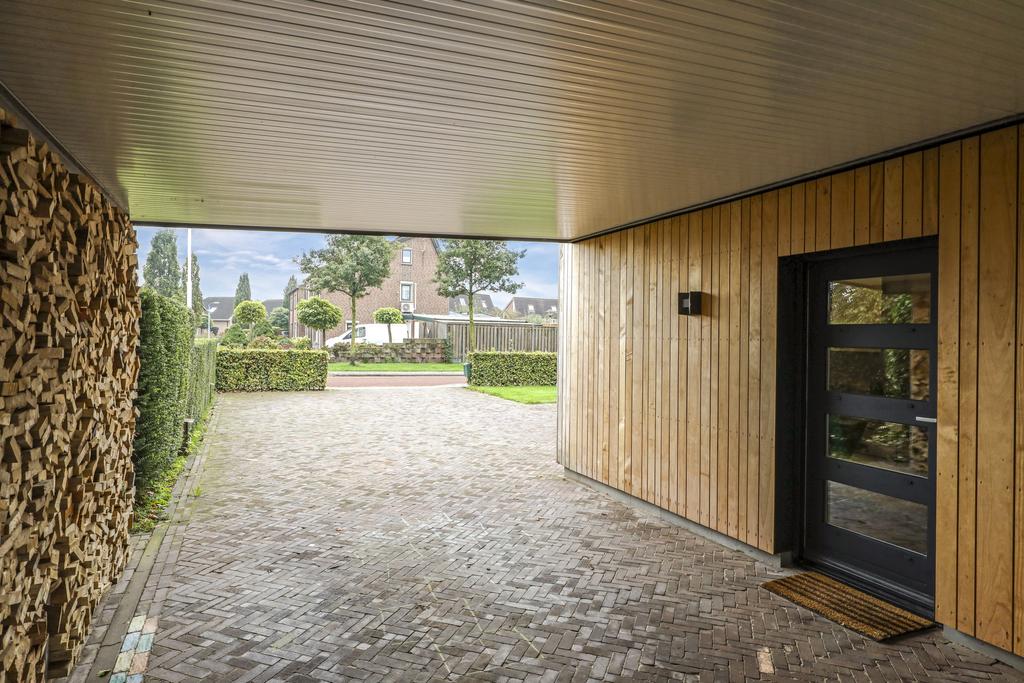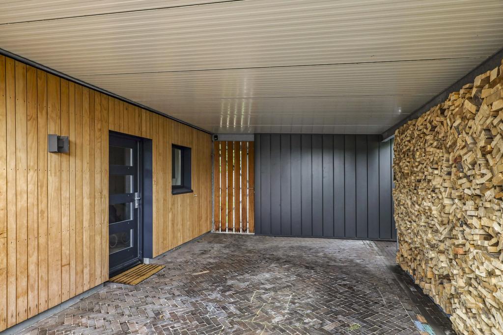 Naast de woning is een zeer comfortabele carport aangebouwd. Deze carport is meer dan 4 meter breed (en 6,5m diep) waardoor je met gemak aan beide kanten kunt uitstappen zonder dat je de deur tegen de muur stoot. Aan de zijkant kun je een voorraad van kachelhout opstappelen wat tegelijkertijd ook voor een leuke aankleding zorgt.