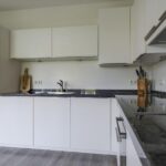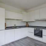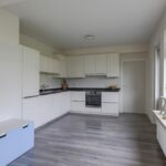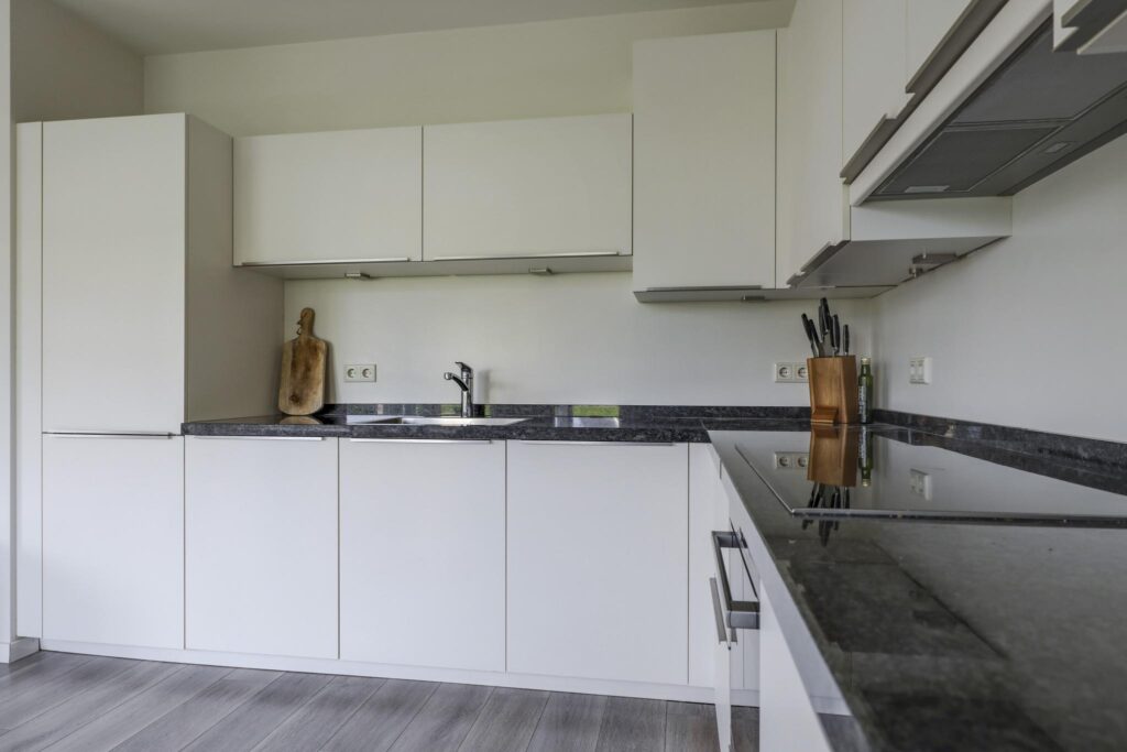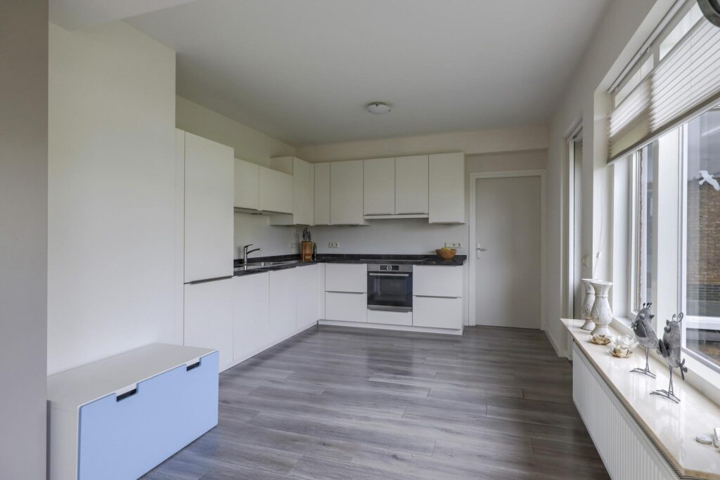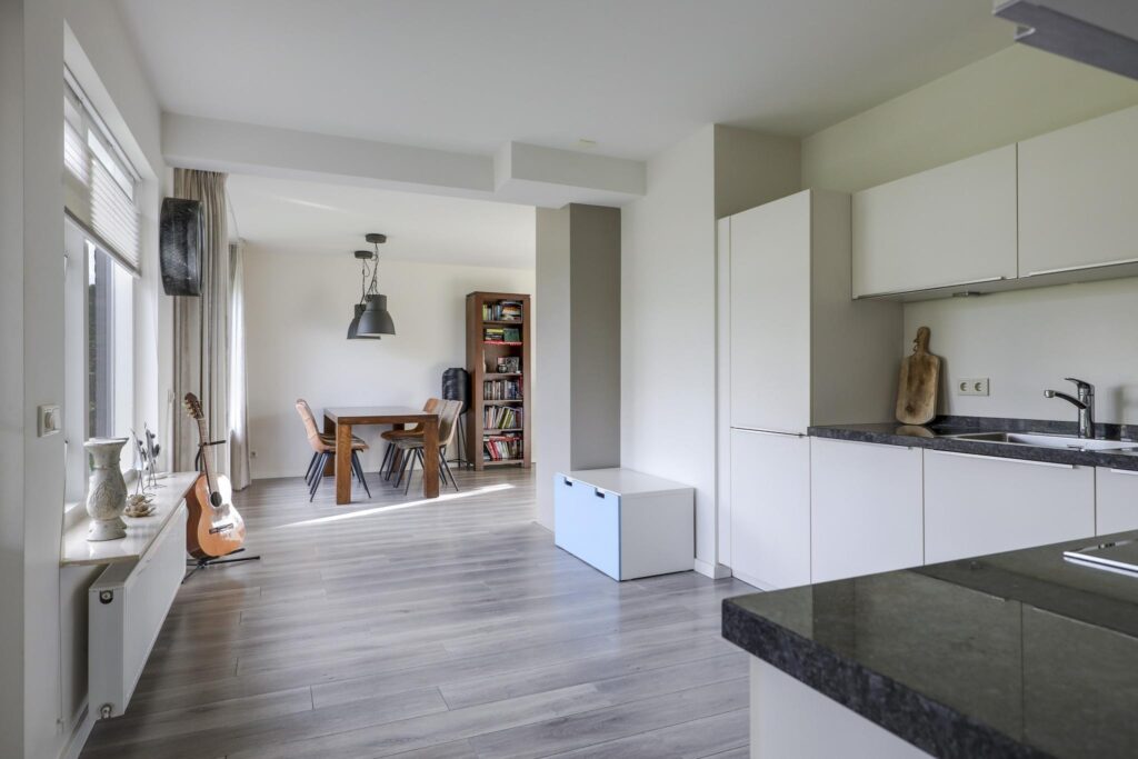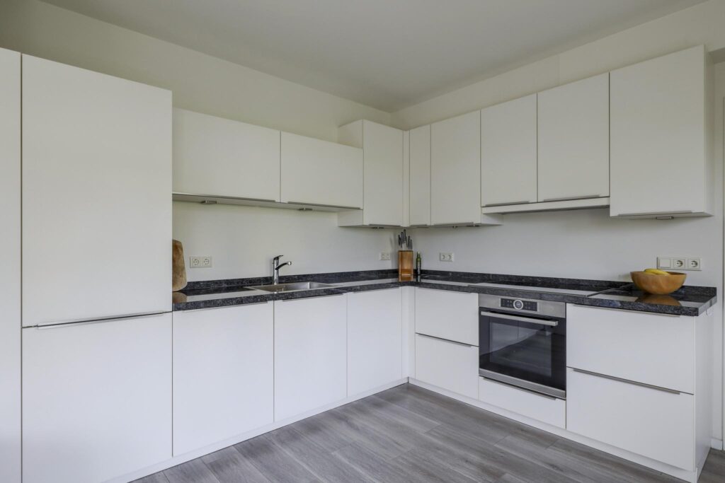Het ruimtelijke gevoel van de woonkamer wordt mede gecreëerd doordat de scheidingsmuur met de keuken is doorgebroken. Hierdoor is er een ‘balzaal’ van een keuken ontstaan. Er is dankbaar gebruik gemaakt van de ruimte door er een uitgebreide hoekopstelling te plaatsen. Witte fronten, een zwart granieten aanrechtblad en strakke grepen geven de keuken een moderne en luxe uitstraling. De inbouwapparatuur bestaat uit een koelkast (maximale hoogte), een vaatwasser, een brede inductie kookplaat, een afzuiger en een grote oven. Er is goed nagedacht over praktische kastruimte. Er is bijvoorbeeld gekozen voor een luxe hoekkast met Le-mans slede die je voor een groot gedeelte uit de kast draait waardoor je de hele hoek optimaal kunt benutten. En uiteraard ontbreekt de spotverlichting niet.